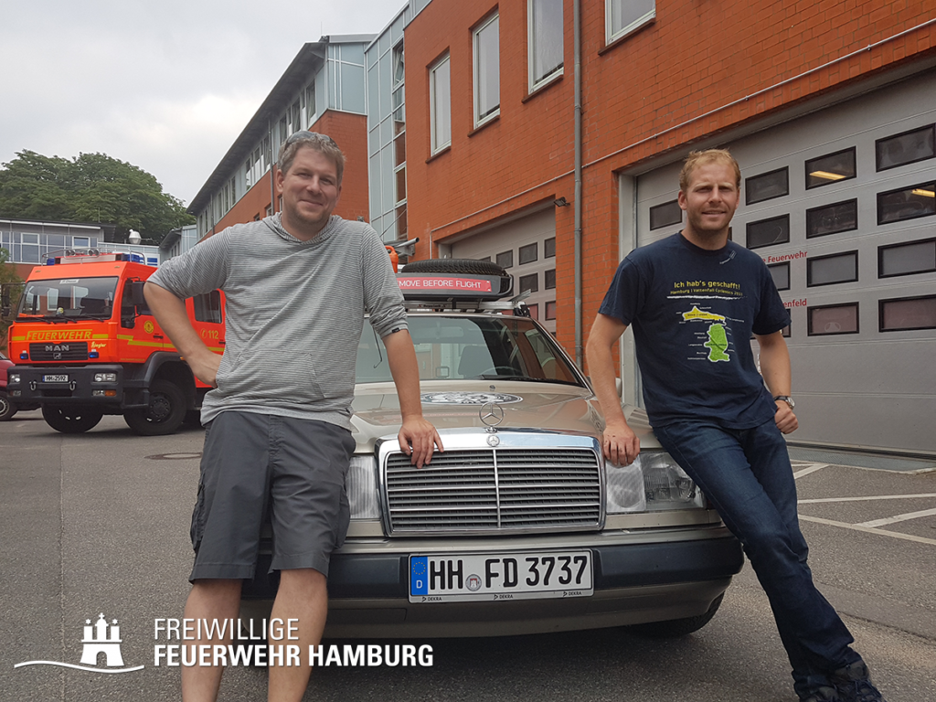 Zwei Kameraden der Freiwilligen Feuerwehr Hamburg stellen sich dieser Herausforderung in einem 25 Jahre alten Mercedes.