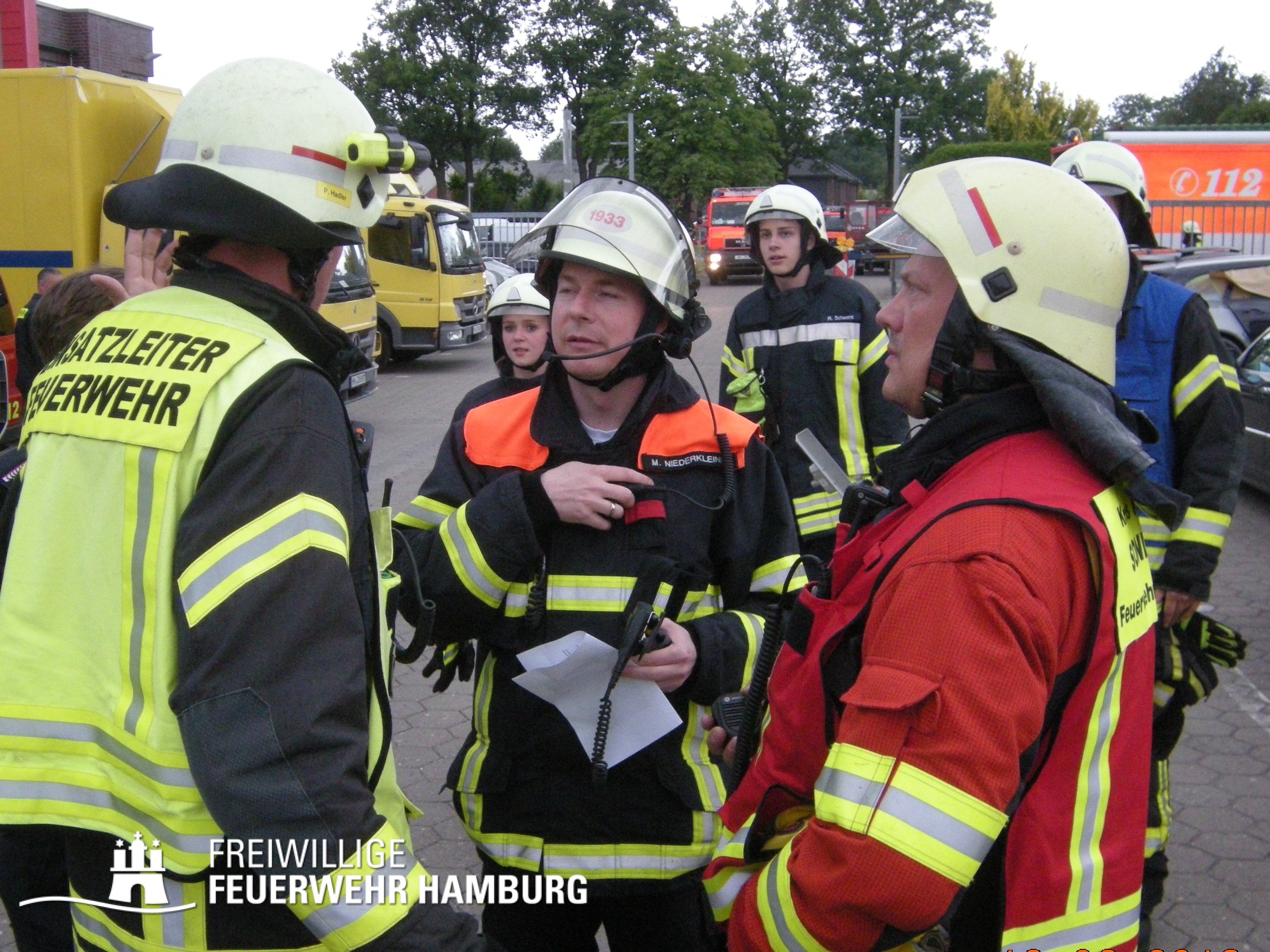 Was war los in einem Industriegebiet in Bönningstedt? Diese Frage stellten sich zahlreiche Bürgerinnen und Bürger. Mehrere Feuerwehrfahrzeuge, aus Bönningstedt und sogar aus Hamburg, waren angerückt. 75 Feuerwehrleute waren im Einsatz. Bei einem Brand in einem Lagerhallenkomplex mit Büros wurden mehrere Personen vermisst. Diese Personen mussten gesucht und dann gerettet werden. Der angenommene Großbrand wurde unter Bildung von Einsatzabschnitten mit mehreren C-Rohren bekämpft.