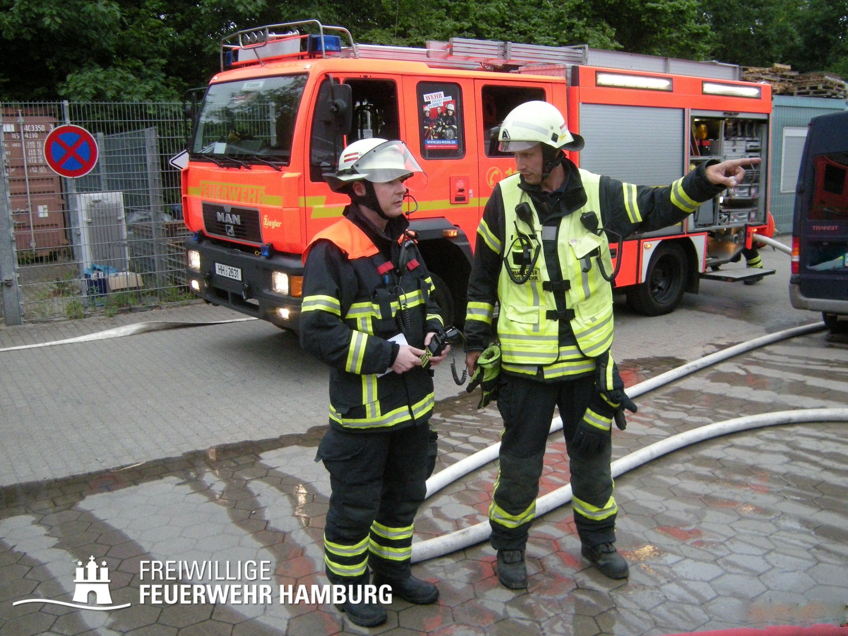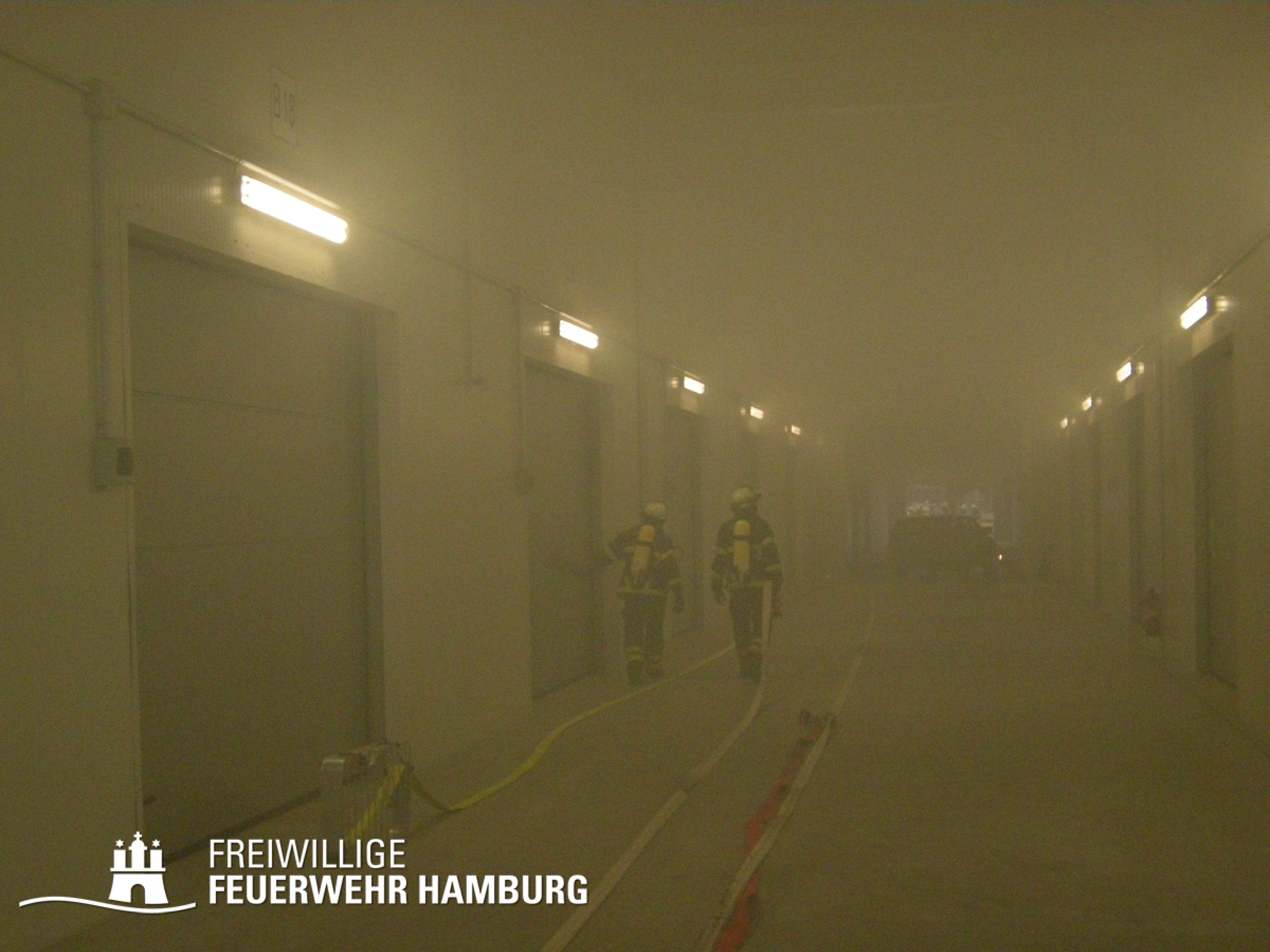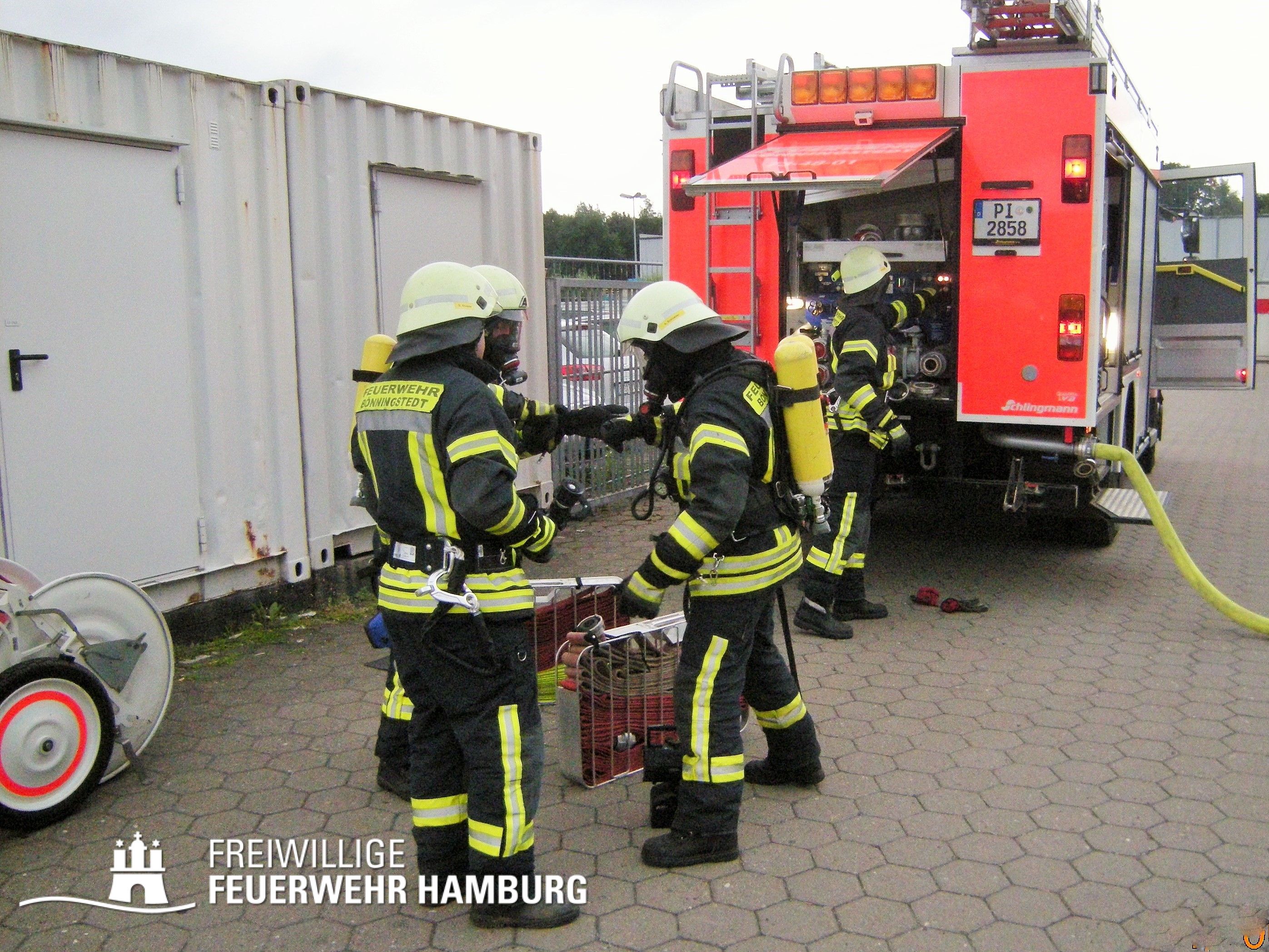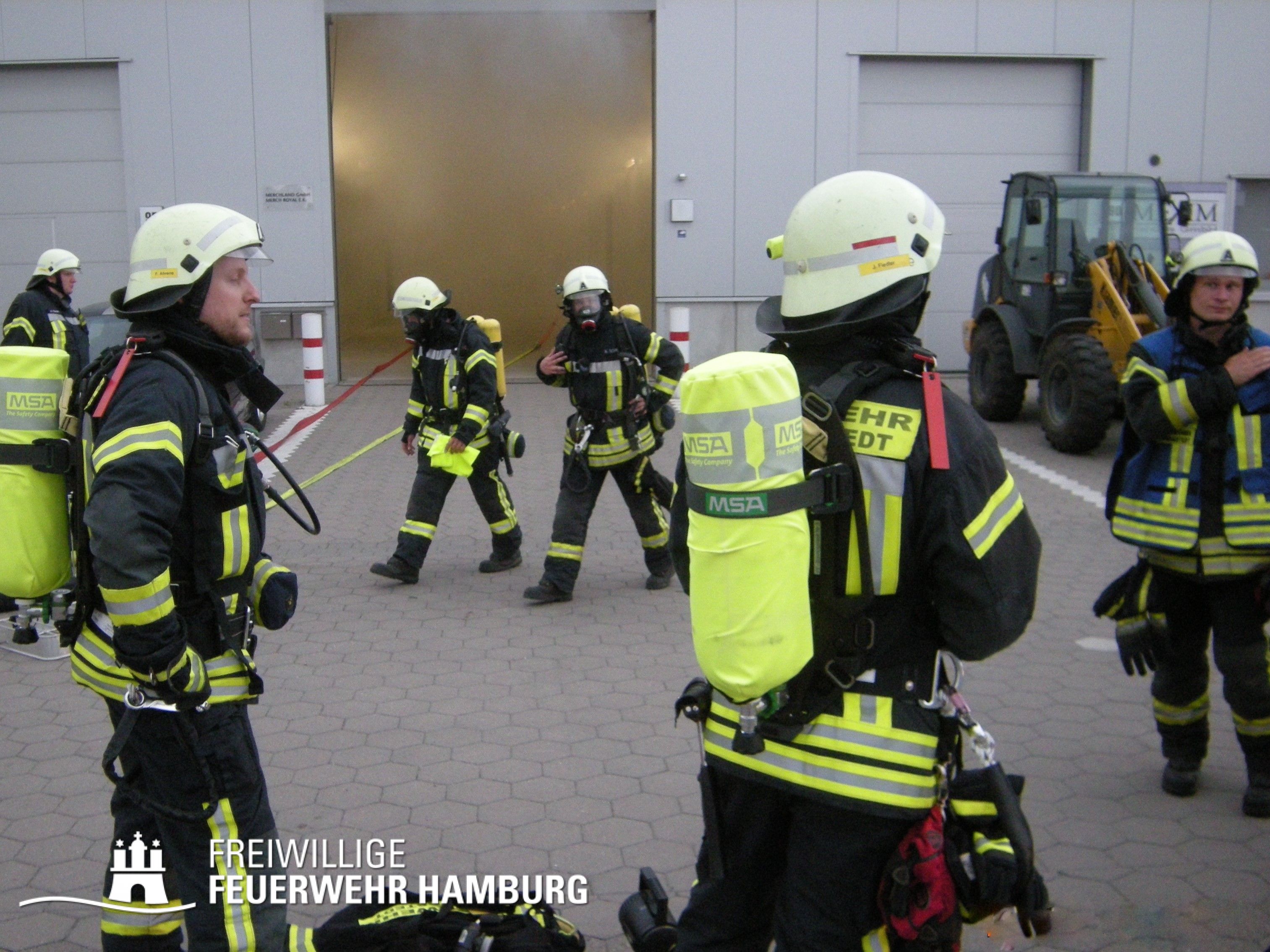 Die Wasserversorgung erfolgte über lange Wegstrecken, unter anderem auch aus einem Löschwasserteich. Auch die Feuerwehrbereitschaft aus dem Kreis Pinneberg rückte mit einem Wechselladerfahrzeug mit Abrollbehälter-Schlauch zur Unterstützung für die schwierige Wasserversorgung an. Die Besetzung dieser Sonderkomponente erfolgte durch Kameraden aus der FF Borstel-Hohenraden unter Leitung von OLM Sven Jehne. Aufgrund der starken Verrauchung in der Lagerhalle mussten zahlreiche Atemschutzgeräte eingesetzt werden. Nach näherem Betrachten war jedoch die Situation schnell geklärt. Es fand eine gemeinsame Übung der Wehren statt.