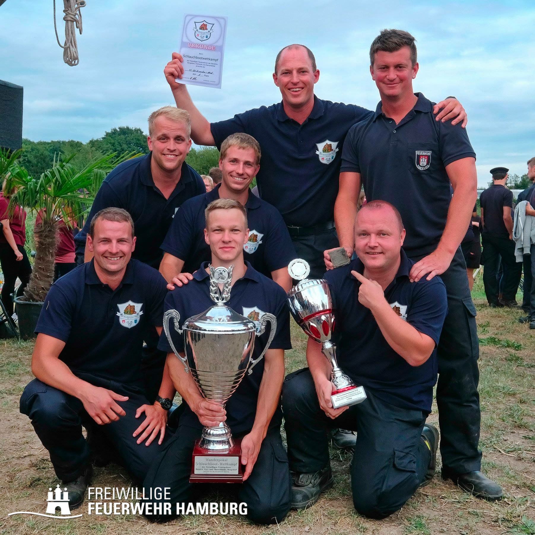 Der Jubel war bei der FF Kirchwerder Nord riesengroß weil der riesige Pokal nun im Bereich Vierlande und bei der FF Kirchwerder Nord nach vorherigen Siegen 2016 und 2017 bleibt.