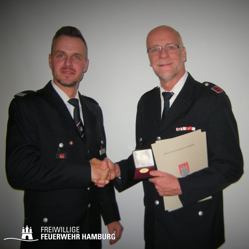 Der Bereichsführer Peter Kleffmann überbrachte die Glückwünsche vom Amtsleiter der Feuerwehr Hamburg und dem Landesbereichsführer. Kamerad Edgar Kaminski wurde mit der “Feuerwehr – Verdienstmedaille der 1.Stufe” im Namen des Präses der Behörde für Inneres, Senator Andy Grote, für sein ehrenamtliches Engagement und seine verdienstvolle Tätigkeit ausgezeichnet.