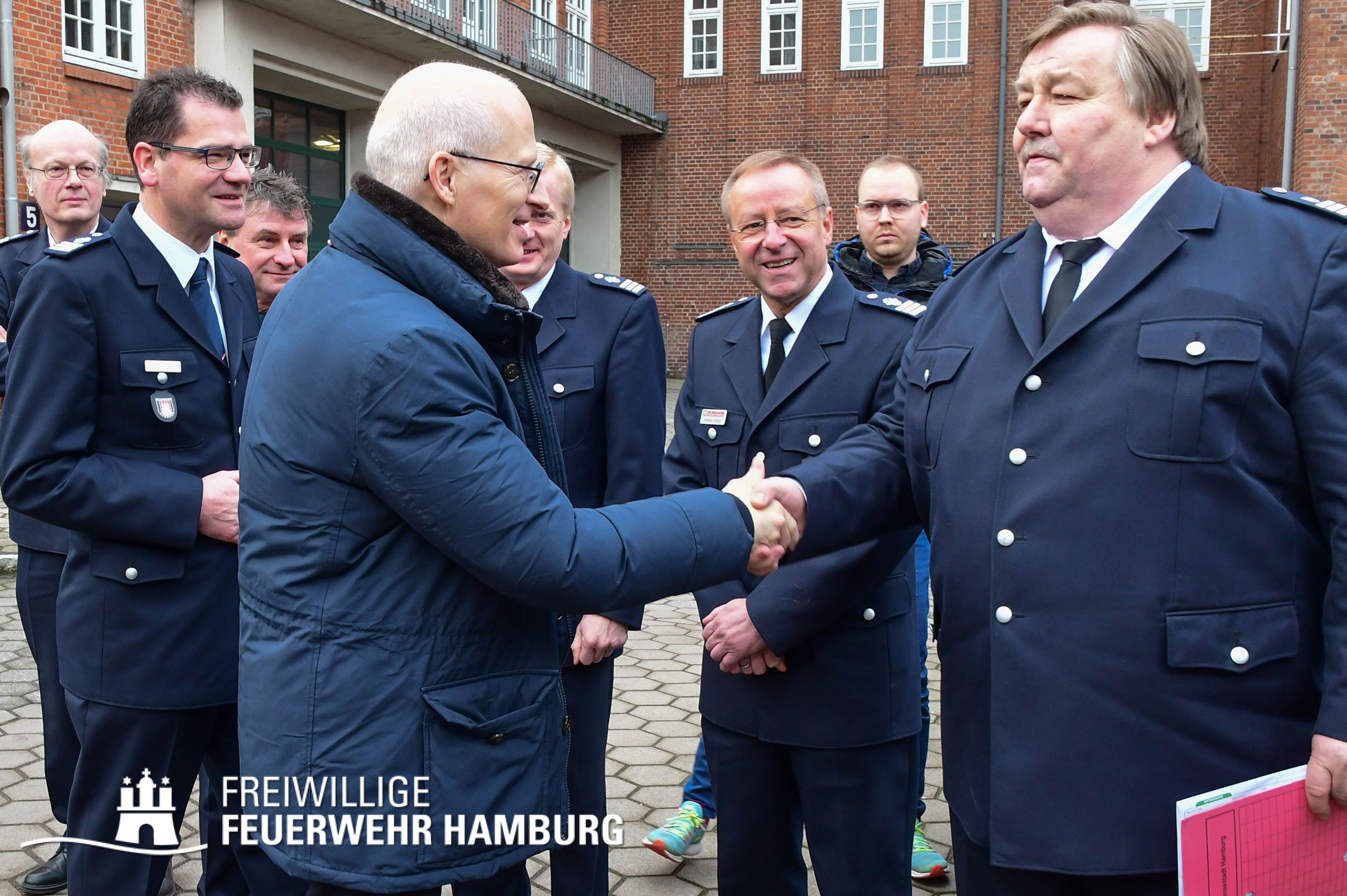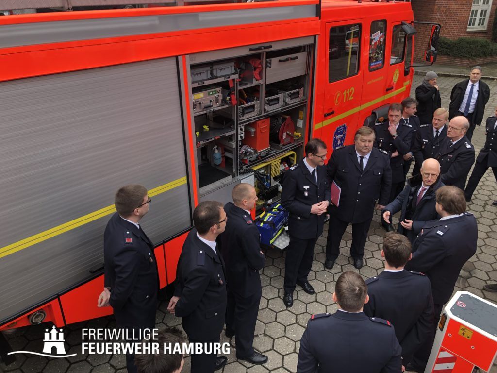 Beim anschließenden Rundgang im Innenhof des Dienstgebäudes warteten die Kameraden der Freiwilligen Feuerwehr Duvenstedt auf den Ehrengast, um ihr Löschfahrzeug – und hier vor allem die Einsatzmittel für die Erstversorgung der Wehr – zu zeigen. Bei diesem Thema fanden die Kameraden in Bürgermeister Dr. Tschentscher aufgrund seiner beruflichen Vorbildung einen fachlich versierten Gesprächspartner, der sich in dem Fachgespräch aufgeschlossen über den rettungsdienstlichen Aufgabenbereich der Freiwilligen Feuerwehren Hamburgs erkundigte.