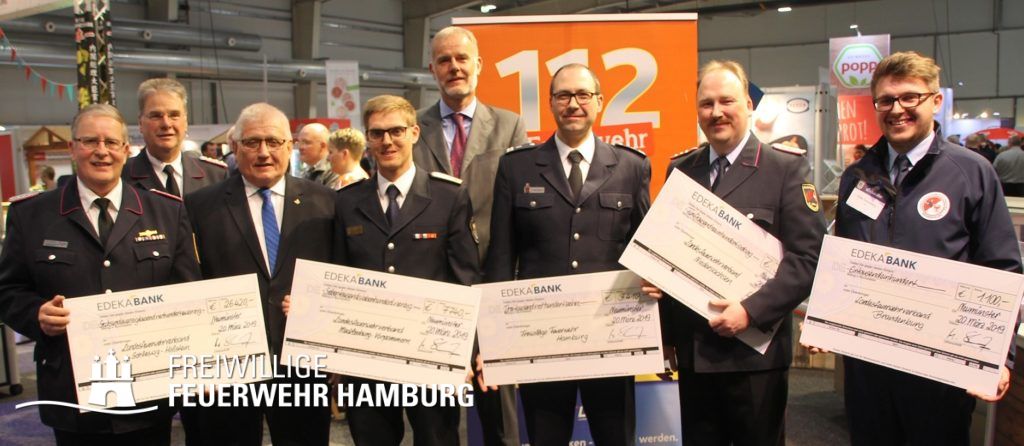 Am Mittwoch, den 20. März 2019, nahmen die Vertreter der norddeutschen Landesfeuerwehrverbände auf der internen EDEKA Nord Frühjahrsmesse, in den Holstenhallen Neumünster, Schecks im Gesamtwert von 44.640 Euro aus den Händen von Martin Steinmetz (Geschäftsführer EDEKA Nord) und Stephan Weber (Geschäftsführer Fleischwerk EDEKA Nord), im Beisein von Landtagspräsident des Landtages Schleswig-Holstein Klaus Schie, der als Schirmherr für die EDEKA-Mettwurstaktion fungierte, entgegen.