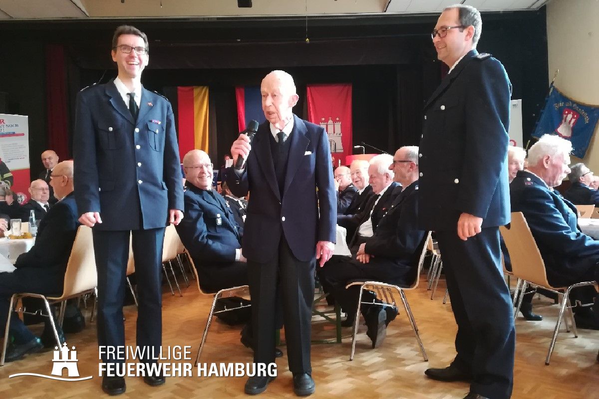 Nachdem die Anwesenden auf den neuesten Stand der Dinge gebracht wurden, widmete man sich den drei ältesten anwesenden Teilnehmern aus der Ehrenabteilung. Diese erhielten ein kleines traditionelles Präsent der Landesbereichsführung, überreicht durch Landesjugendfeuerwehrwart Kai Winter. Im Gegenzug wurde das Publikum mit einer beeindruckenden lyrischen Performance durch den ältesten Kameraden (98 Jahre) belohnt.
