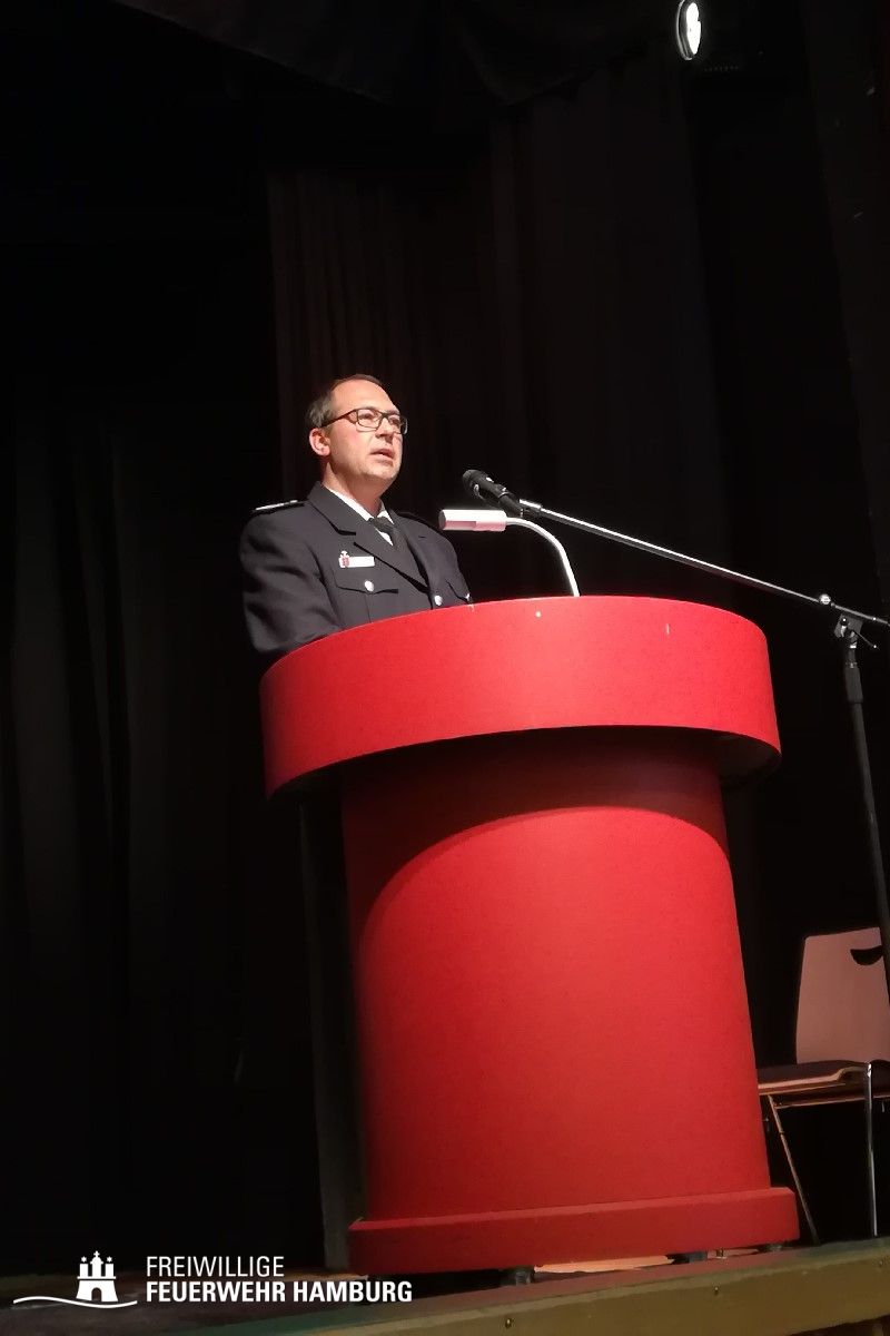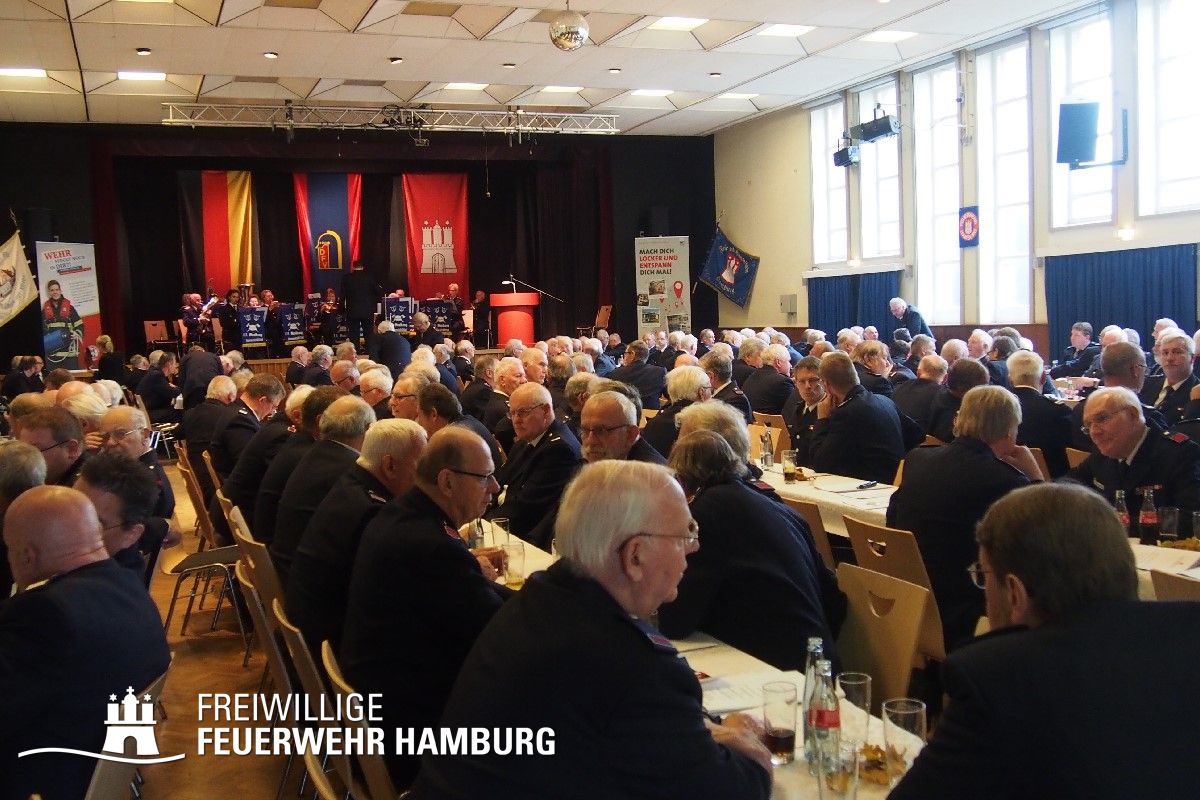 Rund 370 Gäste, unter denen neben den Ehrenmitgliedern auch zahlreiche Bereichs- und Wehrführer vertreten waren, fanden im Saal des Volkshauses Platz, welcher nach Aussage des ehemaligen Landesbereichsführers André Wronski mal ein Kino gewesen sei. Zu Beginn der Veranstaltung sprach Pastorin Erneli Martens dem Publikum mit einer Andacht zum Gedenken der im vergangenen Jahr verstorbenen Kameraden zu.