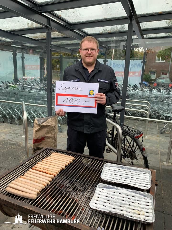 Anlässlich der Wiedereröffnung der Lidl Filiale an der Poppenbütteler Chaussee 35 haben die Kameraden der FF Duvenstedt ab 10 Uhr Würstchen gegrillt, die Lidl kostenfrei zur Verfügung stellte. Der Erlös wurde dem Förderverein der FF Duvenstedt gespendet.