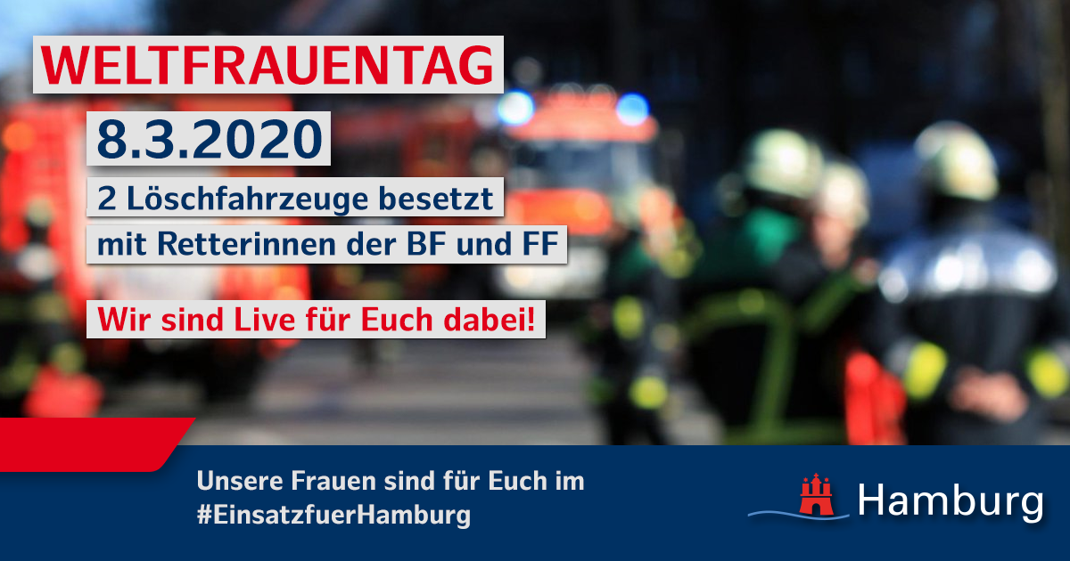 Zum 1. Mal in der Geschichte der Feuerwehr Hamburg werden am Sonntag den 8.3.2020 zwei Löschfahrzeuge ausschließlich von Frauen besetzt im Einsatzdienst eingesetzt. Die Berufsfeuerwehr und die Freiwillige Feuerwehr stellen an der Feuer- und Rettungswache Berliner Tor (F-22) je ein Fahrzeug samt Besatzung und werden von dort aus ihre Einsatzbereitschaft wahrnehmen.