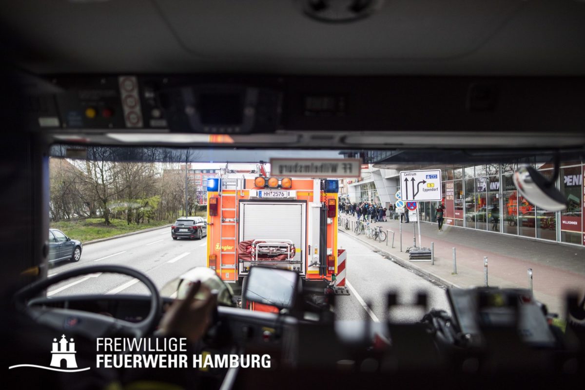 Der 1. Alarm des Tages. Zusammen mit der Löschgruppe 22 fahren beide HLFs des Weltfrauentags zu einer ausgelösten Brandmeldeanlage im Mundsburg Center.
