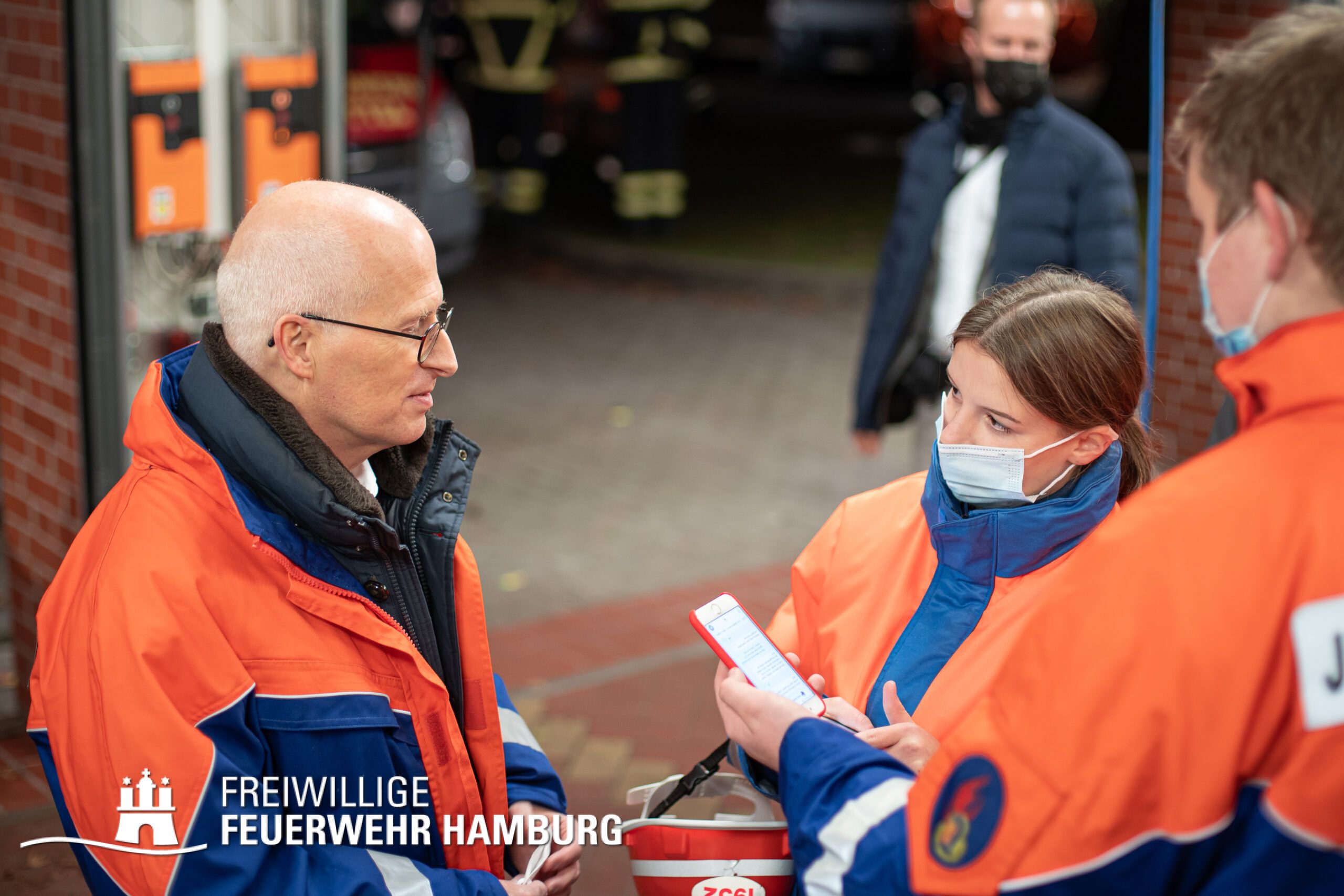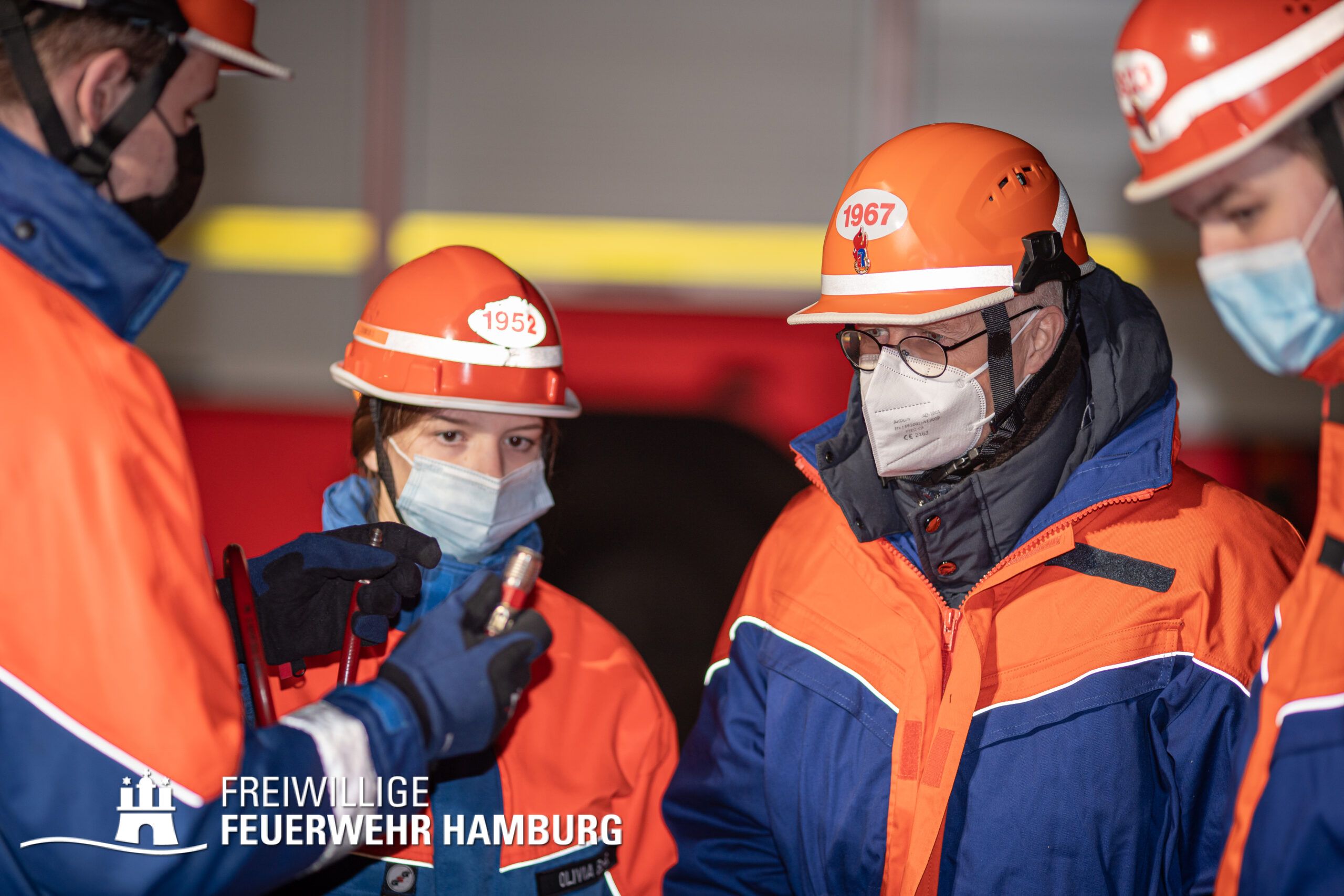 Im Rahmen einer Stationsausbildung gewann er einen Einblick in die vielfältigen Facetten der Feuerwehr – sowie unserer erfolgreichen Jugendarbeit. Durch den Abend führten ihn die Landesjugendsprecher unserer Jugendfeuerwehr mit großer Begeisterung und standen ihm Rede und Antwort. Während seines Besuches nahm sich Bürgermeister Dr. Tschentscher auch den Fragen unserer Mitglieder an und bedankte sich für das ehrenamtliche Engagement der Jugendfeuerwehren sowie der Freiwilligen Feuerwehren Hamburgs.