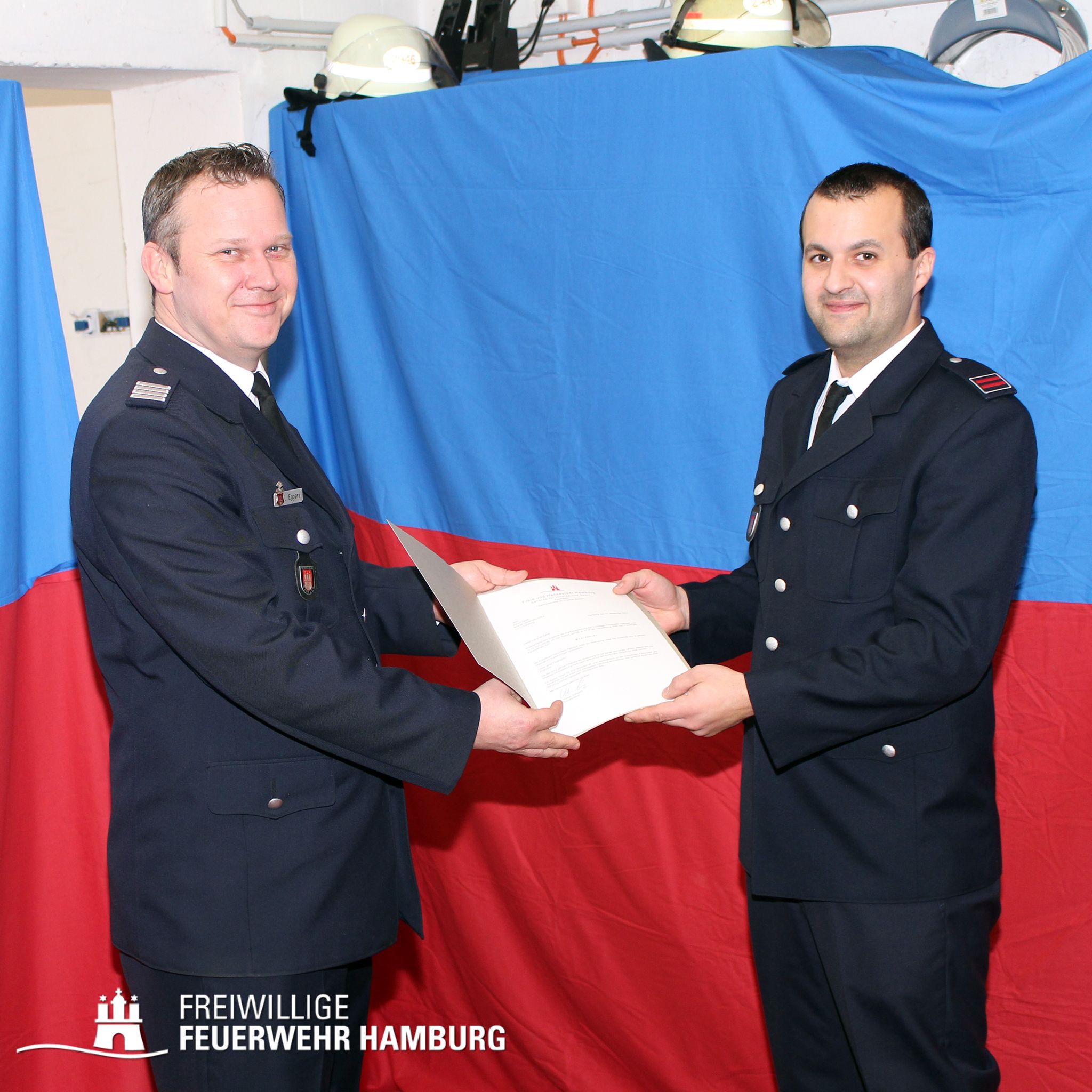 BERF Lars Eggers übergibt Steven Zabel die Ernennungsurkunde zum WF der FF Öjendorf