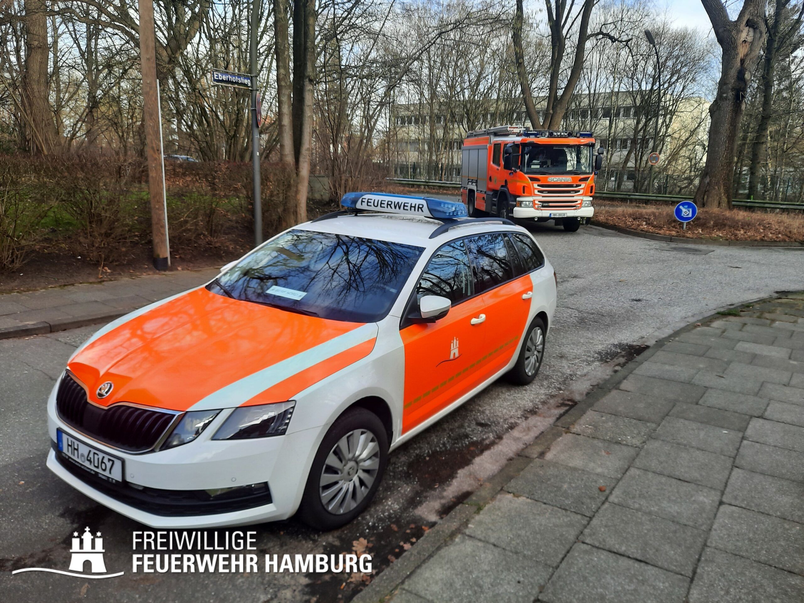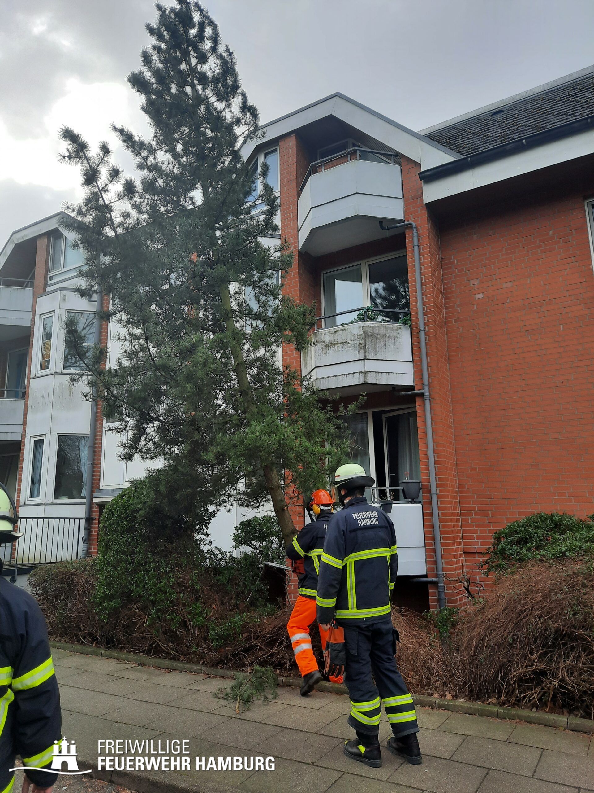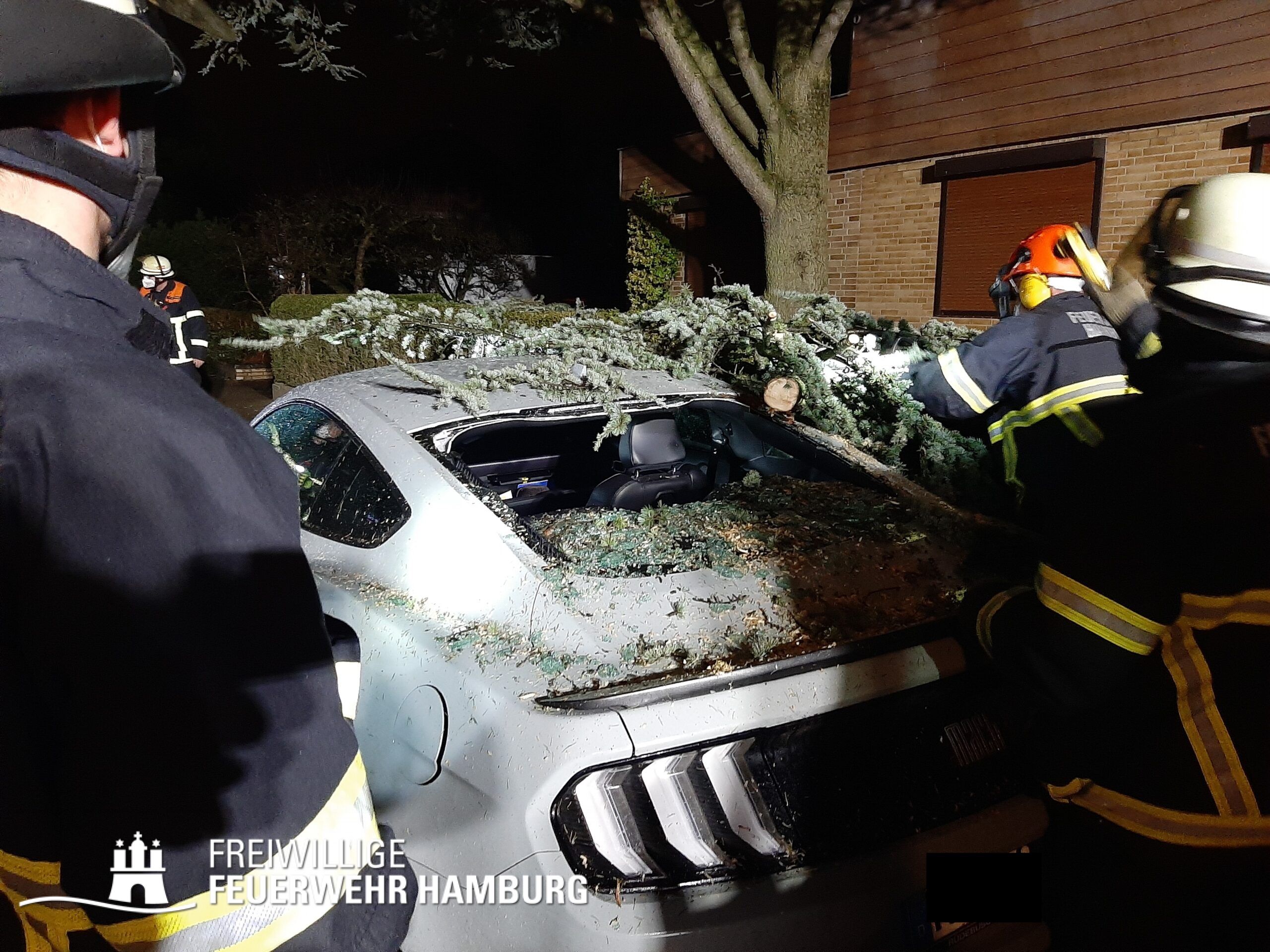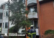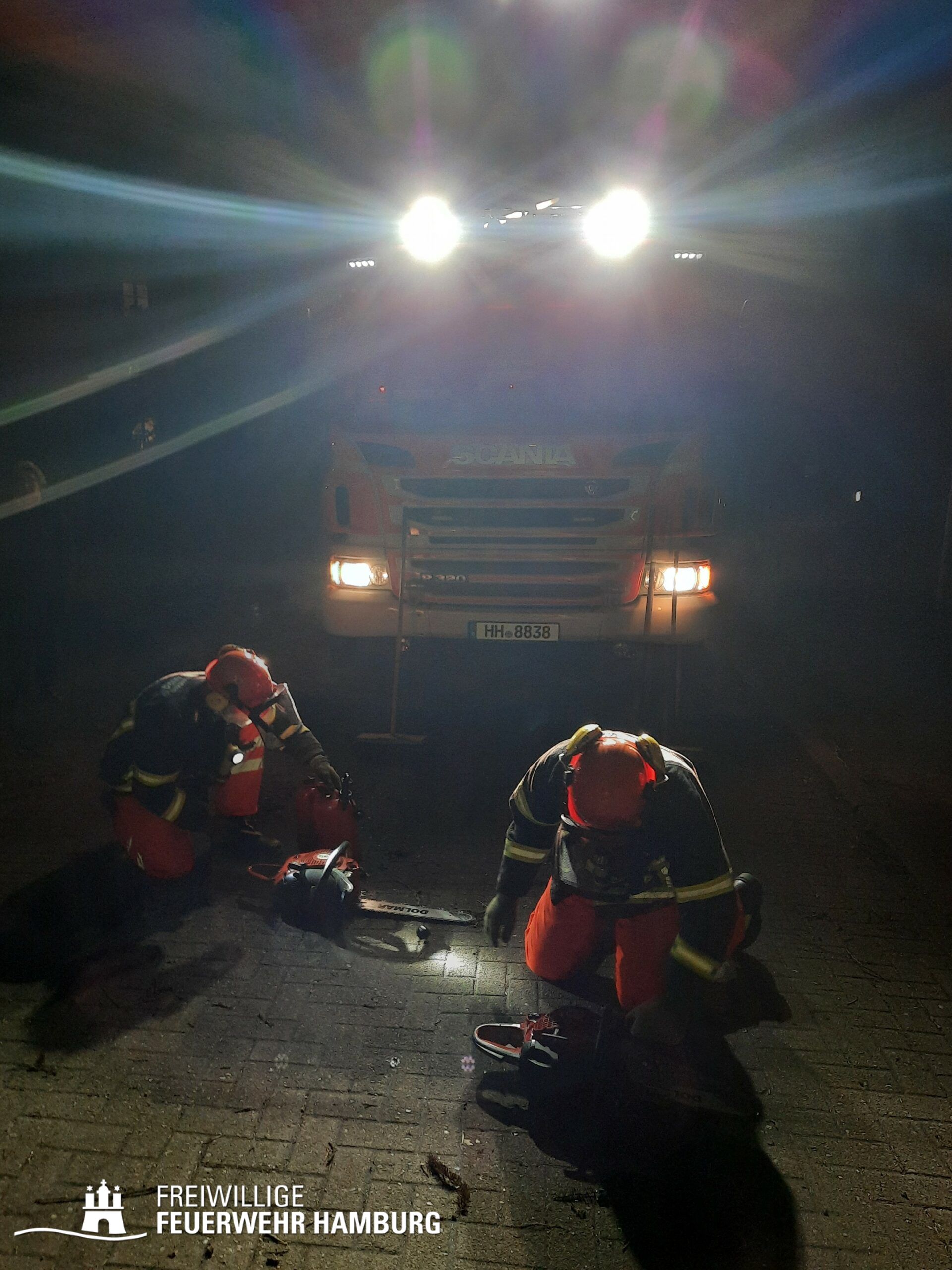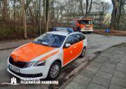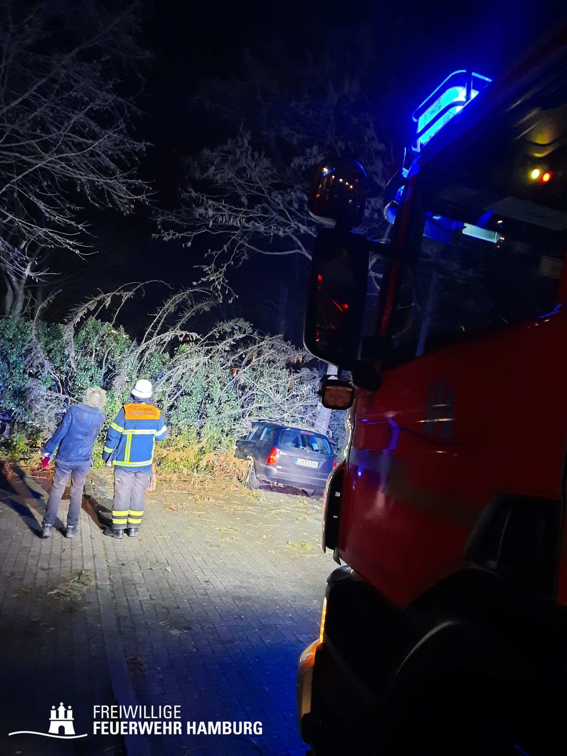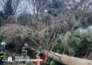 Das Sturmtief Nadia traf am Samstag gegen 17 Uhr auf Hamburg und sorgte für reichlich Schäden und Verkehrschaos durch umgestürzte Bäume und andere Gegenstände. Auch eine Sturmflut rollte auf Hamburg zu, welche ebenfalls für einige Einsätze sorgte. Bei den meisten Einsätzen handelte es sich um umgestürzte Bäume oder abgebrochene Äste, welche sich auf Straßen, Fahrzeugen, Häusern oder Bahnstrecken befanden. Es gab diverse größere Lagen bei denen Bereichsführer und die Sonderkomponenten Schwere Technische Hilfeleistung mit ihren Spezialfahrzeugen und die Ortswehren mit ihren GW-R1 oder RW 1 angefordert wurden. Im Bereich Bergedorf und Hausbruch kam es zu Störungen im Bahnverkehr durch umgestürzte Bäume auf Bahngleisen. Am Anleger Teufelsbrück ließ sich ein Flutschutztor nicht schließen, gemeinsam mit dem THW bereitete man sich auf einen Sandsack-Einsatz vor, welcher zum Glück nicht nötig war, da es der Feuerwehr schlussendlich doch gelang das Tor zu schließen. Eine sehr schwierige Lage entwickelte sich an der Freihafen Brücke. Dort verkeilte sich eine Schute mit Bagger unter der Brücke. Hier waren einige Kleinboote der Freiwilligen Feuerwehr eingesetzt, da sich auch noch zwei Personen auf dem Boot befanden welche gerettet werden konnten. Kurz nach Mitternacht meldeten Anrufer diverse PKWs im Wasser in der Hafencity, da die Lichter der Fahrzeuge leuchteten, ging man von Personen in den Fahrzeugen aus, sodass mehr Einsatzkräfte inklusive Taucher an die Einsatzstelle alarmiert wurden. Glücklicherweise bestätigte sich der Verdacht nicht. Auch zu gelösten Baugerüsten wurden einige Wehren alarmiert, wie zum Beispiel in Steilshoop. Hier flogen mehrere Bau- und Gerüstteile vom Dach eines 8-geschossigem Mehrfamilienhauses. Im Verlauf des Sonntages kam es zu weiteren schweren Sturmboen, bei denen die Wehren wieder gefordert waren. Es kam ebenfalls zu einem erhöhten Einsatzaufkommen mit umgestürzten Bäumen und Schäden an Dächern.