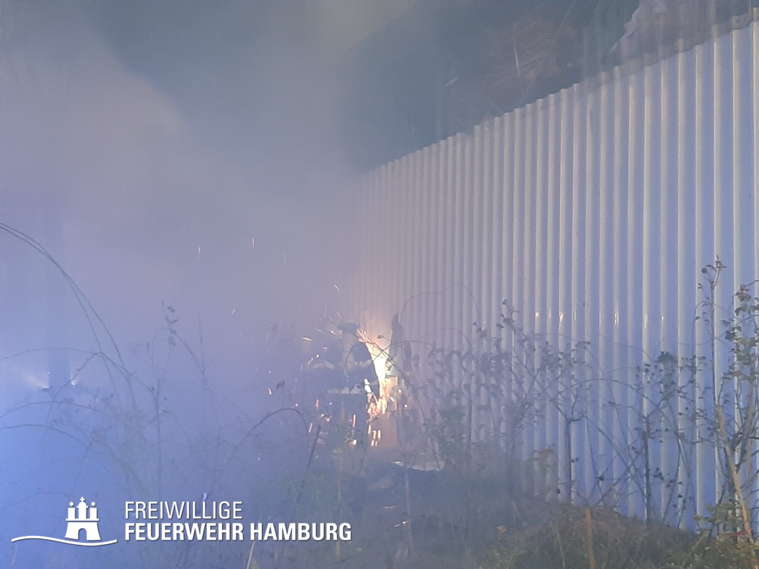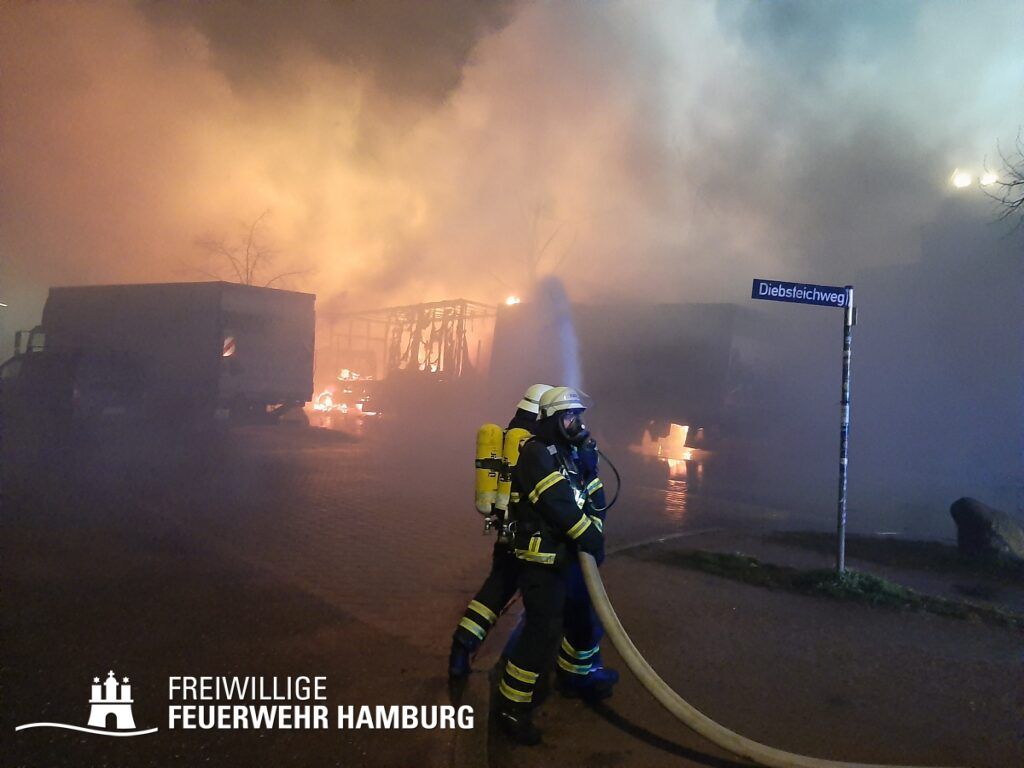 Vor Eintreffen der ersten Einsatzkräfte war bereits aufgrund der Meldebilder von Anrufern durch die Feuerwehr- und Rettungsleitstelle die 2. Alarmstufe ausgelöst worden, was bei Ankunft der FF Ottensen-Bahrenfeld und der BF Stellingen umgehend bestätigt wurde. Unter starker Rauchentwicklung brannten auf ca. 1.000m² Fläche ein Außenlager mit Paletten und Gitterboxen mit verschiedenen Stückgütern sowie Teile einer Lagerhalle. Die umliegenden Gebäude, darunter weitere Lagerhallen, aber auch eine kleine Wohnbebauung, waren durch die sehr enge und im Laufe der Jahrzehnte gewachsene verschachtelte Bebauung in akuter Gefahr.