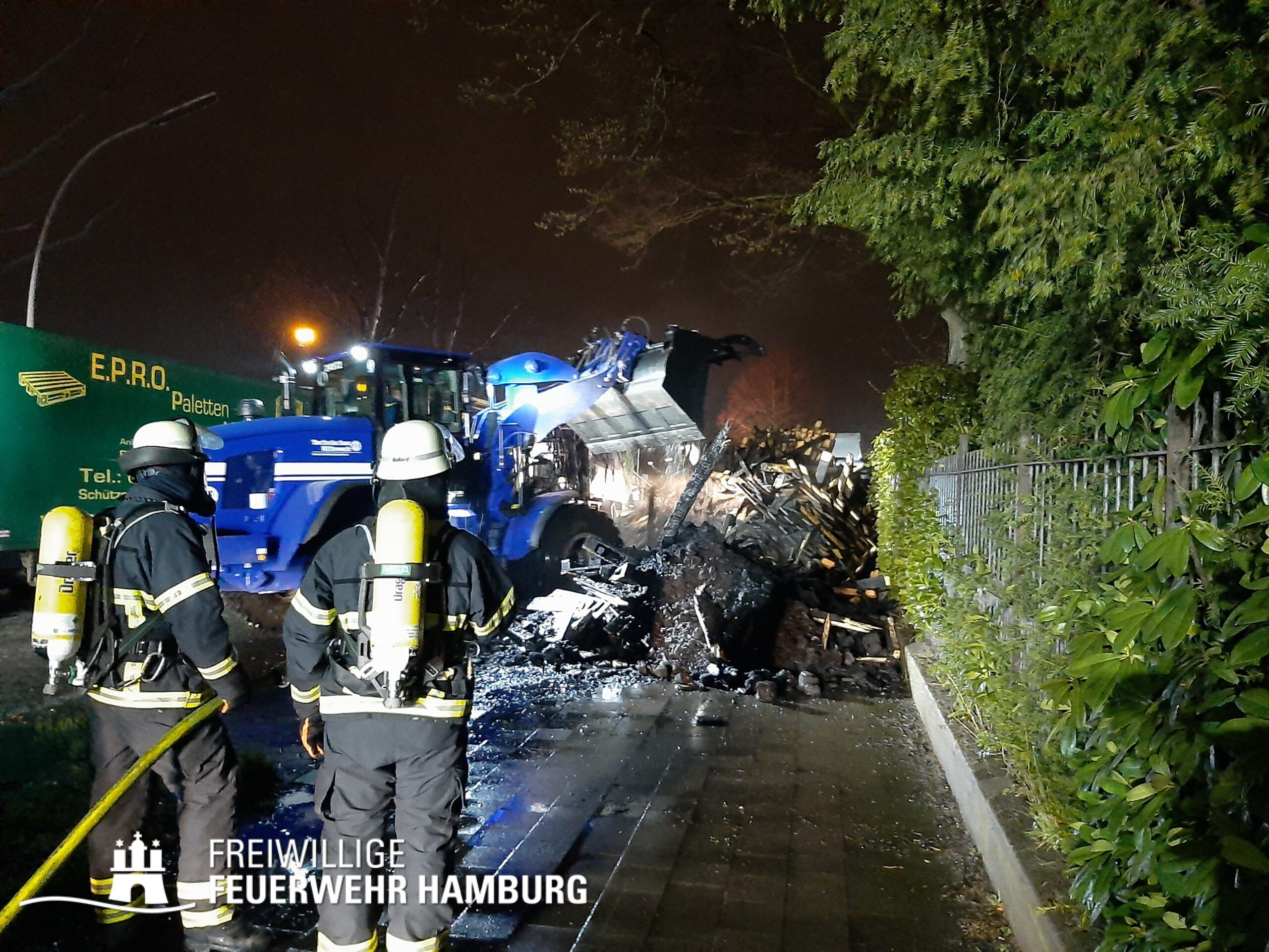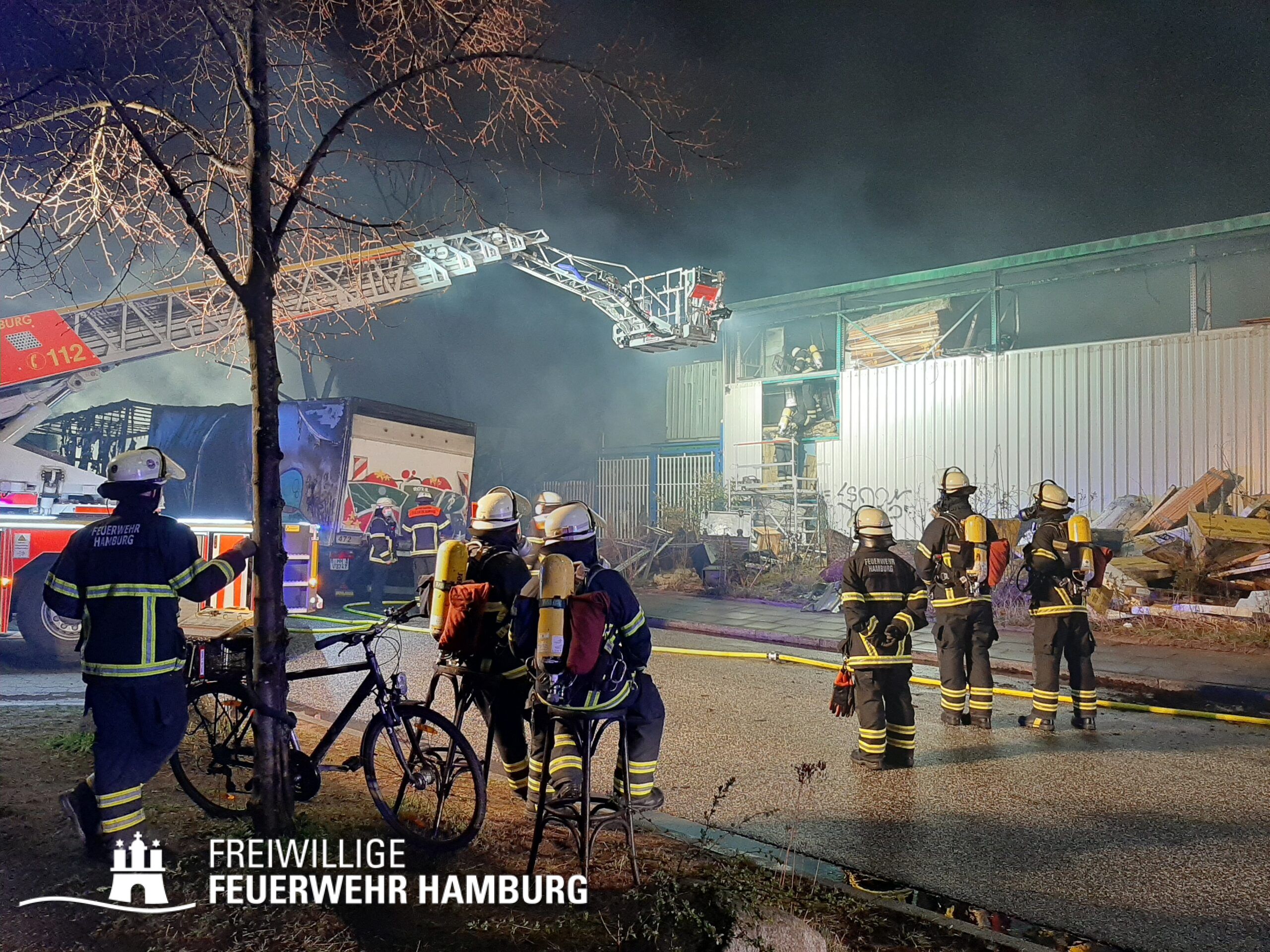 Die Wehren Ottensen-Bahrenfeld (1. Alarm) und Stellingen (2. Alarm) sowie später als Verstärkungen die FF Groß-Flottbek und Pöseldorf wurden zur direkten Brandbekämpfung eingesetzt. Im Rahmen der Ablösungen und für die umfangreichen Nachlösch- und Aufräumarbeiten kamen weiterhin die FF Osdorf, Lurup und Eimsbüttel zum Einsatz, u.a. um die vom THW aus dem Brandobjekt beförderten Trümmer abzulöschen. Die meterhoch gestapelten Paletten und Gitterboxen auf der Freifläche waren im Verlauf des Brandereignisses zusmmengestürzt.