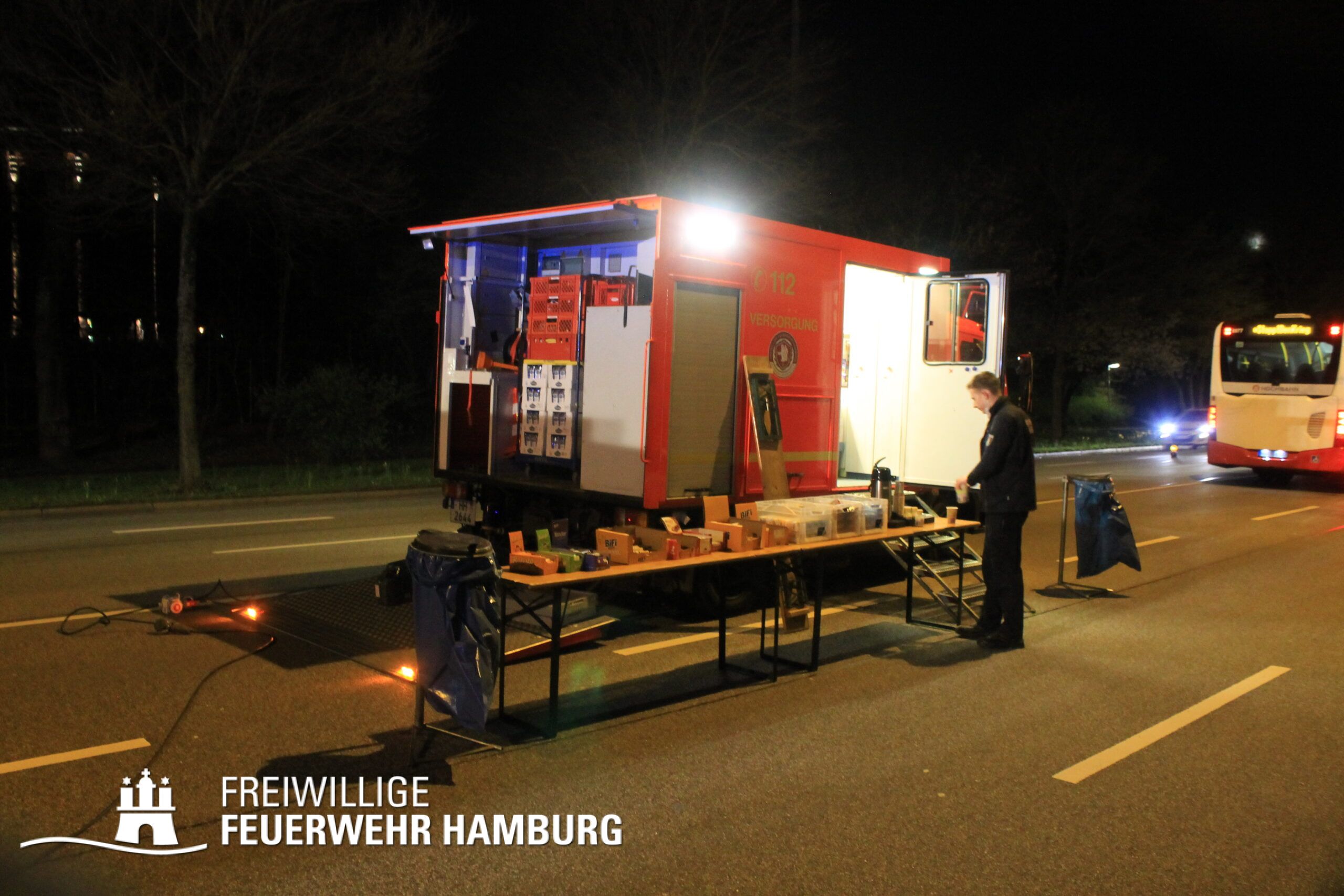 Damit die Einsatzkräfte bei den anstrengenden Lösch- und Aufräumarbeiten sowie dem Aufnehmen des Daches mit Kaltgetränken und Snacks versorgt werden konnten, baute die FF Ottensen-Bahrenfeld eine Verpflegungsstelle mit dem GW-Versorgung auf.