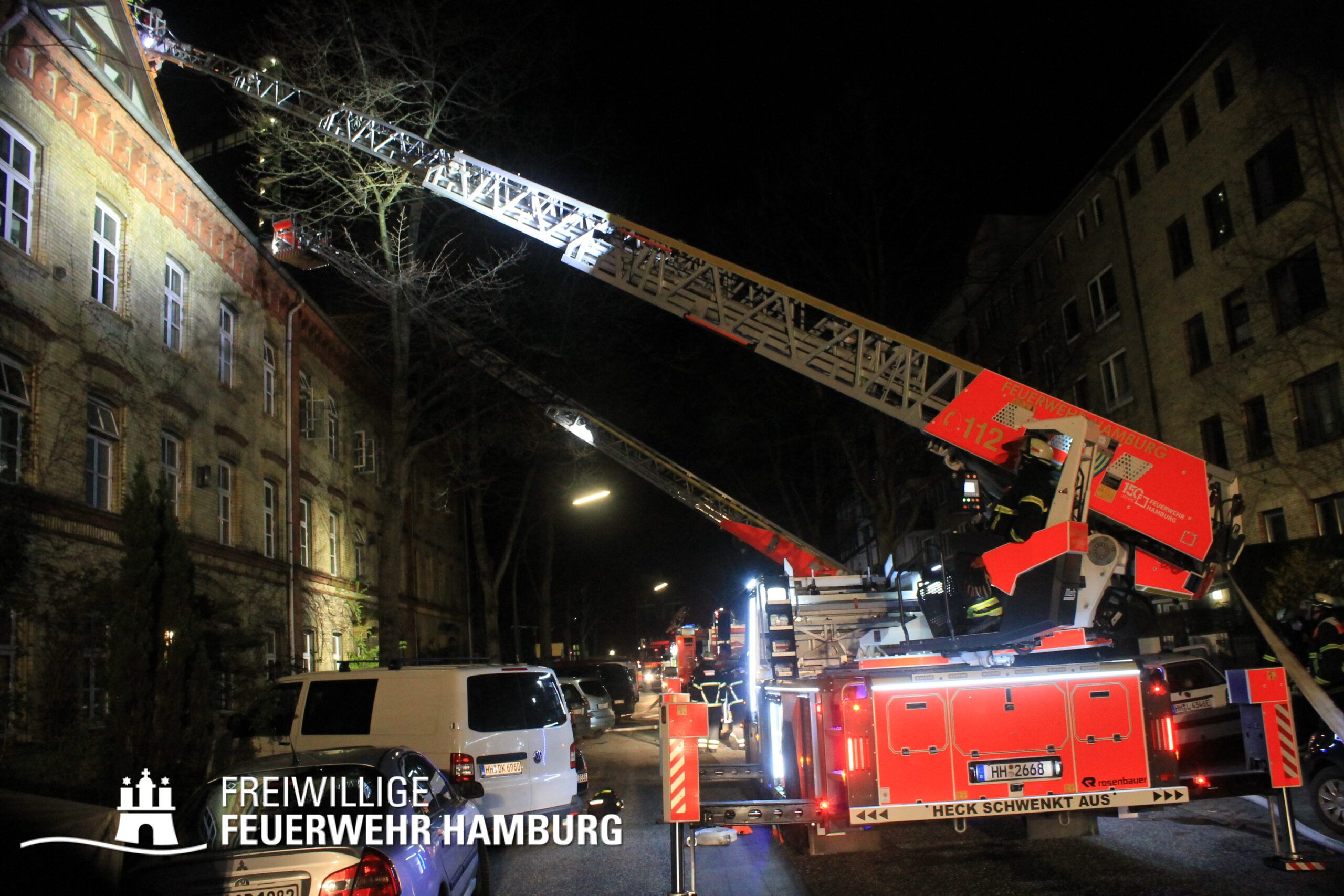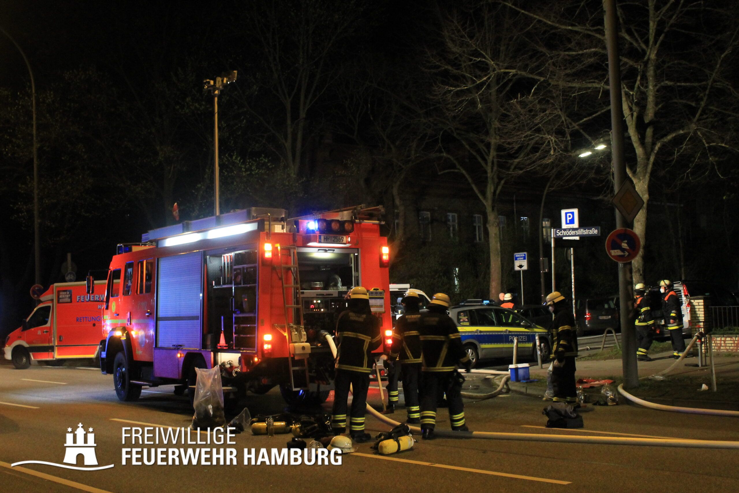 Am Mittwochmorgen um ca. 02:10 Uhr gingen bei der Feuerwehr Hamburg mehrere Anrufe aus dem Stadtteil Rotherbaum über den Notruf 112 ein. Es wurde ein Feuer in einer Wohnung eines Mehrfamilienhauses im Schröderstiftweg gemeldet, eine Person solle sich noch in der Wohnung befinden. Sofort wurde durch die Rettungsleitstelle die Alarmstufe „Feuer mit Menschenleben in Gefahr (FEUY)“ ausgelöst, der Löschzug der nahe gelegenen Feuer- und Rettungswache Rotherbaum (F 13) und die Freiwillige Feuerwehr Pöseldorf, die ebenfalls unweit untergebracht ist, zur Einsatzstelle alarmiert.