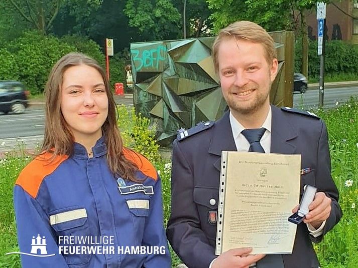 Dort wurde Tobias Moll vom Präsidium der Bezirksversammlung Eimsbüttel, nach Laudation von Bereichsführer Peter Kleffmann, mit der Ehrennadel der Bezirksversammlung für besondere Verdienste durch ehrenamtliches und soziales Engagement für den Bezirk Eimsbüttel in der Freiwilligen Feuerwehr, insbesondere der Jugendfeuerwehr, geehrt.