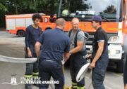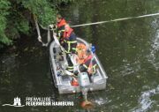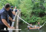 Die FF Alsterdorf befestigte vom Wasser aus B-Schläuche an dem im Wasser liegenden Baum. Zusätzlich wurde eine Bandschlinge an einem am Ufer stehenden Baum befestigt und diente somit als Umlenkrolle. So war es den Einsatzkräften schließlich möglich, den Baum von der naheliegenden Brücke aus, an den Rand des Kanals zu ziehen und den Weg für den Bootsverkehr freizumachen.