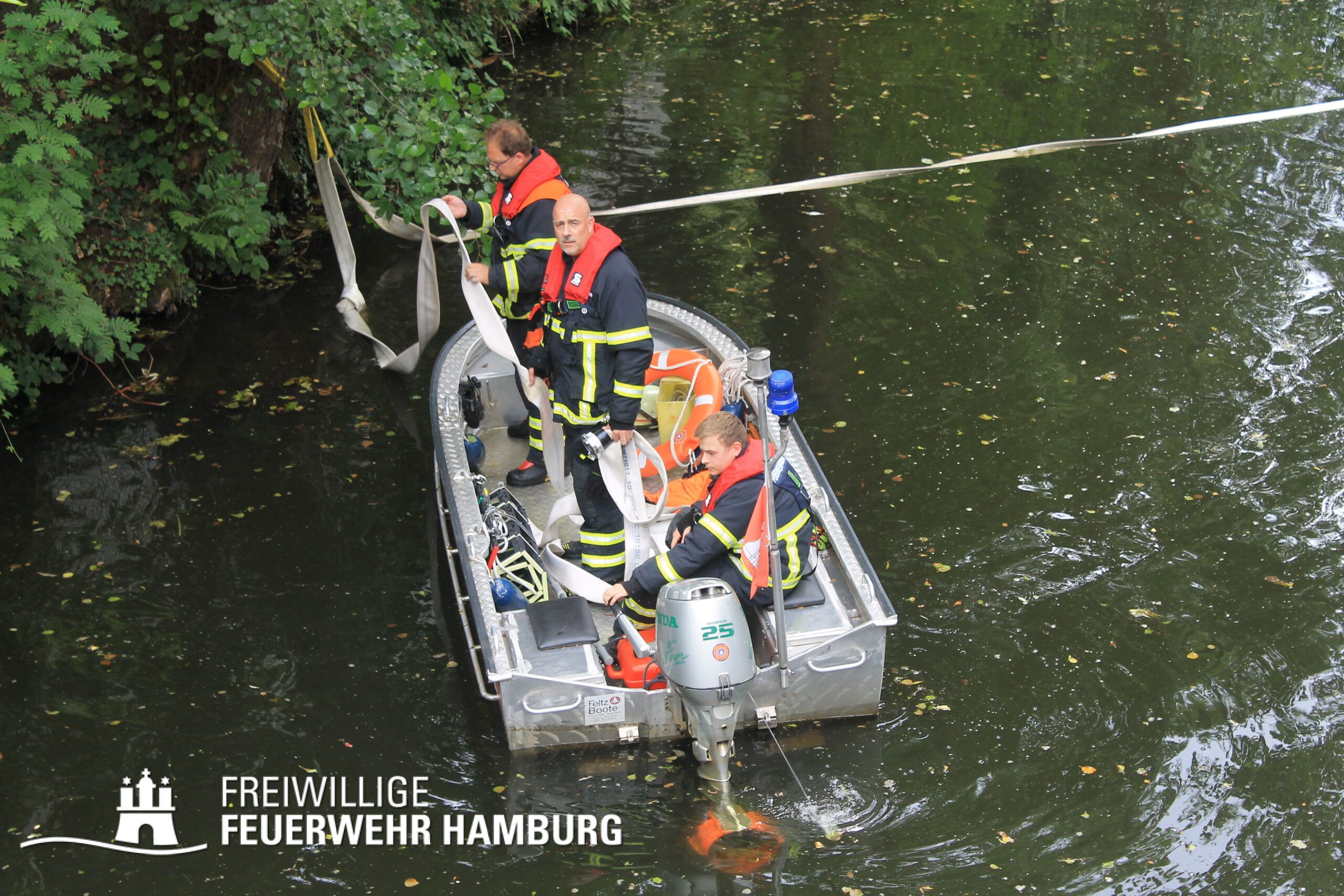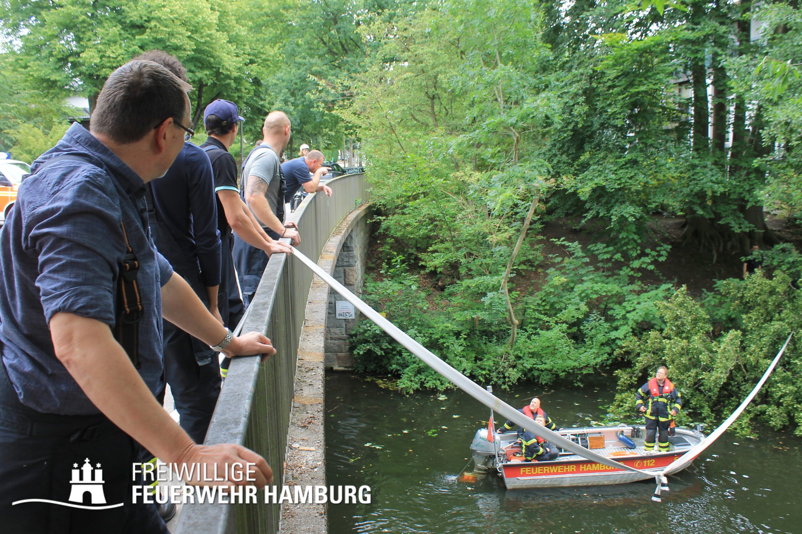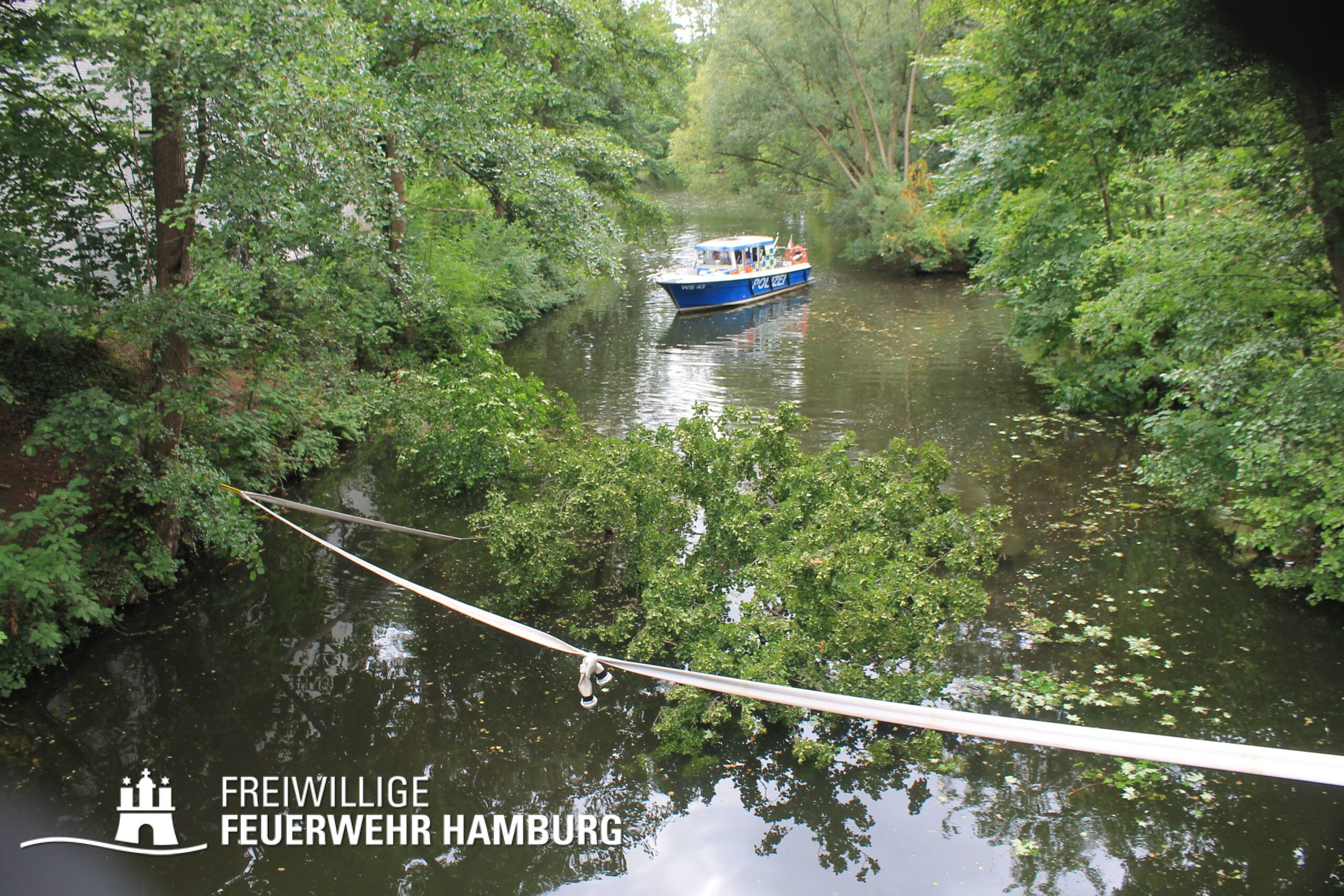 Die FF Alsterdorf befestigte vom Wasser aus B-Schläuche an dem im Wasser liegenden Baum. Zusätzlich wurde eine Bandschlinge an einem am Ufer stehenden Baum befestigt und diente somit als Umlenkrolle. So war es den Einsatzkräften schließlich möglich, den Baum von der naheliegenden Brücke aus, an den Rand des Kanals zu ziehen und den Weg für den Bootsverkehr freizumachen.