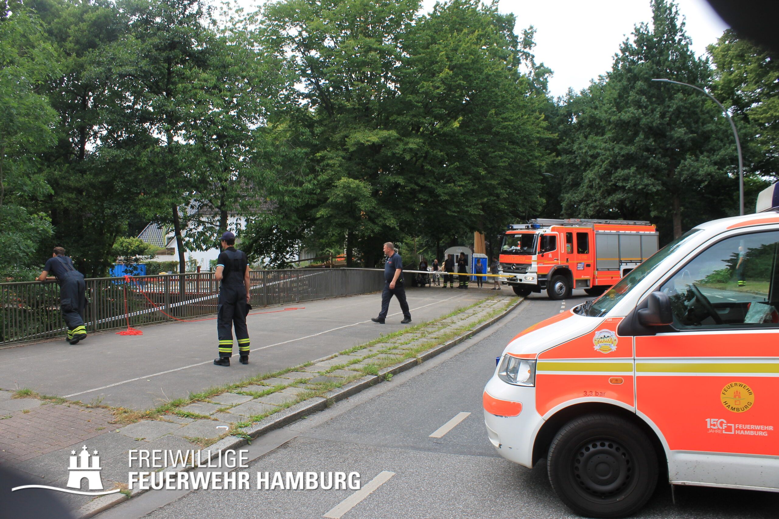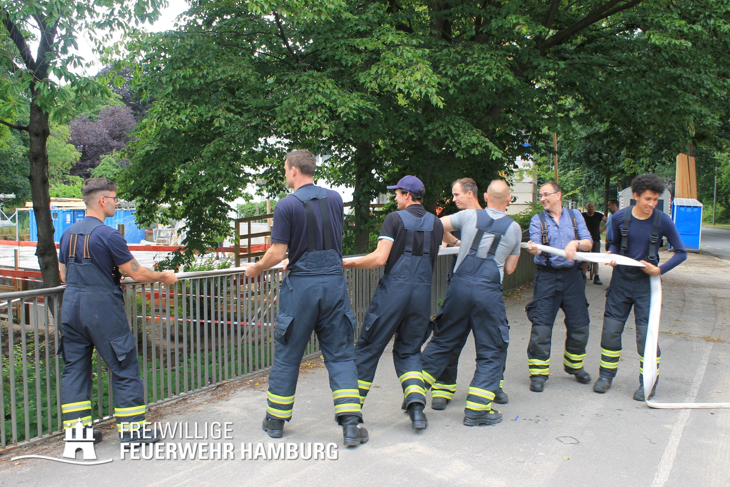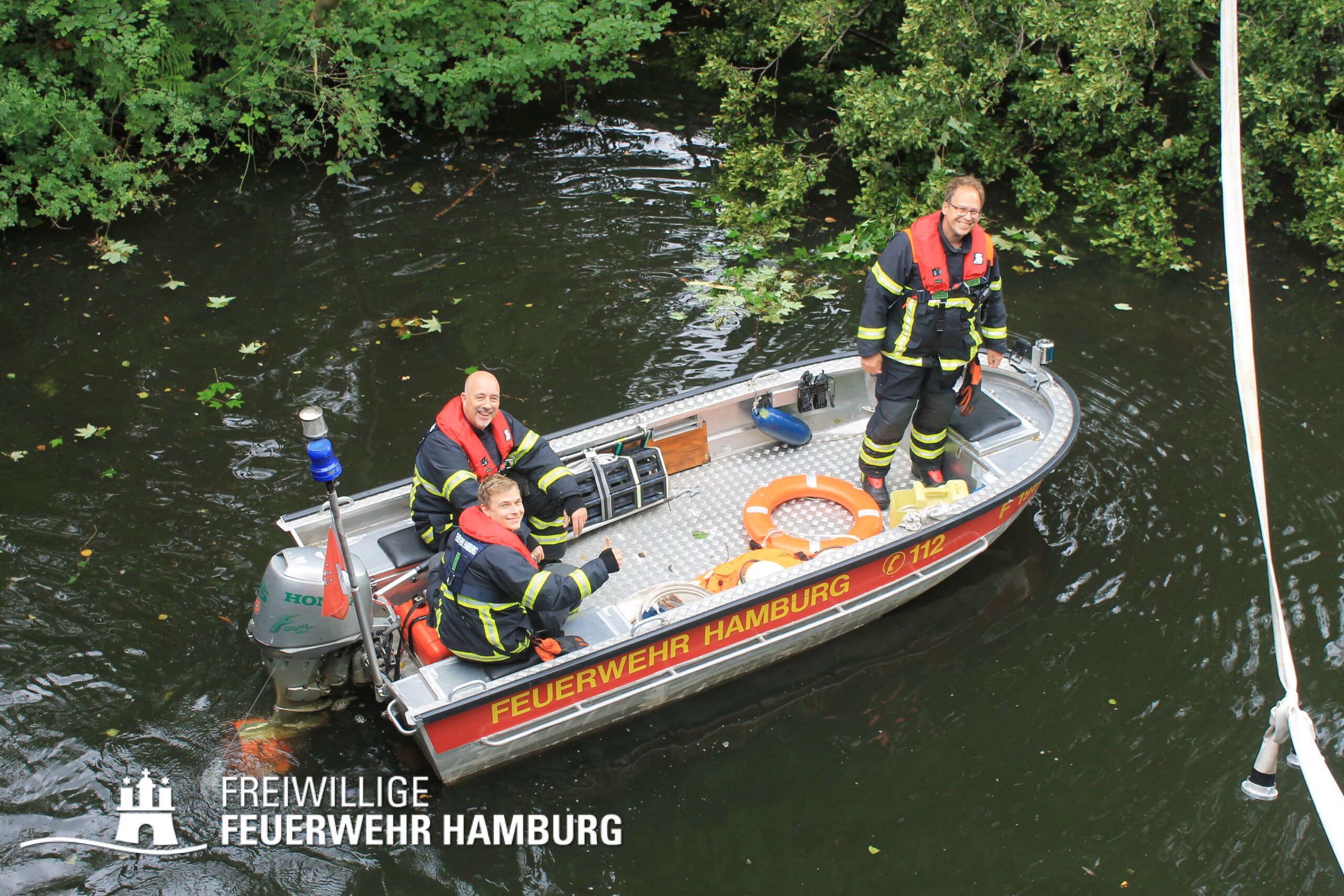 Die FF Alsterdorf befestigte vom Wasser aus B-Schläuche an dem im Wasser liegenden Baum. Zusätzlich wurde eine Bandschlinge an einem am Ufer stehenden Baum befestigt und diente somit als Umlenkrolle. So war es den Einsatzkräften schließlich möglich, den Baum von der naheliegenden Brücke aus, an den Rand des Kanals zu ziehen und den Weg für den Bootsverkehr freizumachen.