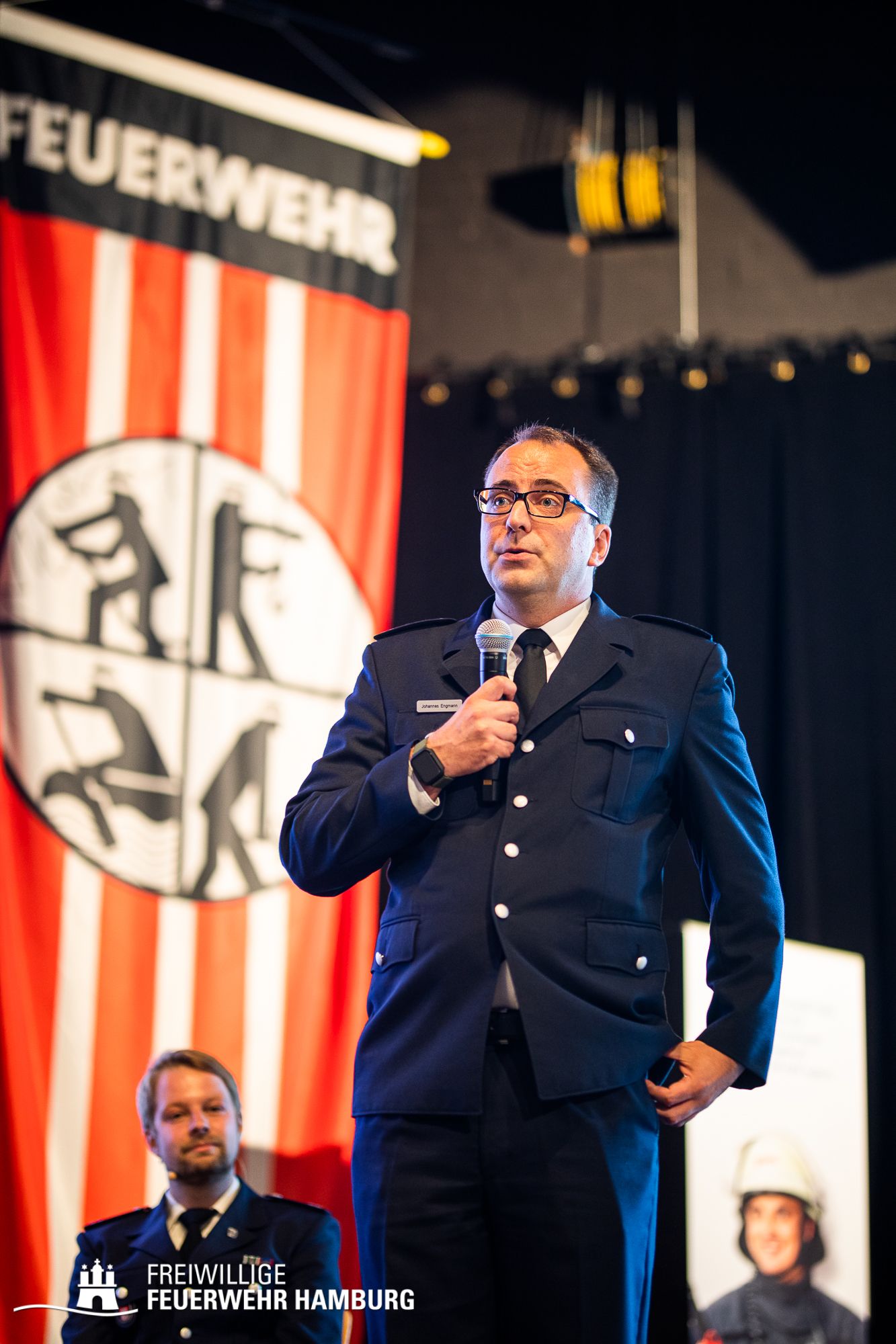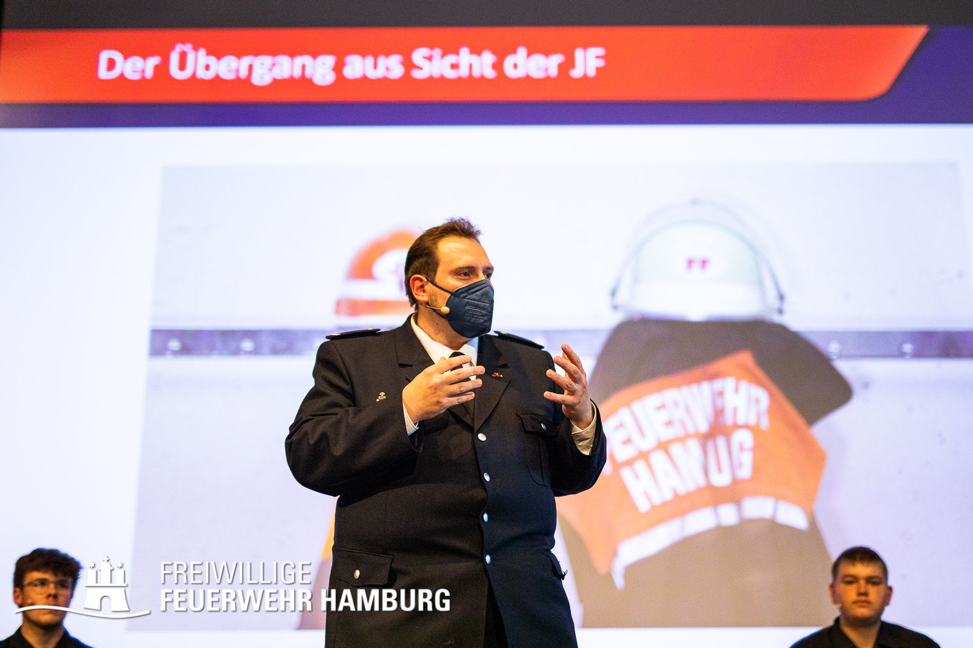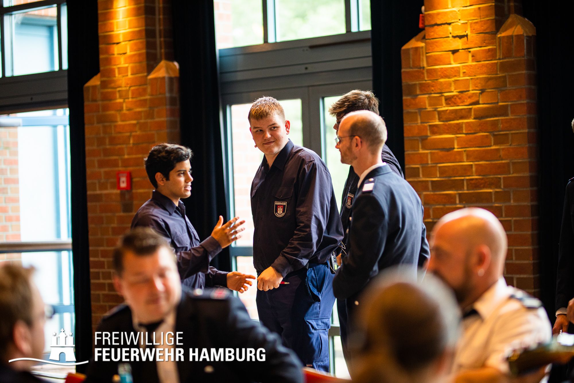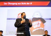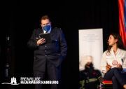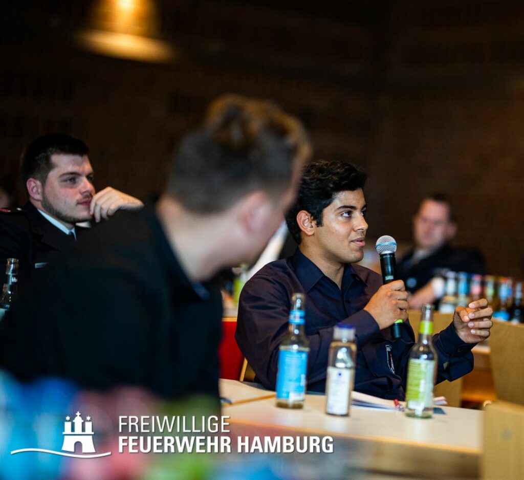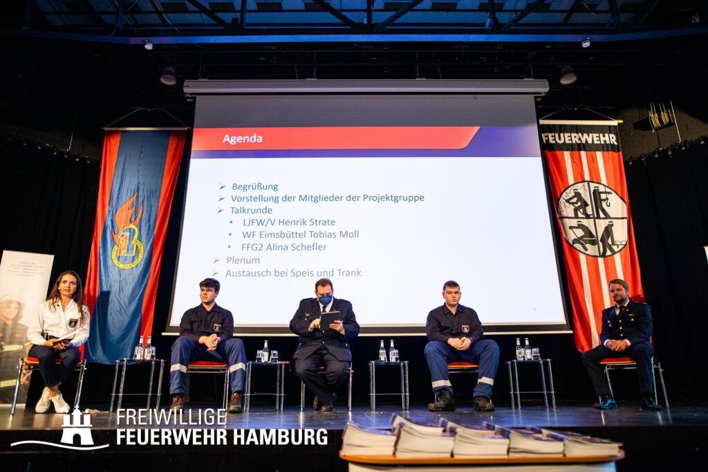 Das nun aus dem Arbeitskreis resultierte Event ermöglichte nach Aussage der Teilnehmerinnern und Teilnehmer „einen wichtigen und lebendigen Austausch“. Hier wurden die Ergebnisse des Arbeitskreises in einem neuen Format an die Kameradin und an den Kameraden gebracht: In einer Art „Talkrunde“ haben sich fünf Mitglieder der Freiwilligen Feuerwehr zu der Thematik unterhalten – untereinander und mit dem Plenum. Die Teilnehmerinnen und Teilnehmer wurden von Alina Schefler, Ansprechpartnerin für Personalmarketing und Öffentlichkeitsarbeit in der Geschäftsstelle, durch die Veranstaltung geleitet. Landesjugendfeuerwehrwart-Vertreter Henrik Strate sowie Wehrführer der Freiwilligen Feuerwehr Eimsbüttel, Tobias Moll, teilten ihr Expertenwissen zu Themen wie Statistiken, Ü15-Diensten und Praktika bei der Einsatzabteilung. Außerdem saßen die beiden Landesjugendsprecher Rupert Kempe und Nils Pank auf der Bühne, um die Gespräche aus der Perspektive der Jugendlichen zu beleuchten. Mit diesem neuen Format wurde einem intensiven und offenen Austausch zu der Thematik auf der Bühne wie auch im gesamten Plenum Raum gegeben.