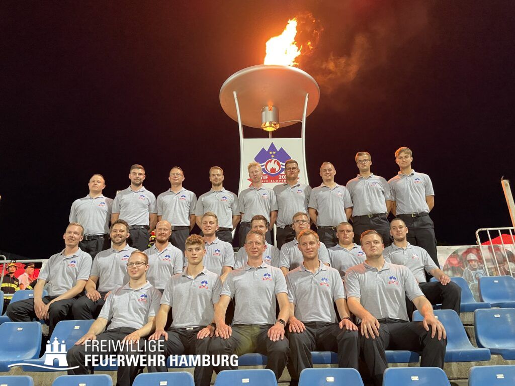 Am Abend fand dann, bei immer noch sehr hohen Temperaturen um die 37 Grad, die feierliche Siegerehrung im Stadion „Z’dežele“ statt. Alter und neuer Weltmeister in der Klasse Herren A ist die Wettbewerbstruppe aus St. Martin im Mühlkreis aus Österreich mit 418, 58 Punkten (30,27 + 51,15). Auch die Hamburger Mannschaften erhielten hier ihre lang ersehnten Medaillen.