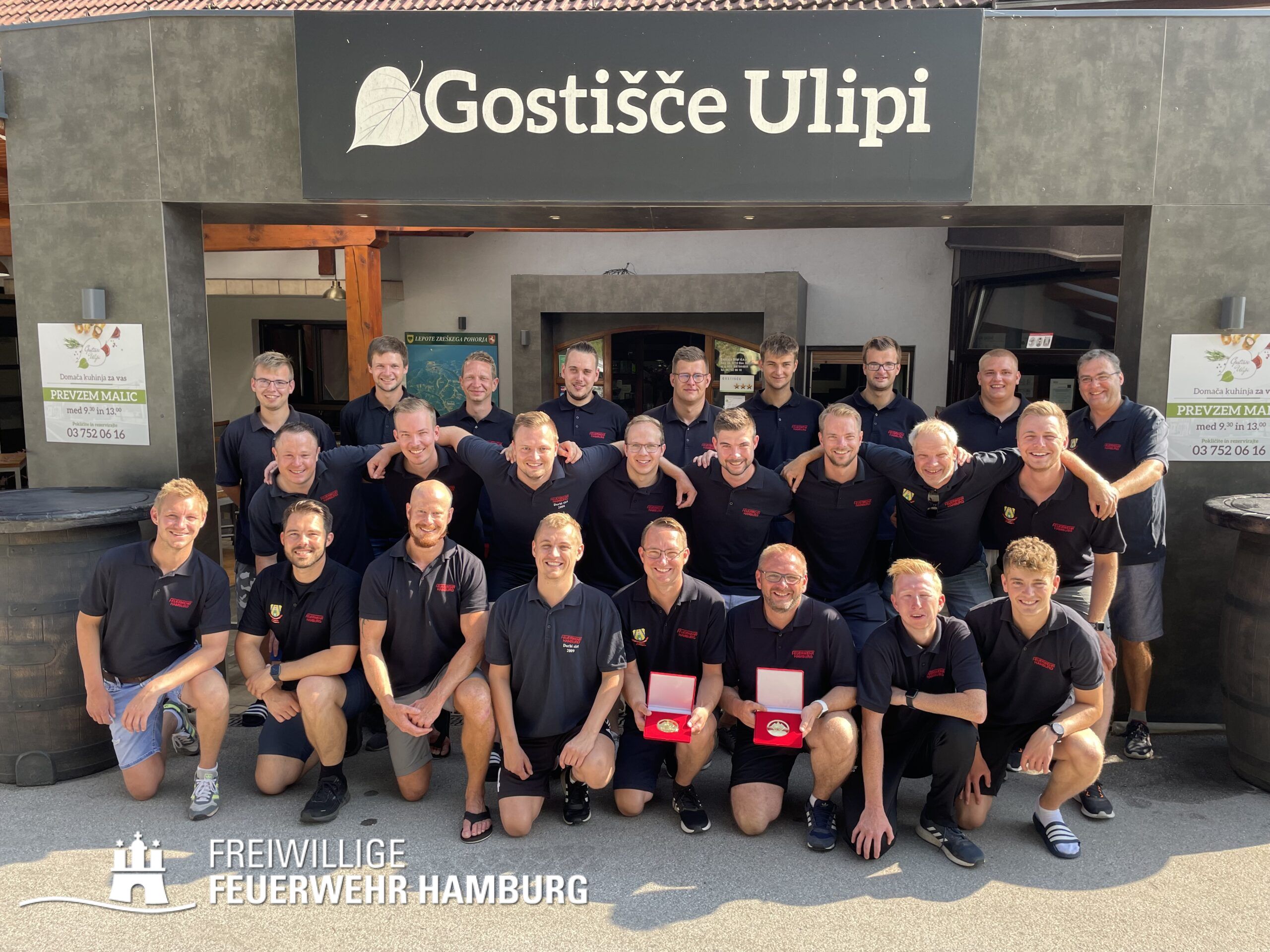 Der Donnerstag stand dann ganz unter dem Zeichen der Entspannung und dem Erkunden Sloweniens außerhalb der Wettkampfstadien. Beim gemeinsamen Essen in der Unterkunft am Abend kamen beide Hamburger Teams und die mitgereisten Fans noch einmal zusammen. Der Hauptwettkampf für die Herren Klasse A fand am Freitag bei Temperaturen von bis zu 39 Grad vor ausverkauftem Haus im Stadion „Kladivar“ statt. Der Wettbewerb besteht aus einem an die FwDv3 angelehnten trockenen Löschangriff und einem 8x50m Staffellauf mit Hindernissen. Die Vergabe der Medaillen erfolgt für die teilnehmenden Wehren nach der Drittelteilung (1-20 Gold; 20-40 Silber; 40-60 Bronze), für die erstplatzierten drei Mannschaften gibt es noch gesonderte Einzelauszeichnungen. Jedes Team startet mit 500 Gutpunkten. Pro benötigter Sekunde wird ein Punkt abgezogen. Für Fehler, wie z.B. falsches Arbeiten, unwirksam ausgelegte Druckschläuche oder offene Kupplungen gibt es Fehlerpunkte, die ebenfalls abgezogen werden. Beide Hamburger Mannschaften arbeiteten jedoch sauber und fehlerfrei. Am Ende trennten die beiden Mannschaften gerade einmal 12 hundertstel Sekunden voneinander (Spadenland: 41,86 + 61,04 = 397,10; Moorwerder: 40,02 + 63,00 =396,98). Durch diese Leistung war für beide Mannschaften klar, dass es zu einer guten Platzierung reichen kann, da jedoch noch einige der besten Mannschaften an den Start gingen, hieß es für beide Mannschaften noch eine Weile zittern, ob es tatsächlich für einen der begehrten Goldränge gereicht hat.
