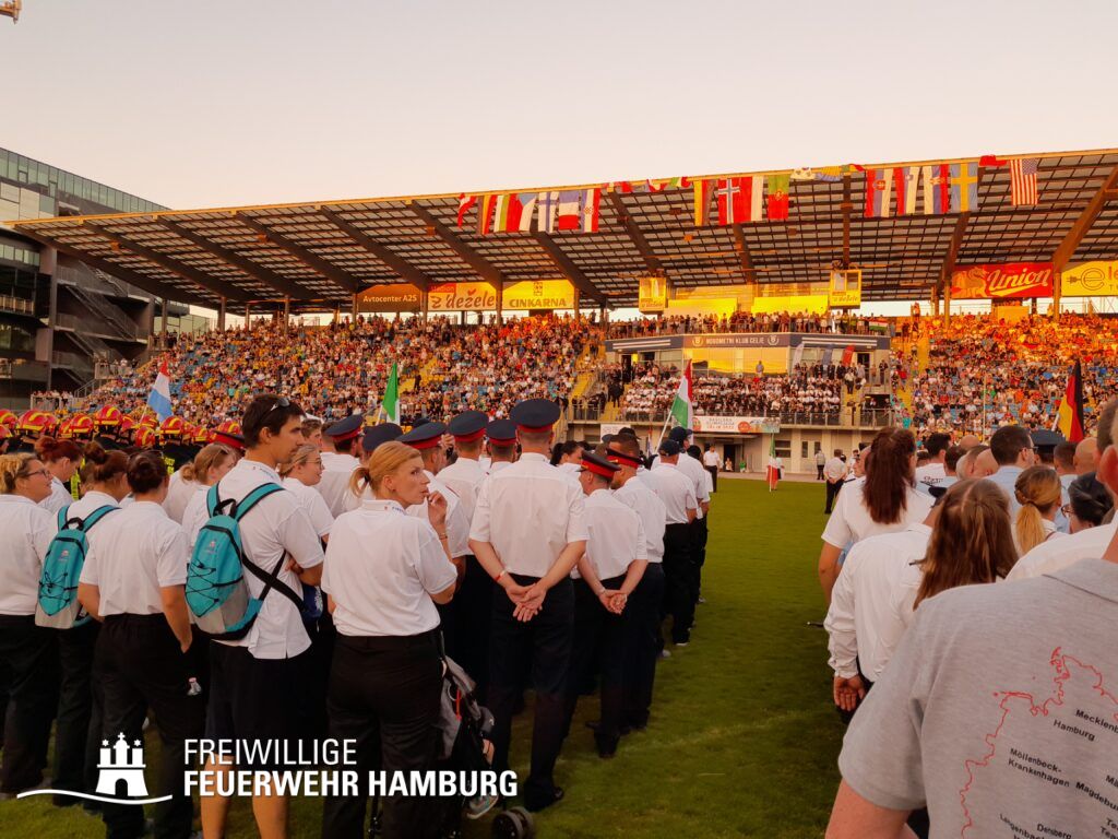 Als alle Mannschaften durch waren und auch die Einspruchsfrist gegen die Ergebnisse verstrichen war, stand jedoch fest: Gleich bei ihrer ersten Teilnahme bei Olympia erreichen beide Hamburger Mannschaften eine Goldmedaille. Eine überragende Leistung mit der so nicht zu rechnen war. Am Ende hieß es Platz 18 für Spadenland und Platz 20 für Moorwerder. Somit gehören beide Mannschaften zu den schnellsten 20 Mannschaften der Welt in ihrer Disziplin. In der internen Deutschlandwertung belegen die Mannschaften die Plätze 2 und 3 und holen die Hälfte der Goldmedaillen für deutsche Mannschaften in ihrer Wertungsklasse. Dieser herausragende Erfolg konnte am Freitagabend noch gebührend gefeiert werden, bevor es am Samstagmorgen wieder in das Stadion ging, um hier die restlichen noch startenden Mannschaften Deutschlands in den Wertungsklassen Herren B (Freiwillige Feuerwehr Herren mit Alterspunkten) und Frauen A und B (Freiwillige Feuerwehren Frauenmannschaften ohne und mit Alterspunkten) zu unterstützen. Leider verletzte sich die Startläuferin der Frauen aus Möllenbeck bei ihrem Staffellauf schwer. An dieser Stelle möchten wir noch einmal die besten Genesungswünsche ausrichten!