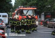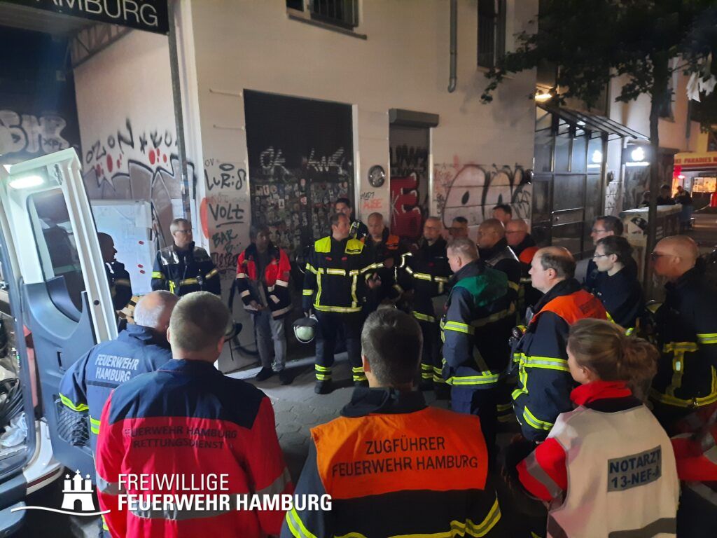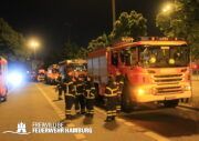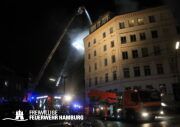 In einem Mehrfamilienhaus in der Sternstraße brach gegen 23 Uhr im 4. OG ein Feuer in einer Wohnung aus. Die Löschgruppe der BF Innenstadt wurde durch die Rettungsleitstelle der Feuerwehr Hamburg gemeinsam mit der Freiwilligen Feuerwehr Pöseldorf zur Einsatzadresse alarmiert. Bei Ankunft stellte man eine starke Rauchentwicklung im 4. OG aus Fenstern und der Gebäuderückseite fest. Sofort wurde ein Löschangriff über eine Drehleiter und das Treppenhaus vorbereitet. In der Anfangsphase wurde in der Brandwohnung noch eine Person vermisst, bei den Löscharbeiten konnte allerdings niemand gefunden werden. Während der Brandbekämpfung breitete sich das Feuer in den Dachstuhl des 5. OG aus. Der Zugführer ließ die Alarmstufe auf FEU2MANV5 (Feuer, 2 Löschzügen, Massenanfall von Verletzten) erhöhen, da auch diverse Bewohner des Hauses betreut und evakuiert werden mussten.