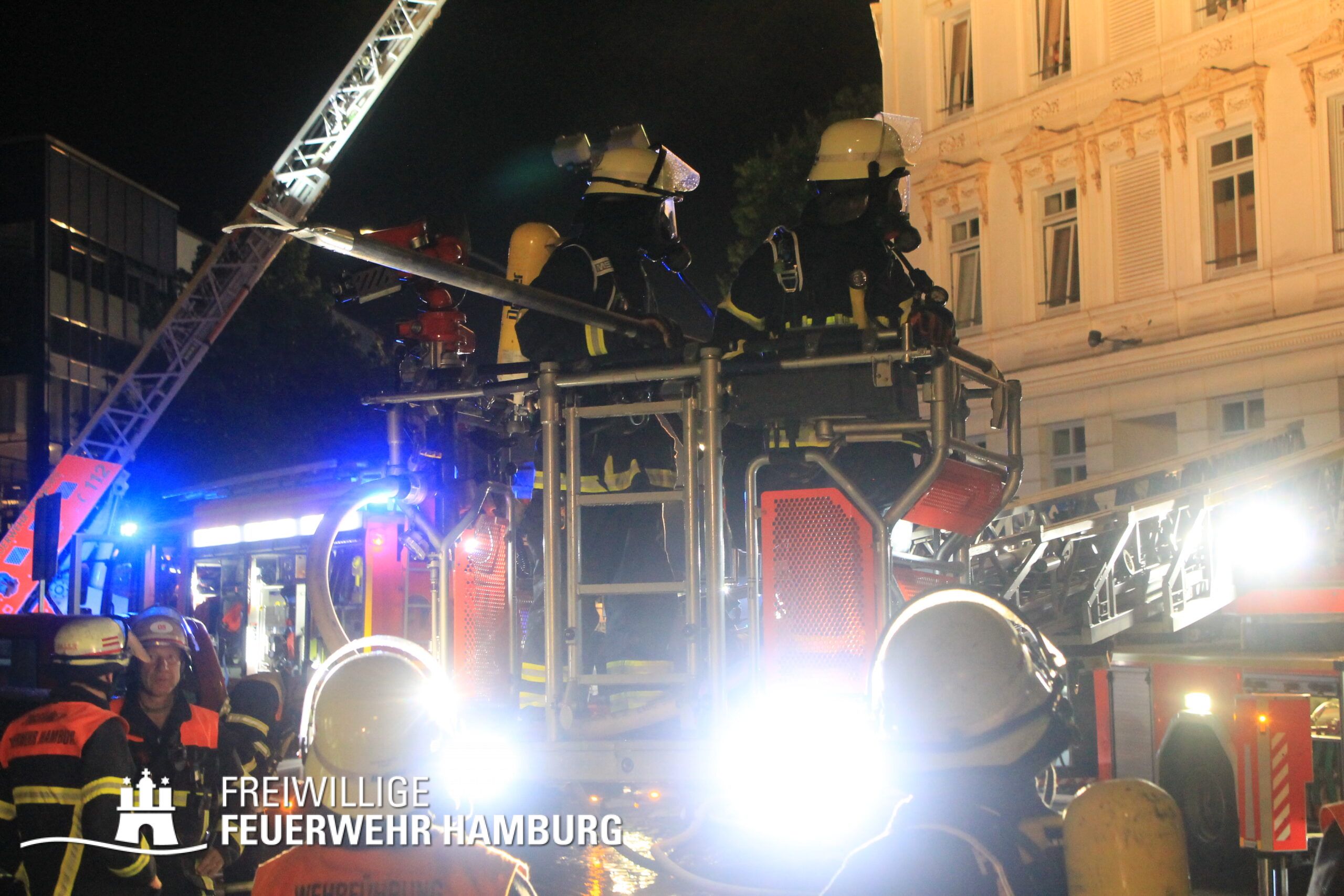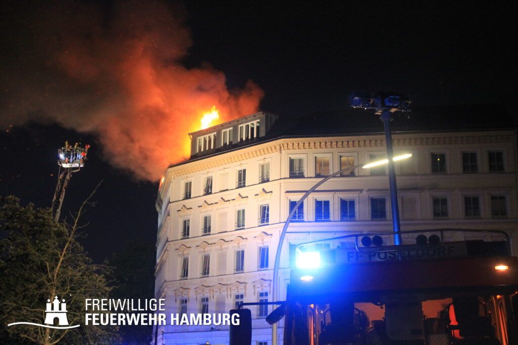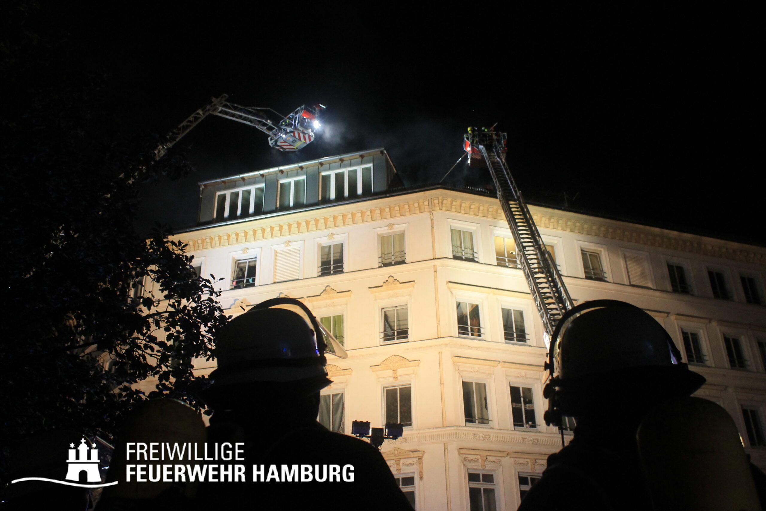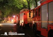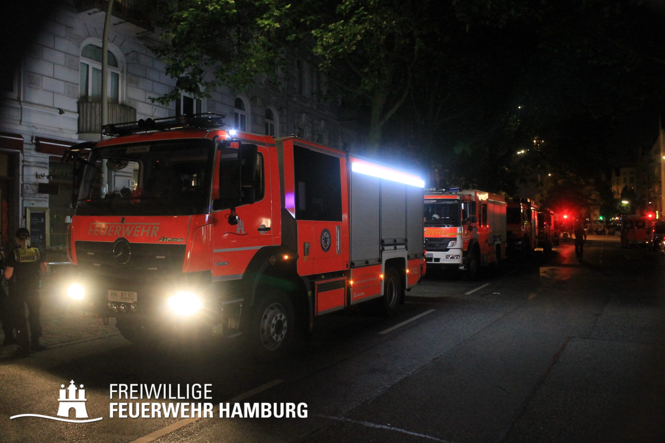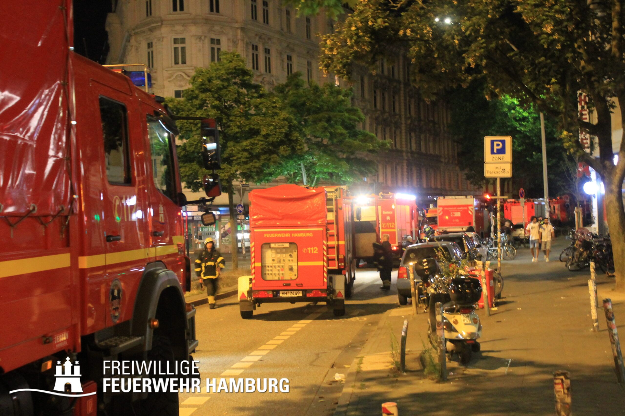 In einem Mehrfamilienhaus in der Sternstraße brach gegen 23 Uhr im 4. OG ein Feuer in einer Wohnung aus. Die Löschgruppe der BF Innenstadt wurde durch die Rettungsleitstelle der Feuerwehr Hamburg gemeinsam mit der Freiwilligen Feuerwehr Pöseldorf zur Einsatzadresse alarmiert. Bei Ankunft stellte man eine starke Rauchentwicklung im 4. OG aus Fenstern und der Gebäuderückseite fest. Sofort wurde ein Löschangriff über eine Drehleiter und das Treppenhaus vorbereitet. In der Anfangsphase wurde in der Brandwohnung noch eine Person vermisst, bei den Löscharbeiten konnte allerdings niemand gefunden werden. Während der Brandbekämpfung breitete sich das Feuer in den Dachstuhl des 5. OG aus. Der Zugführer ließ die Alarmstufe auf FEU2MANV5 (Feuer, 2 Löschzügen, Massenanfall von Verletzten) erhöhen, da auch diverse Bewohner des Hauses betreut und evakuiert werden mussten.