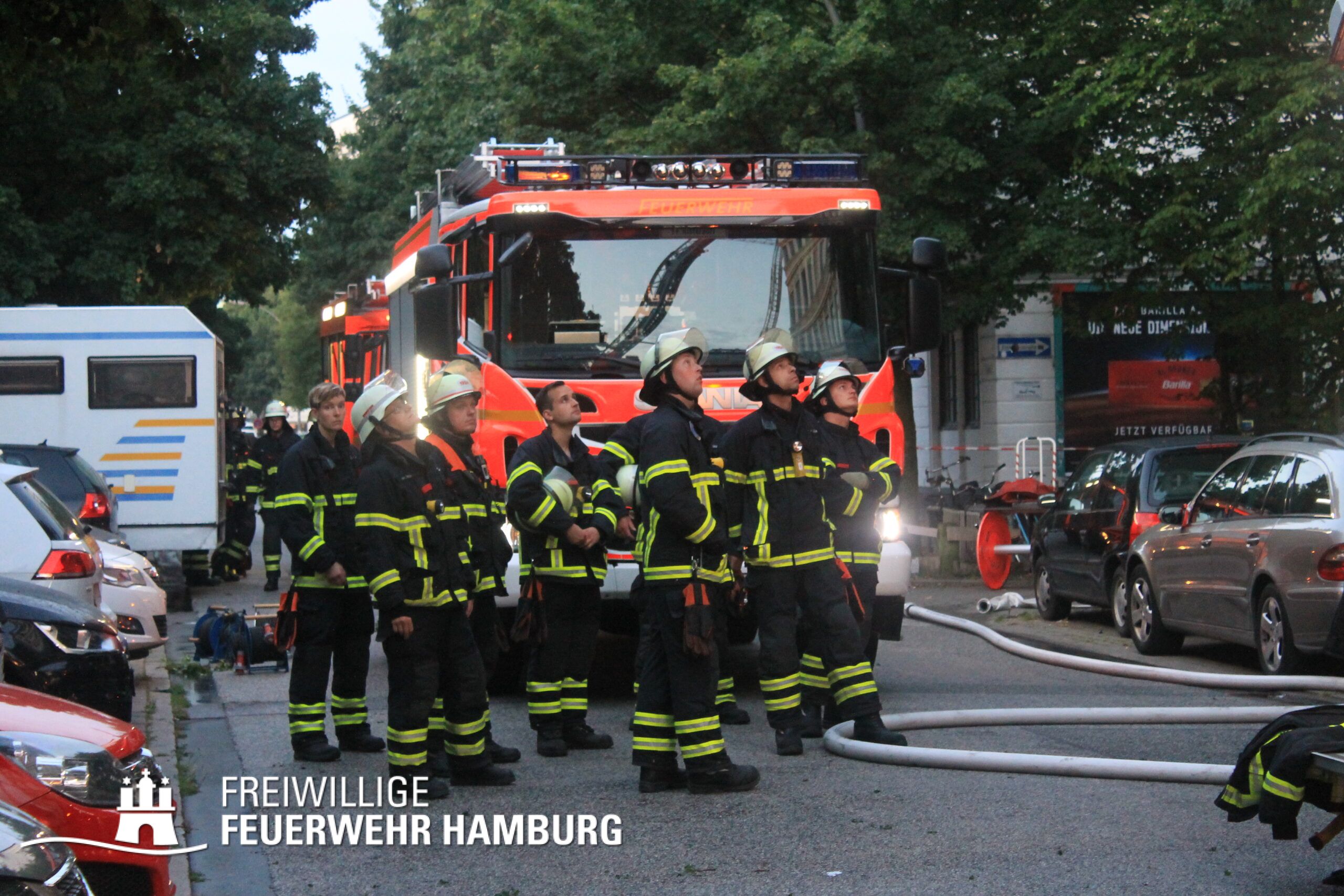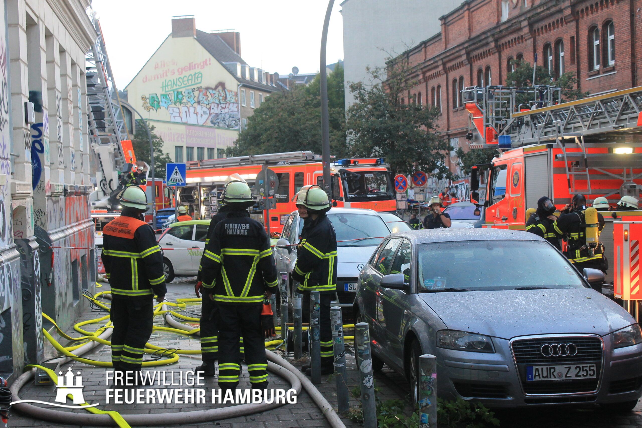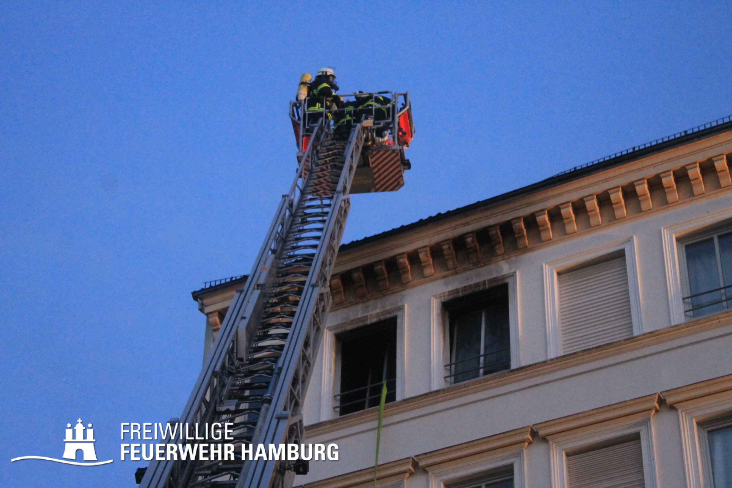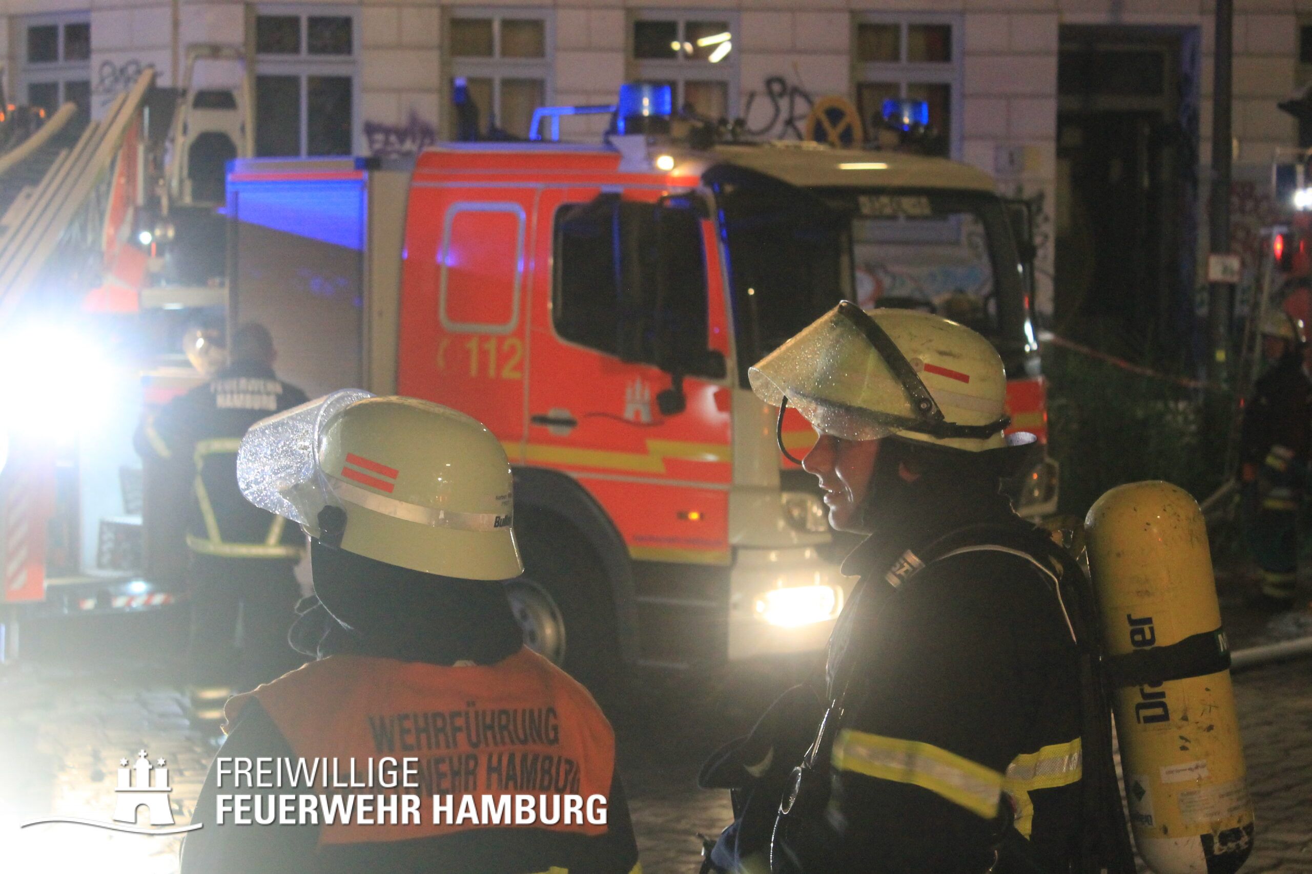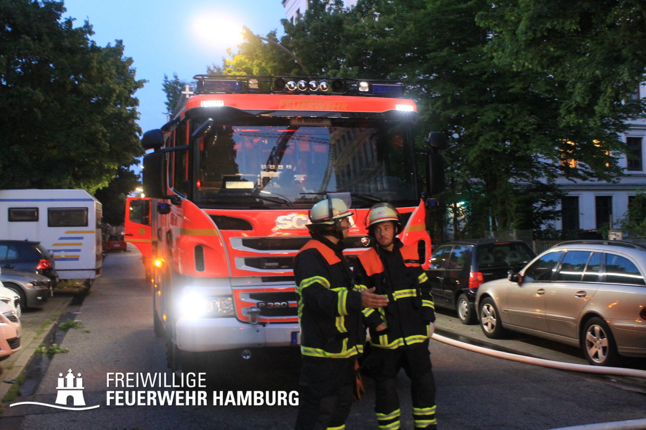 In einem Mehrfamilienhaus in der Sternstraße brach gegen 23 Uhr im 4. OG ein Feuer in einer Wohnung aus. Die Löschgruppe der BF Innenstadt wurde durch die Rettungsleitstelle der Feuerwehr Hamburg gemeinsam mit der Freiwilligen Feuerwehr Pöseldorf zur Einsatzadresse alarmiert. Bei Ankunft stellte man eine starke Rauchentwicklung im 4. OG aus Fenstern und der Gebäuderückseite fest. Sofort wurde ein Löschangriff über eine Drehleiter und das Treppenhaus vorbereitet. In der Anfangsphase wurde in der Brandwohnung noch eine Person vermisst, bei den Löscharbeiten konnte allerdings niemand gefunden werden. Während der Brandbekämpfung breitete sich das Feuer in den Dachstuhl des 5. OG aus. Der Zugführer ließ die Alarmstufe auf FEU2MANV5 (Feuer, 2 Löschzügen, Massenanfall von Verletzten) erhöhen, da auch diverse Bewohner des Hauses betreut und evakuiert werden mussten.