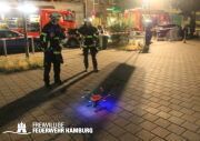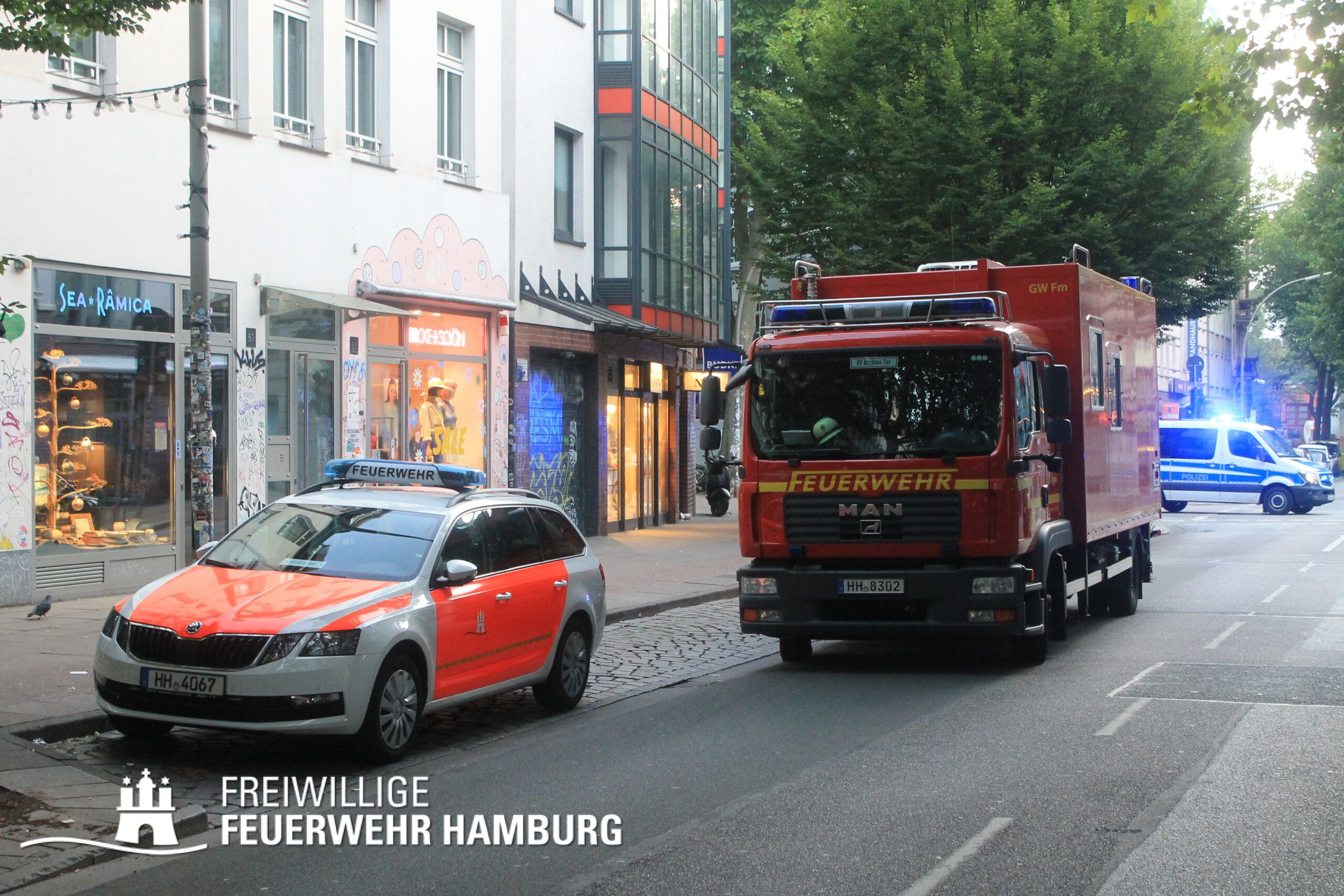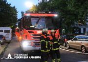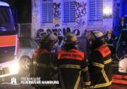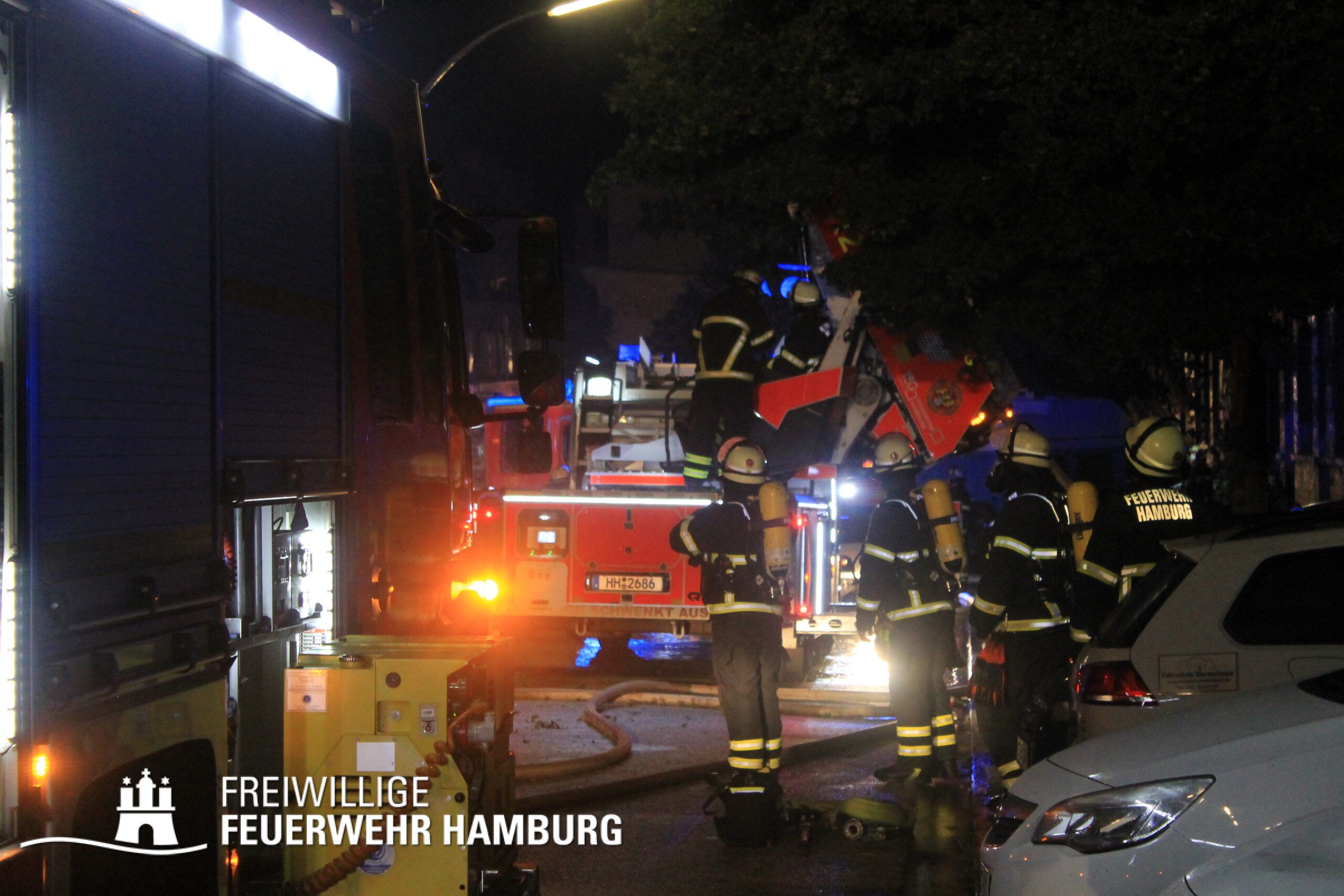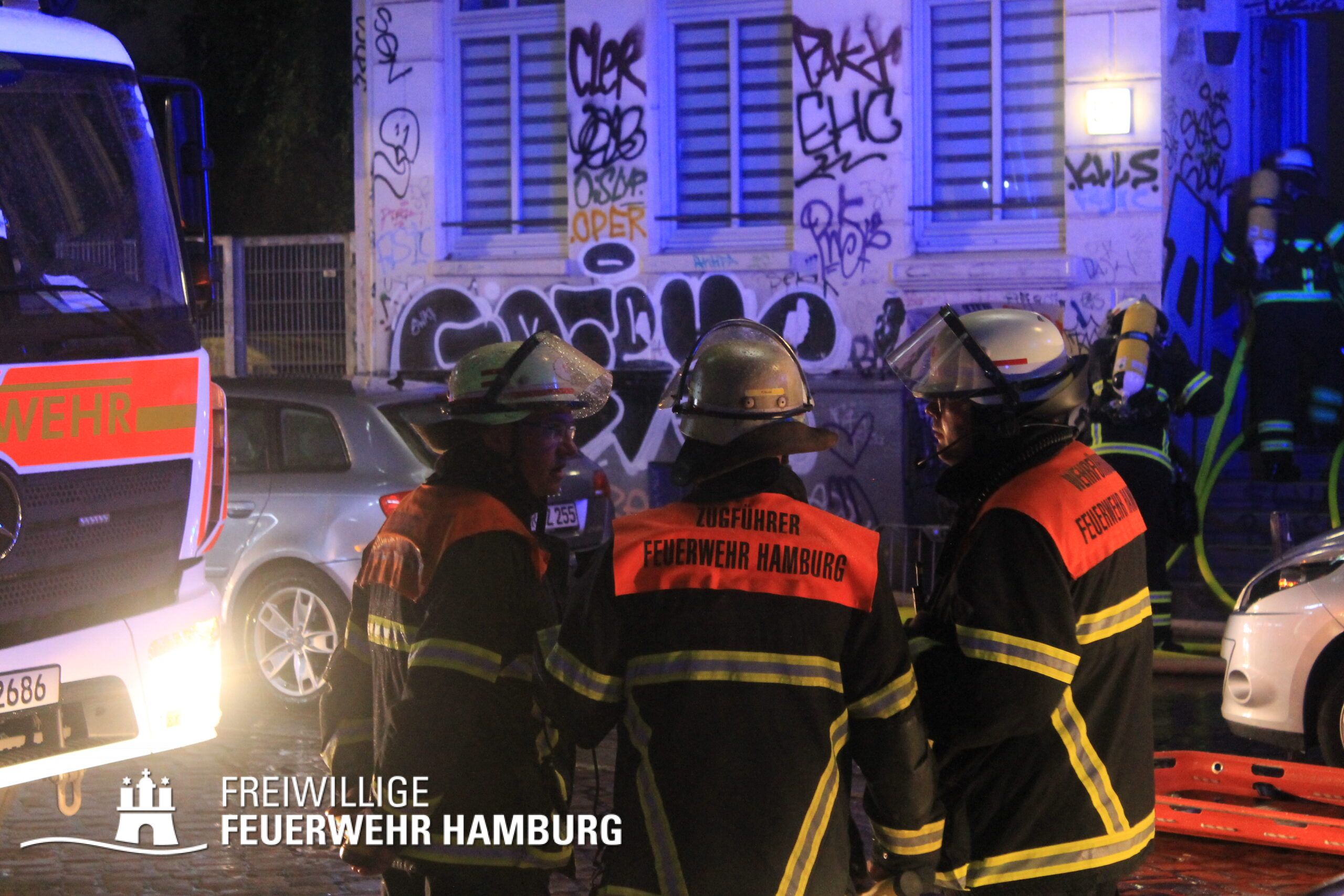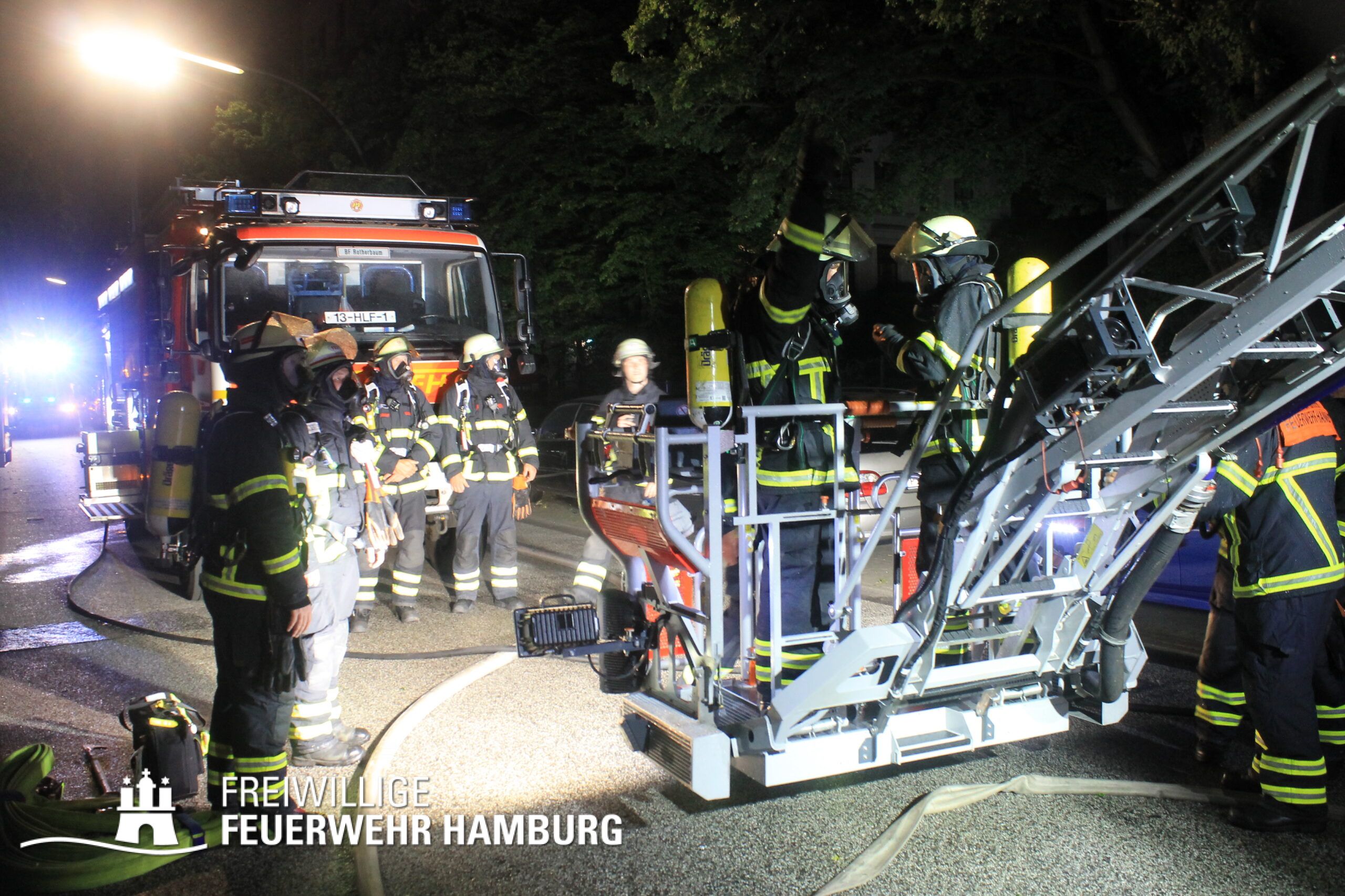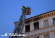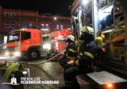 In einem Mehrfamilienhaus in der Sternstraße brach gegen 23 Uhr im 4. OG ein Feuer in einer Wohnung aus. Die Löschgruppe der BF Innenstadt wurde durch die Rettungsleitstelle der Feuerwehr Hamburg gemeinsam mit der Freiwilligen Feuerwehr Pöseldorf zur Einsatzadresse alarmiert. Bei Ankunft stellte man eine starke Rauchentwicklung im 4. OG aus Fenstern und der Gebäuderückseite fest. Sofort wurde ein Löschangriff über eine Drehleiter und das Treppenhaus vorbereitet. In der Anfangsphase wurde in der Brandwohnung noch eine Person vermisst, bei den Löscharbeiten konnte allerdings niemand gefunden werden. Während der Brandbekämpfung breitete sich das Feuer in den Dachstuhl des 5. OG aus. Der Zugführer ließ die Alarmstufe auf FEU2MANV5 (Feuer, 2 Löschzügen, Massenanfall von Verletzten) erhöhen, da auch diverse Bewohner des Hauses betreut und evakuiert werden mussten.