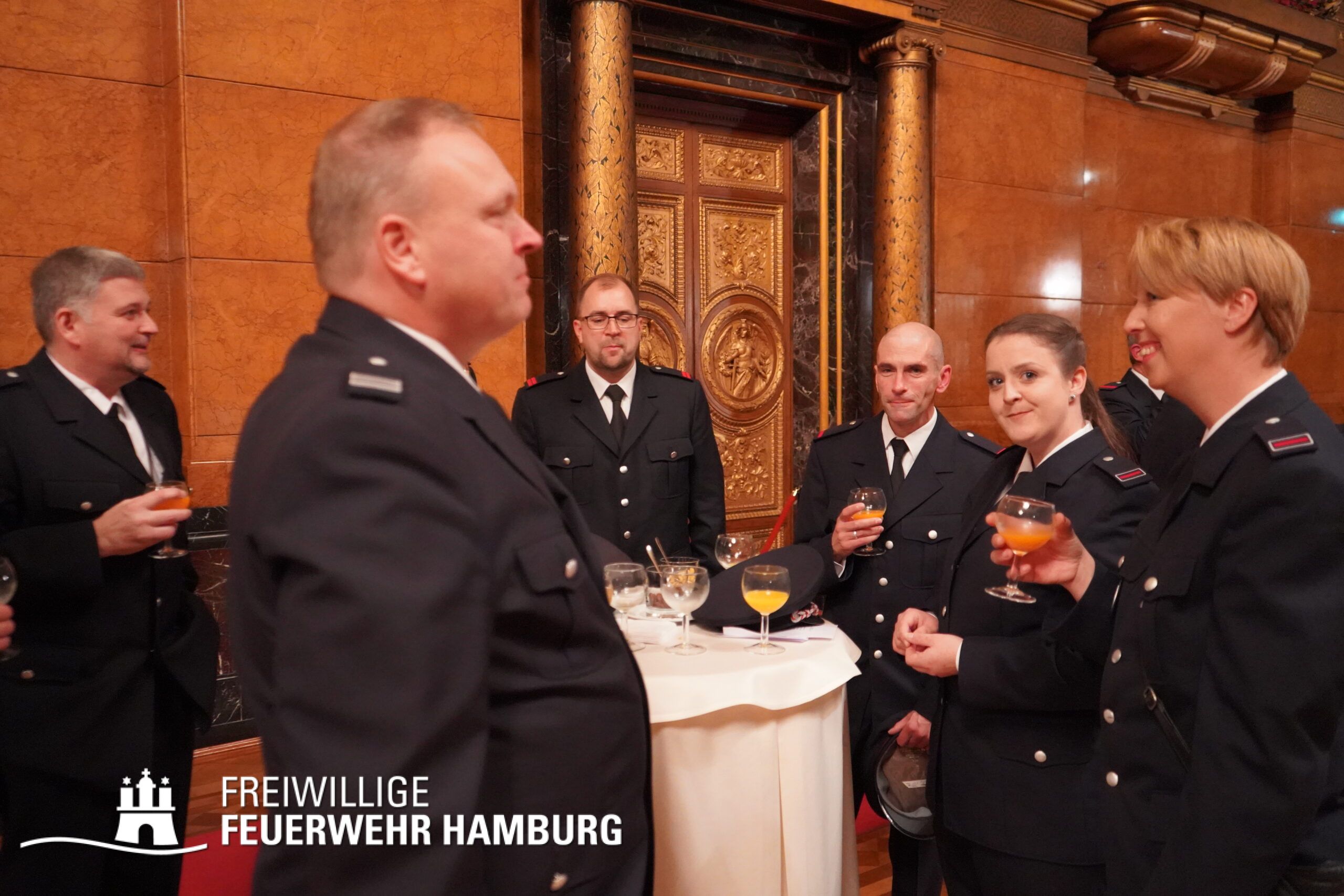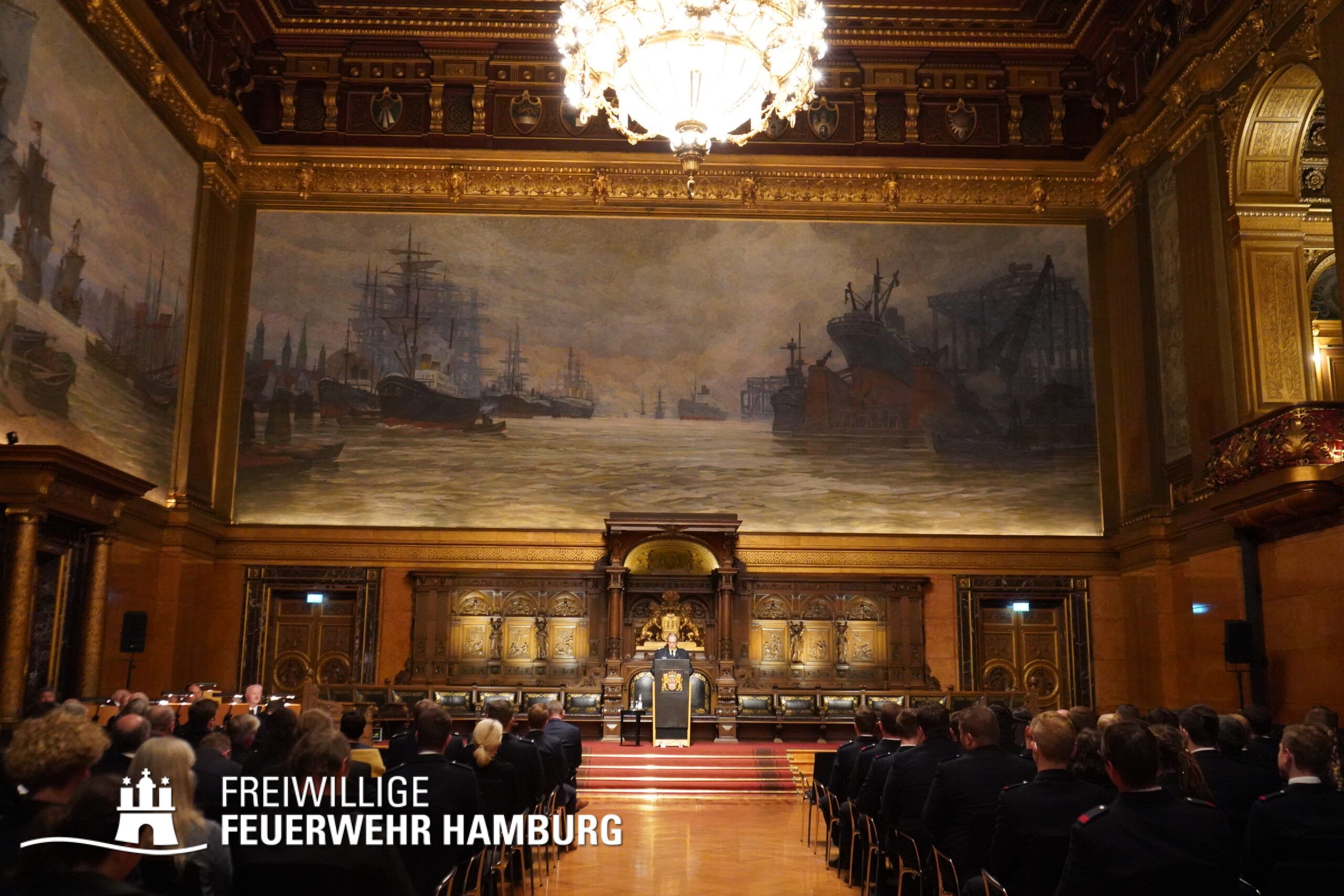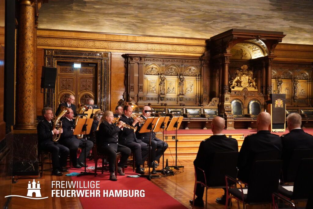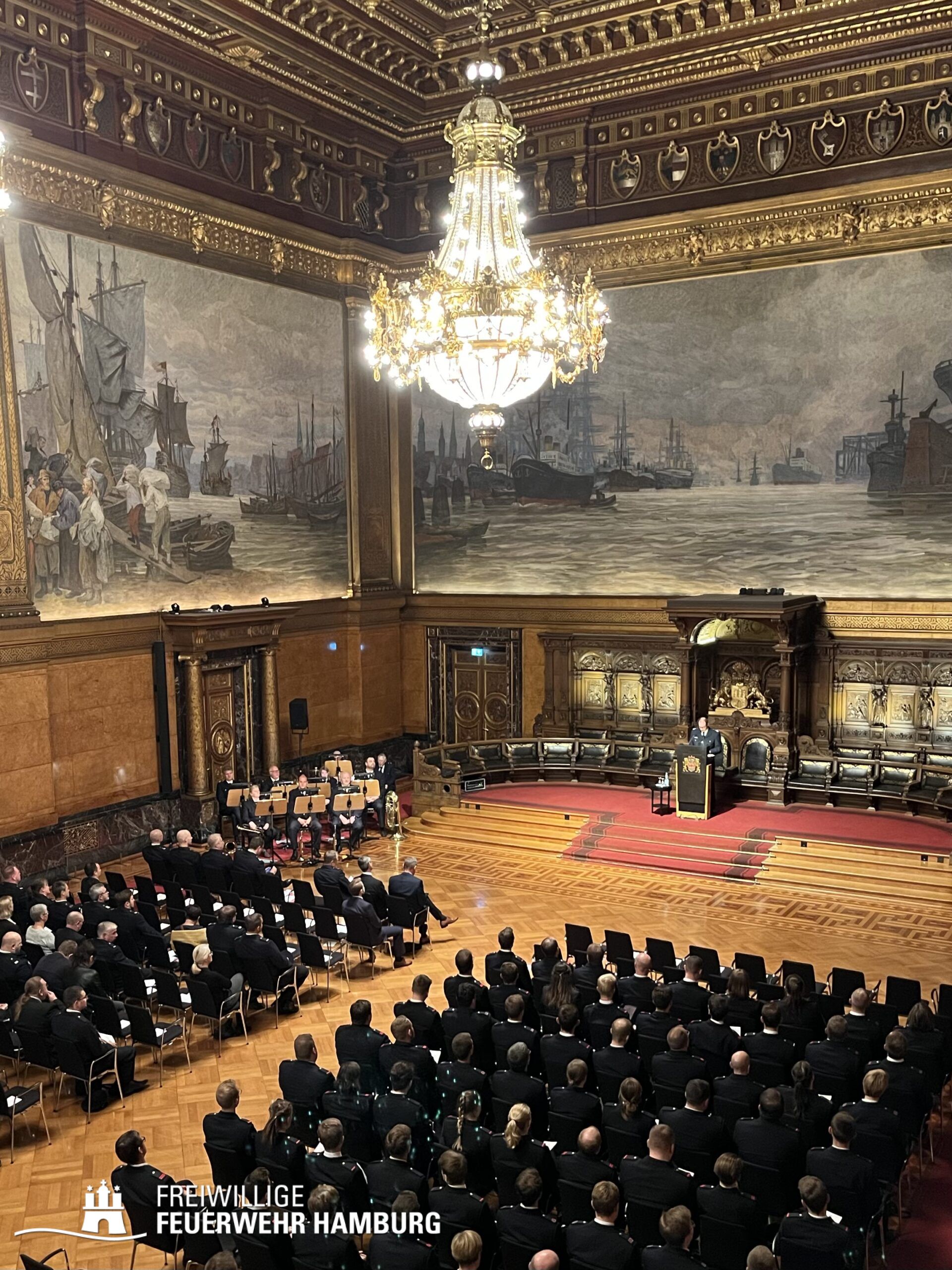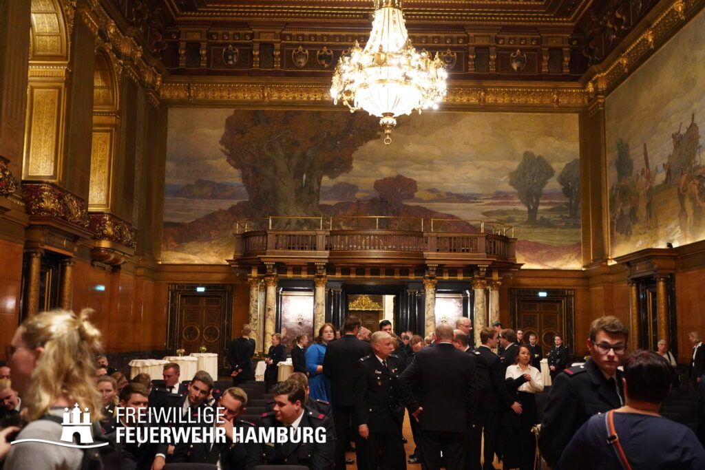 Bereits vor Beginn der Veranstaltung war der große Festsaal des Hamburger Rathauses gefüllt mit guter Laune und die stimmungsvolle Musik der kleinen Besetzung des Landesfeuerwehrorchesters rundete die Atmosphäre ab.