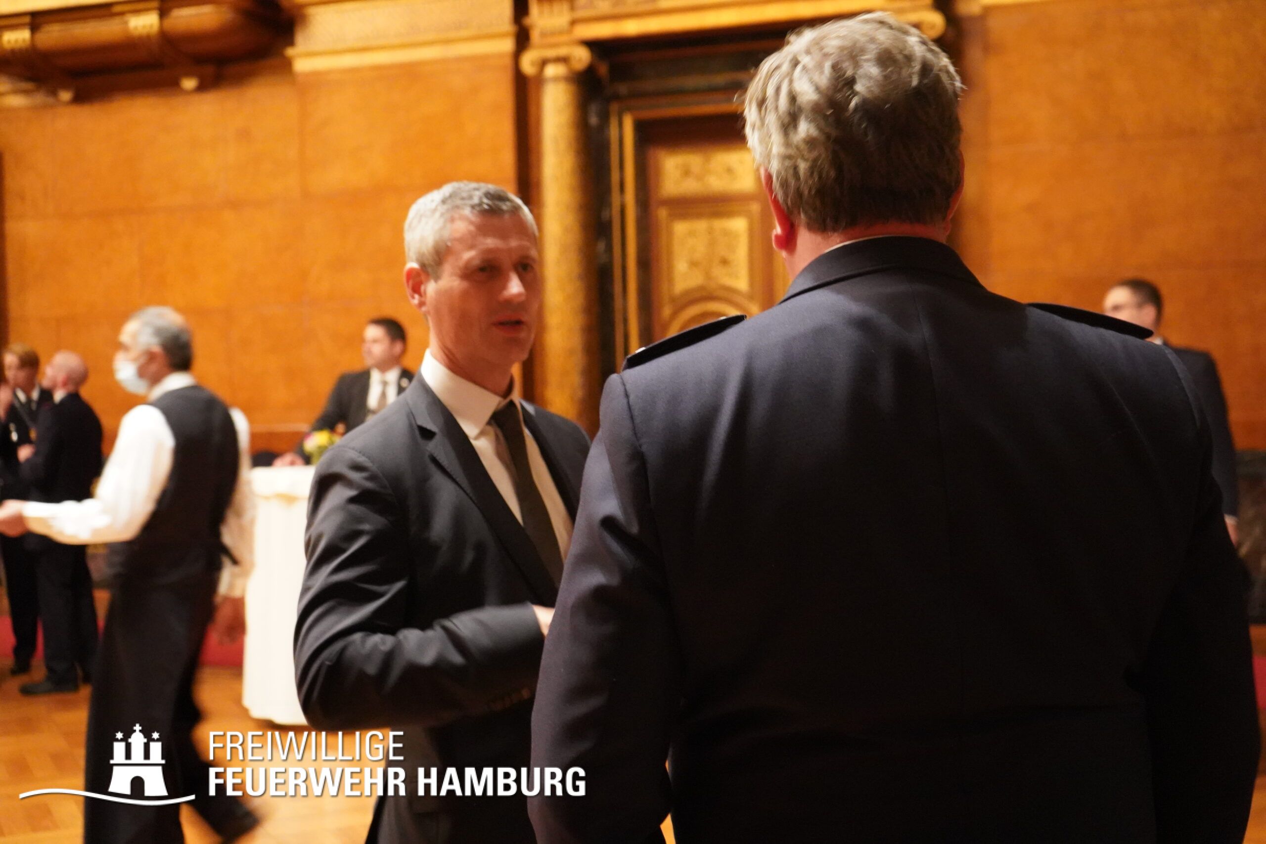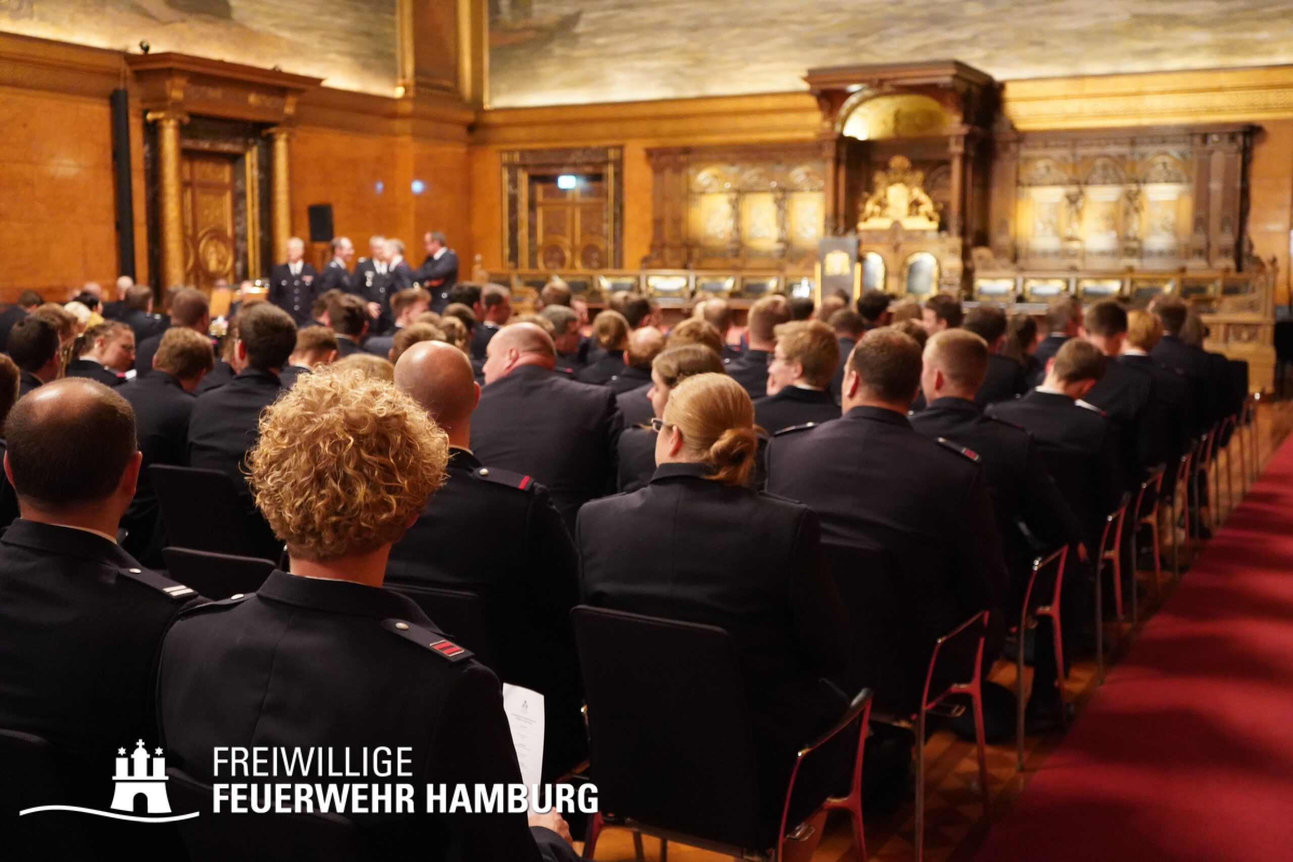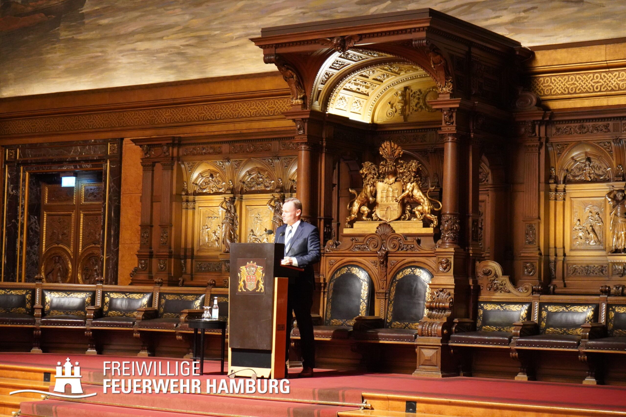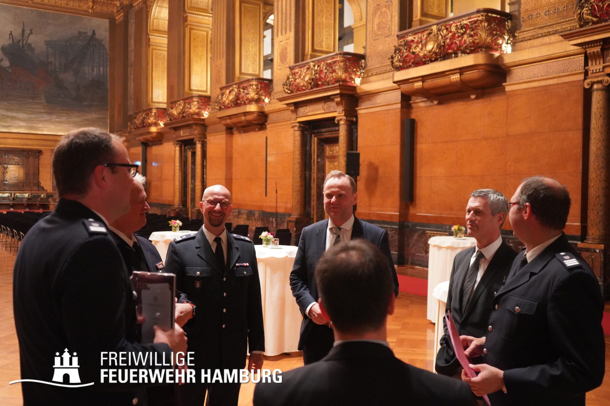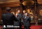 Bereits vor Beginn der Veranstaltung war der große Festsaal des Hamburger Rathauses gefüllt mit guter Laune und die stimmungsvolle Musik der kleinen Besetzung des Landesfeuerwehrorchesters rundete die Atmosphäre ab.