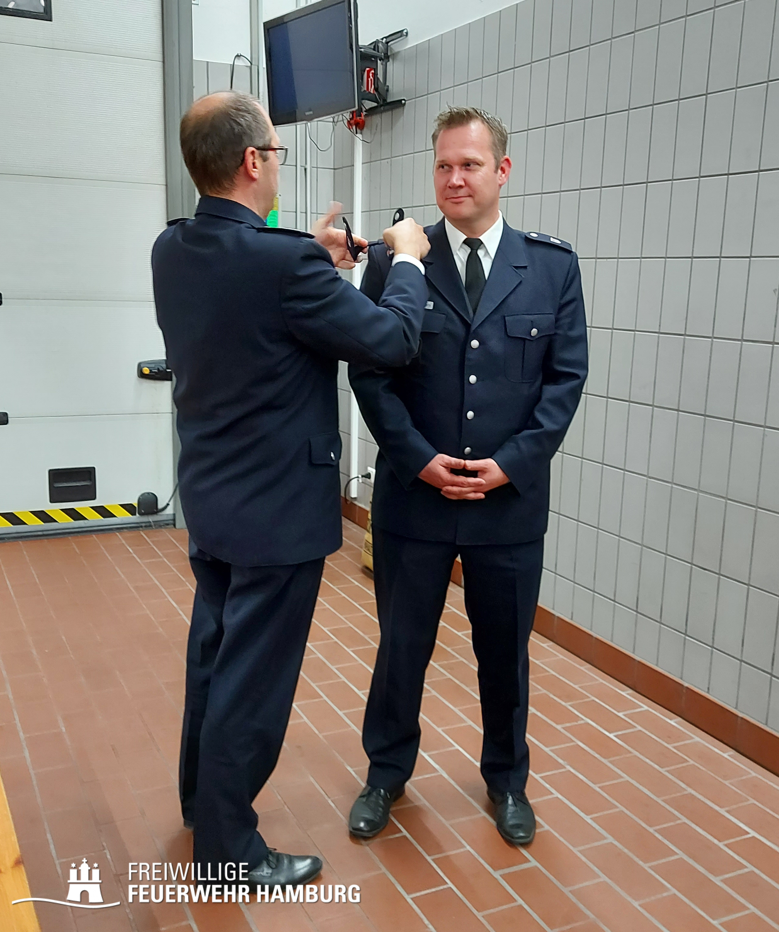 Zum Abschluss der Bereichsführer-Sitzung am 1. November, die in der Fahrzeugremise der Freiwilligen Feuerwehr Eimsbüttel stattfand, überraschte Landesbereichsführer Harald Burghart die anwesenden Bereichsführer, indem er ihnen neue Dienstgradabzeichen für ihre Funktion überreichte.