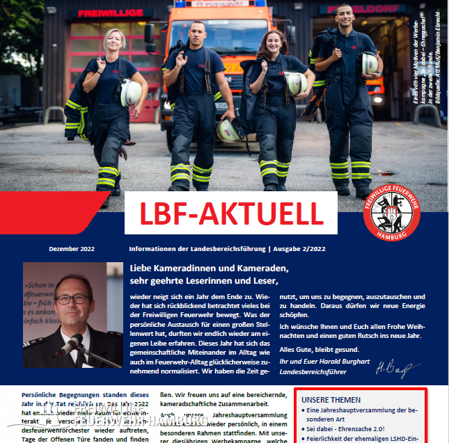 In der Winterausgabe 2022 der LBF-Aktuell geht es unter anderem um unsere Jahreshauptversammlung, um "Sei dabei - Ehrensache!" 2.0, um das Jubiläum unserer LSHD-Einheiten, unsere Bauvorhaben und und und ...