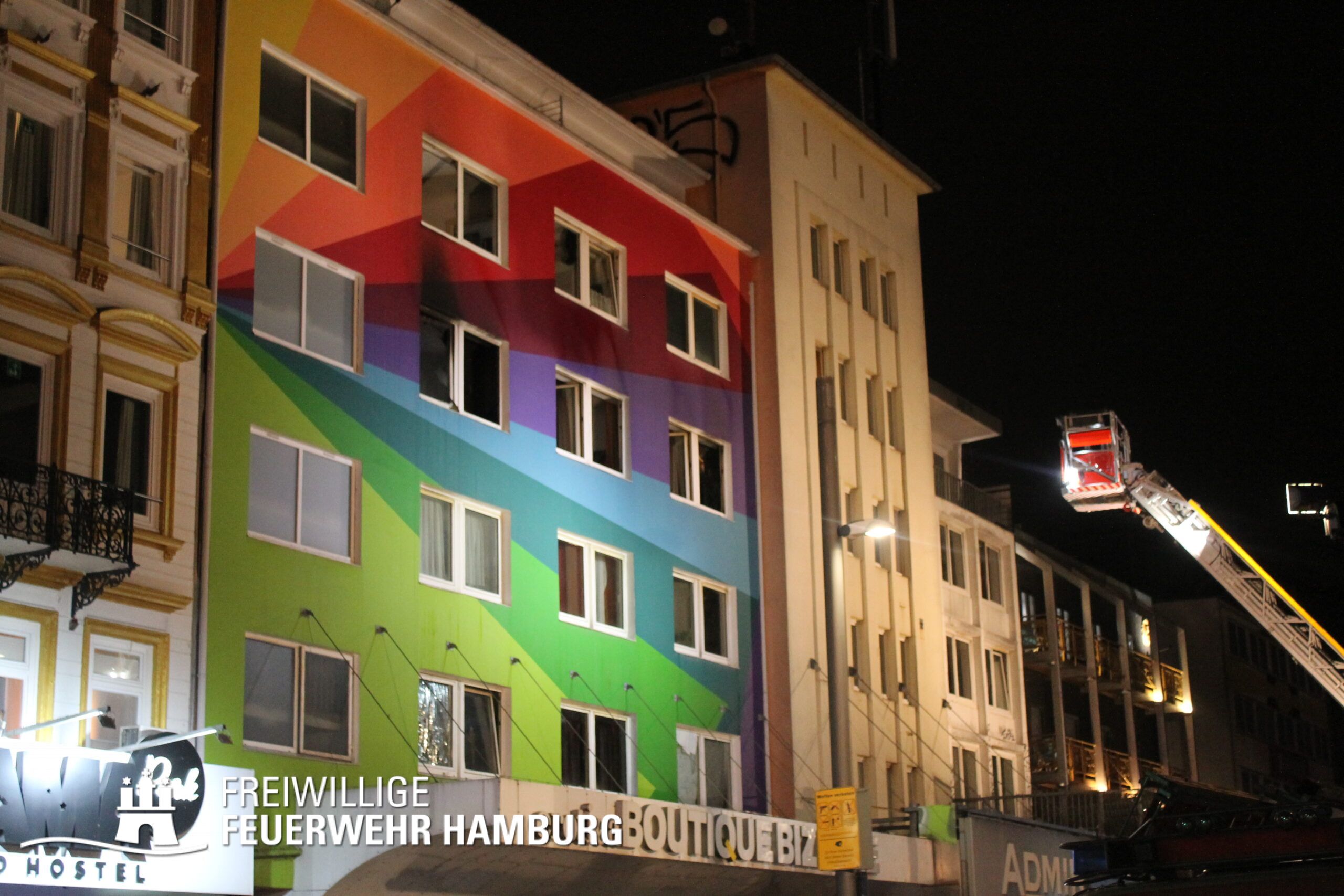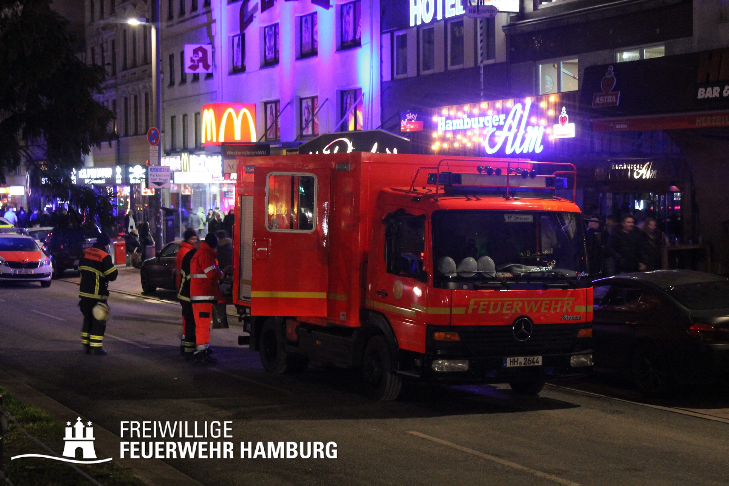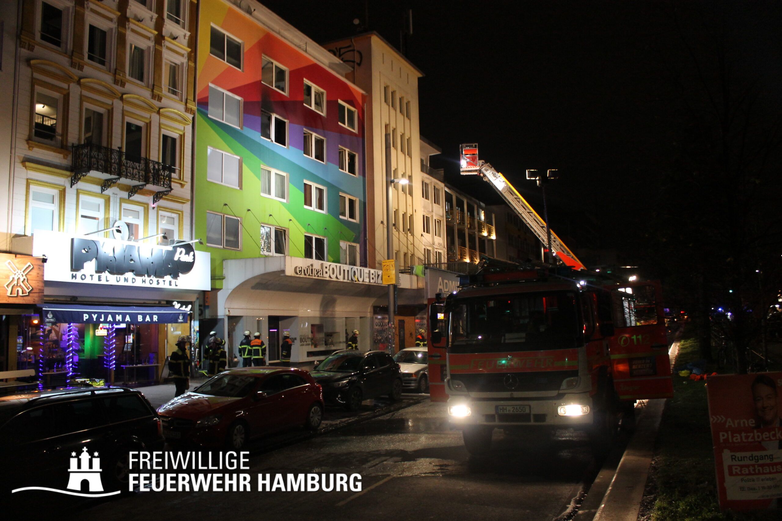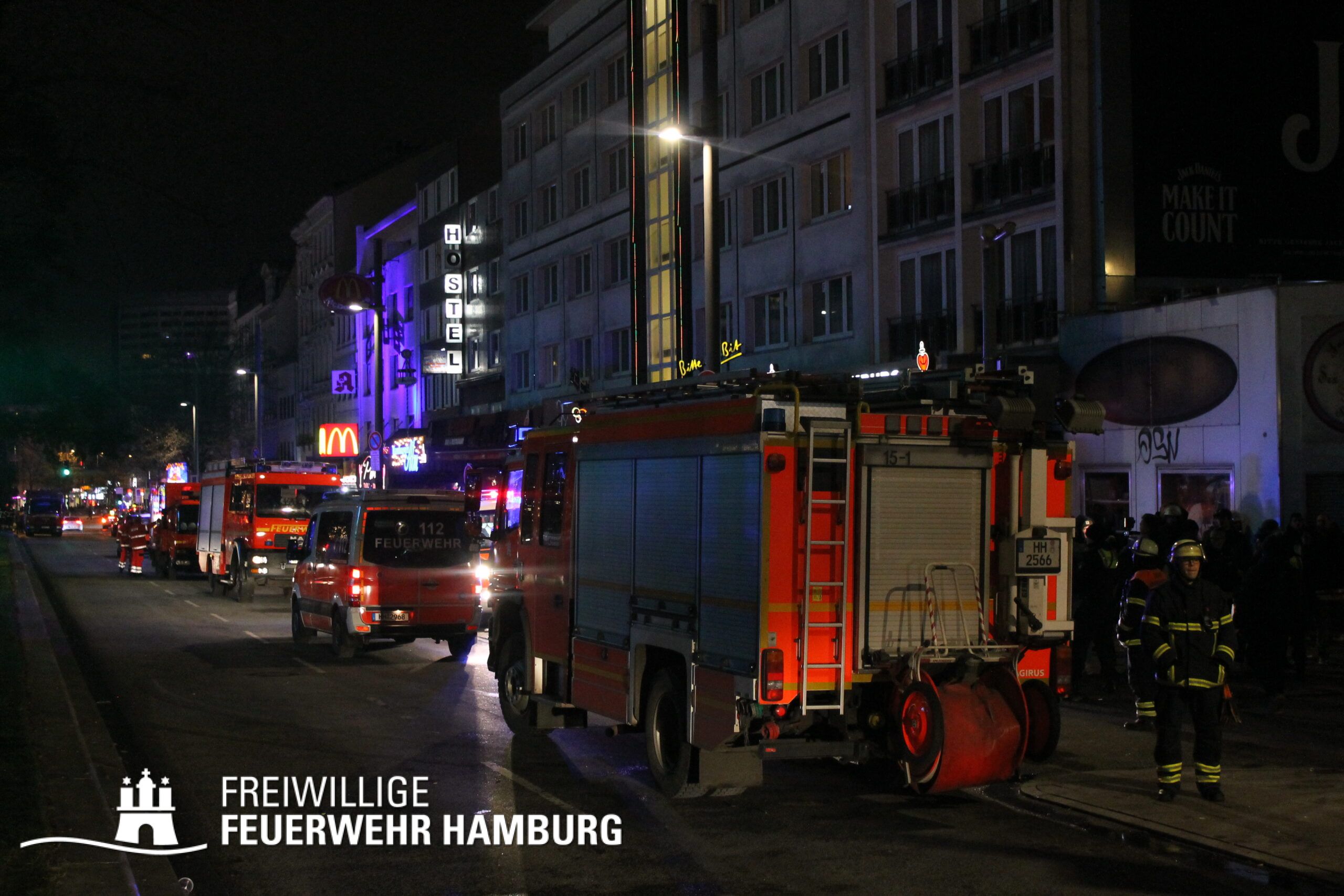 In einer Zimmervermietung war ein Brand ausgebrochen. Eine starke Rauchentwicklung drang aus mehreren Fenstern des Gebäudes. Durch den Flur im 3. OG, in dem sich auch die Brandwohnung befand, verteilte sich schnell der Brandrauch. Mehrere Personen standen bei Eintreffen der Einsatzkräfte an Fenstern, aus dem Rauch drang und teilweise auch Flammen sichtbar waren. Noch auf der Anfahrt gab es eine Adressänderung durch die Leitstelle, da sich die Gebäudefront an der Reeperbahn befand. Der erste Löschzug wurde über die Seilerstraße an das Objekt geschickt, der zweite Löschzug über die Reeperbahn. Auf der Gebäudevorderseite wurden diverse Personen über eine Drehleiter sowie das Treppenhaus gerettet. Auf der Gebäuderückseite wurden ebenfalls Personen gerettet, da eine Drehleiter allerdings nicht aufgestellt werden konnte, passierte die Rettung hier jedoch über tragbare Leitern. Als eine Herausforderung für die Einsatzkräfte stellte sich heraus, dass über die Leitern erst auf ein Vordach bzw. Gebäudedach geklettert werden musste und von da aus die tragbaren Leitern an das betroffene Gebäude gestellt werden konnte. Zu Beginn sprang hier eine Person aus dem 3. OG und verletzte sich dabei schwer am Bein. Insgesamt wurden ca. 45 Personen durch die Feuerwehr gerettet und in einem HVV Bus sowie dem GRTW (Großraumrettungswagen) betreut. Die Nachlöscharbeiten zogen sich ein paar Stunden. Die Freiwillige Feuerwehr unterstützte hier massiv mit Atemschutzgeräteträgern bei der Menschenrettung sowie bei den Löscharbeiten.