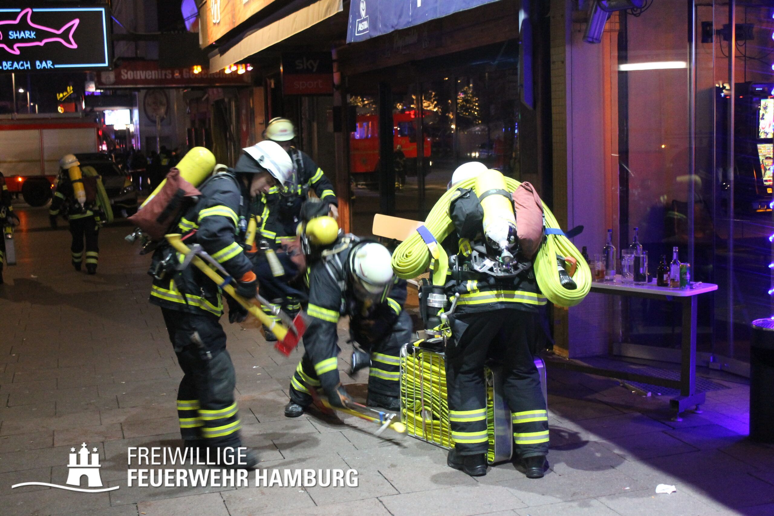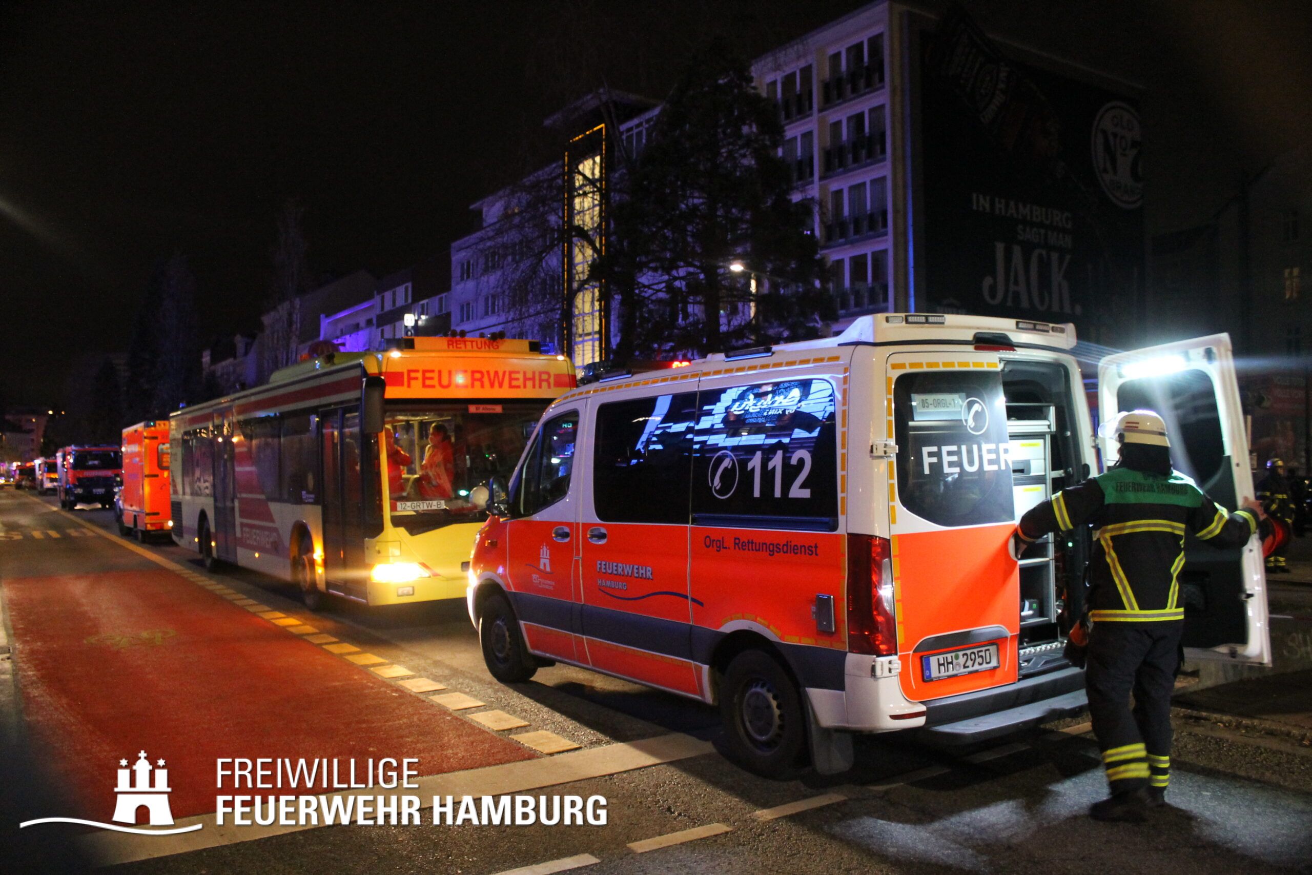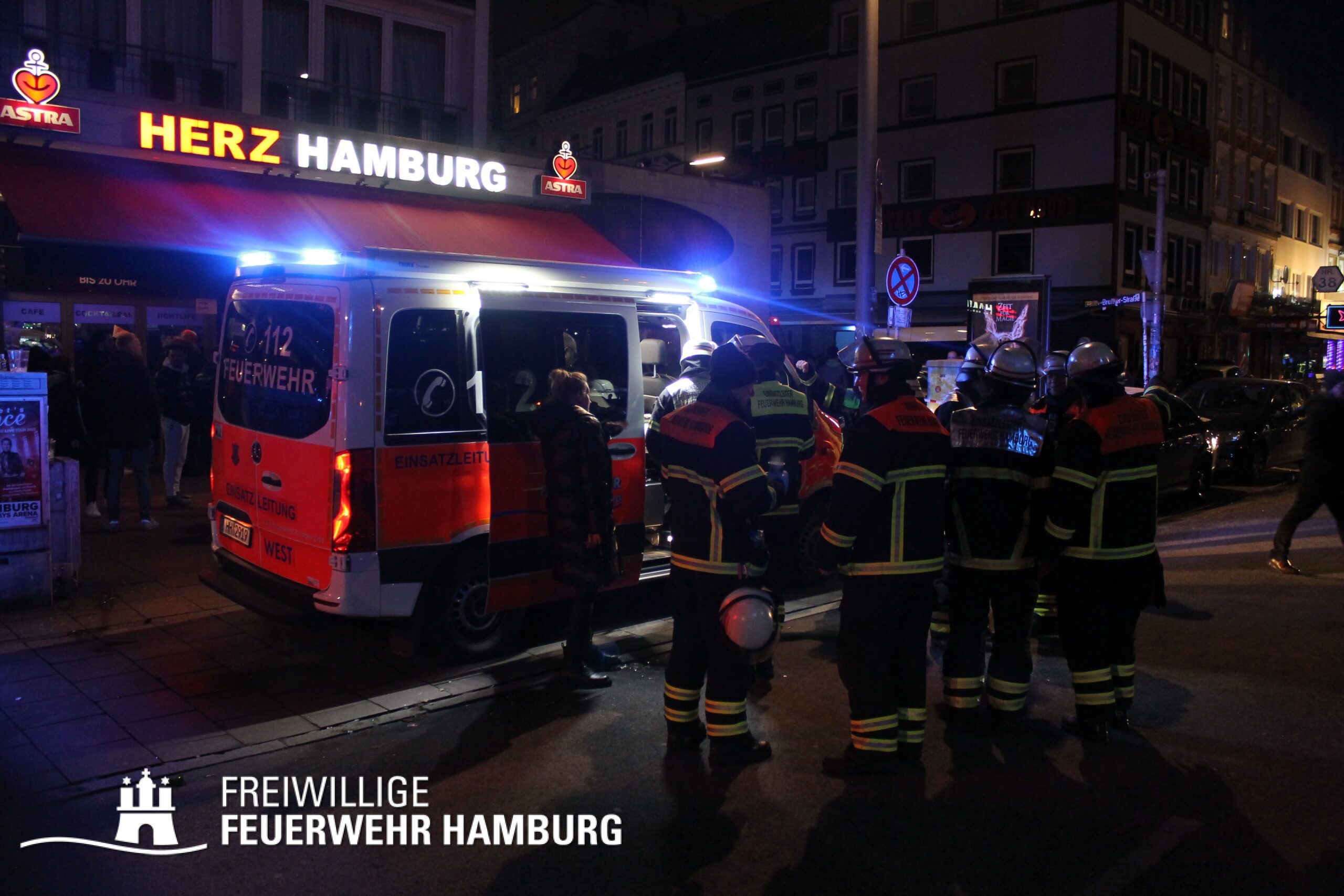 In einer Zimmervermietung war ein Brand ausgebrochen. Eine starke Rauchentwicklung drang aus mehreren Fenstern des Gebäudes. Durch den Flur im 3. OG, in dem sich auch die Brandwohnung befand, verteilte sich schnell der Brandrauch. Mehrere Personen standen bei Eintreffen der Einsatzkräfte an Fenstern, aus dem Rauch drang und teilweise auch Flammen sichtbar waren. Noch auf der Anfahrt gab es eine Adressänderung durch die Leitstelle, da sich die Gebäudefront an der Reeperbahn befand. Der erste Löschzug wurde über die Seilerstraße an das Objekt geschickt, der zweite Löschzug über die Reeperbahn. Auf der Gebäudevorderseite wurden diverse Personen über eine Drehleiter sowie das Treppenhaus gerettet. Auf der Gebäuderückseite wurden ebenfalls Personen gerettet, da eine Drehleiter allerdings nicht aufgestellt werden konnte, passierte die Rettung hier jedoch über tragbare Leitern. Als eine Herausforderung für die Einsatzkräfte stellte sich heraus, dass über die Leitern erst auf ein Vordach bzw. Gebäudedach geklettert werden musste und von da aus die tragbaren Leitern an das betroffene Gebäude gestellt werden konnte. Zu Beginn sprang hier eine Person aus dem 3. OG und verletzte sich dabei schwer am Bein. Insgesamt wurden ca. 45 Personen durch die Feuerwehr gerettet und in einem HVV Bus sowie dem GRTW (Großraumrettungswagen) betreut. Die Nachlöscharbeiten zogen sich ein paar Stunden. Die Freiwillige Feuerwehr unterstützte hier massiv mit Atemschutzgeräteträgern bei der Menschenrettung sowie bei den Löscharbeiten.
