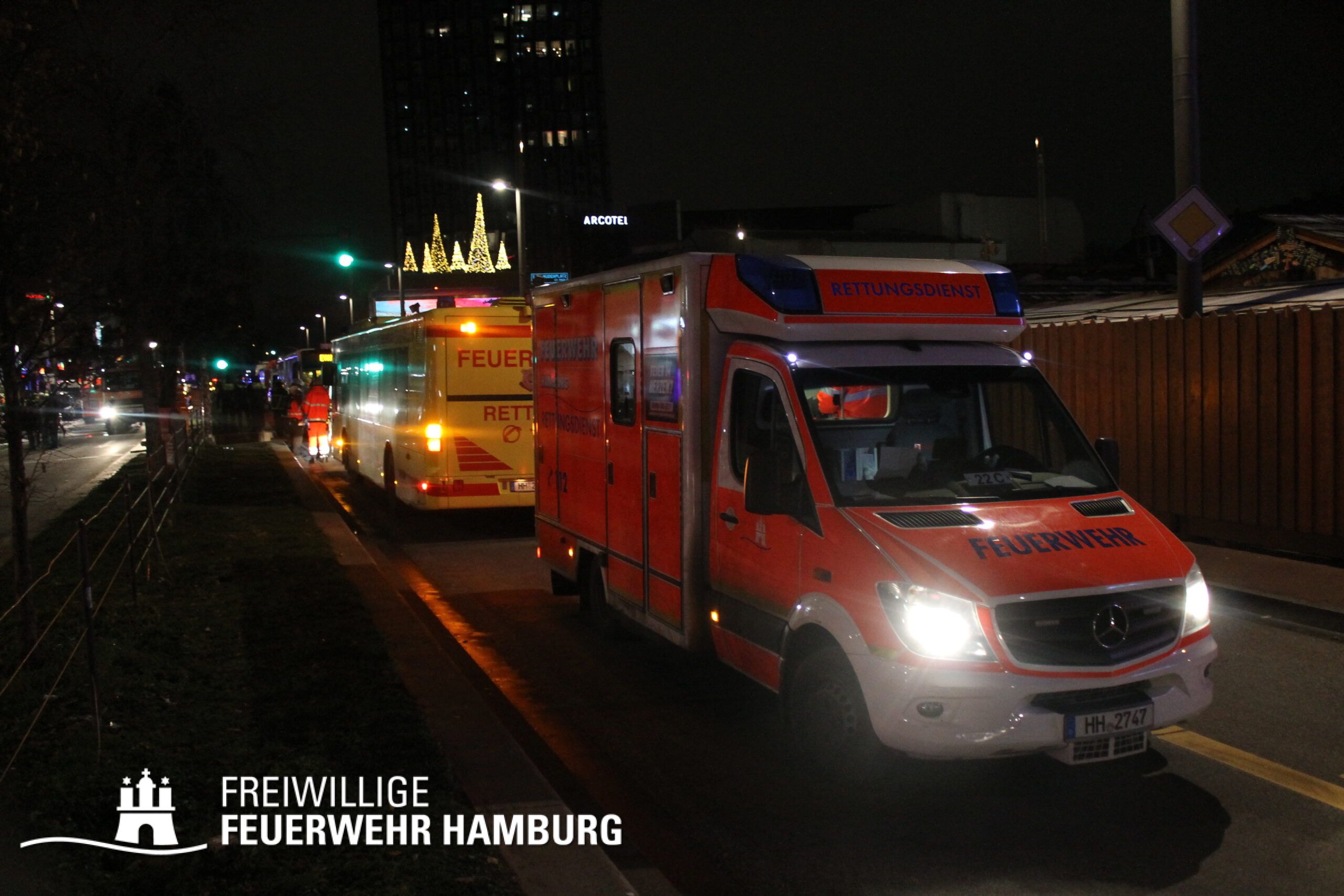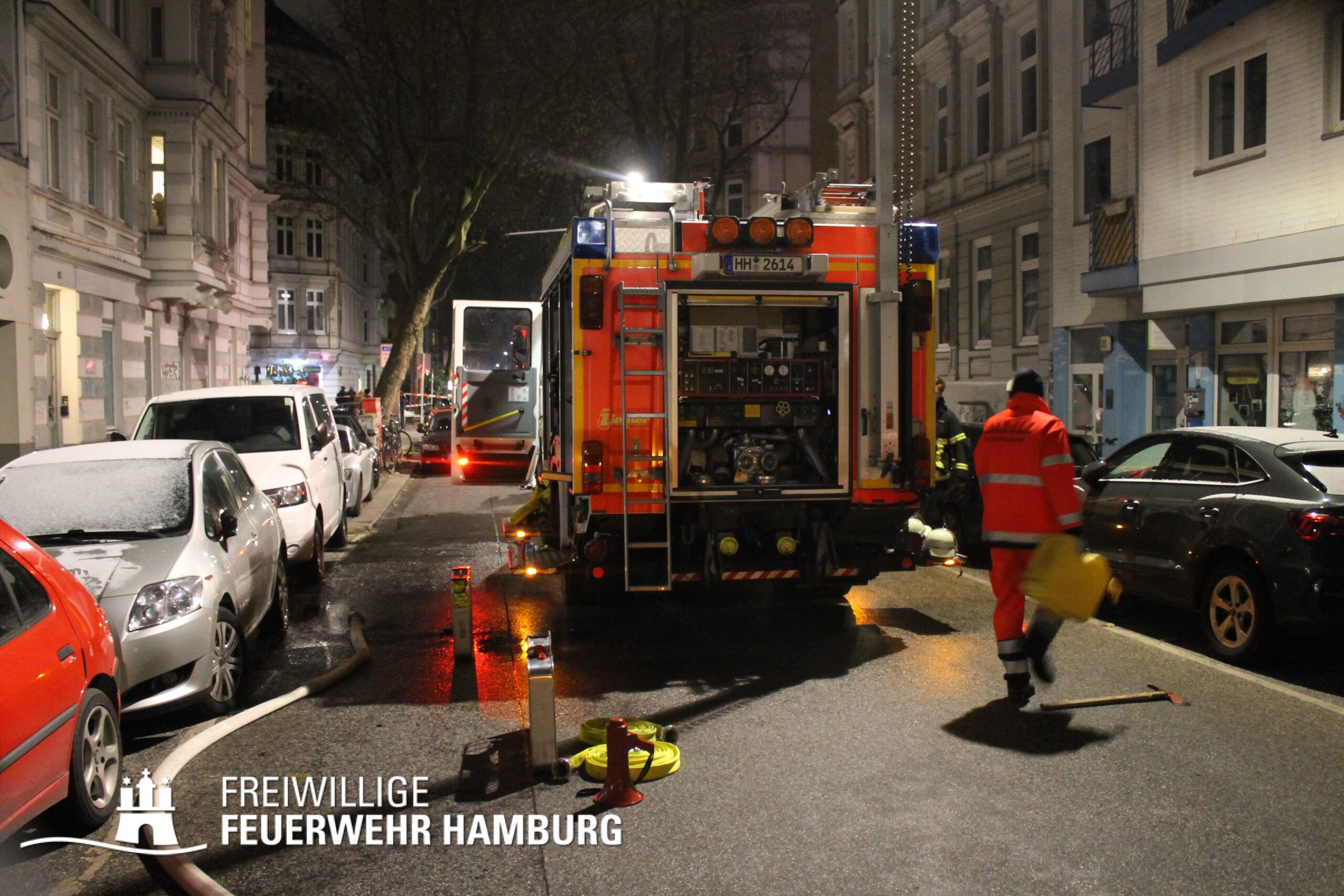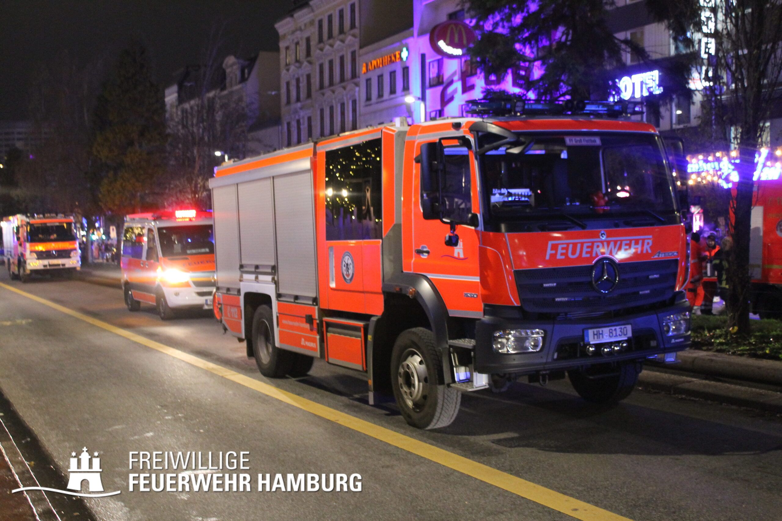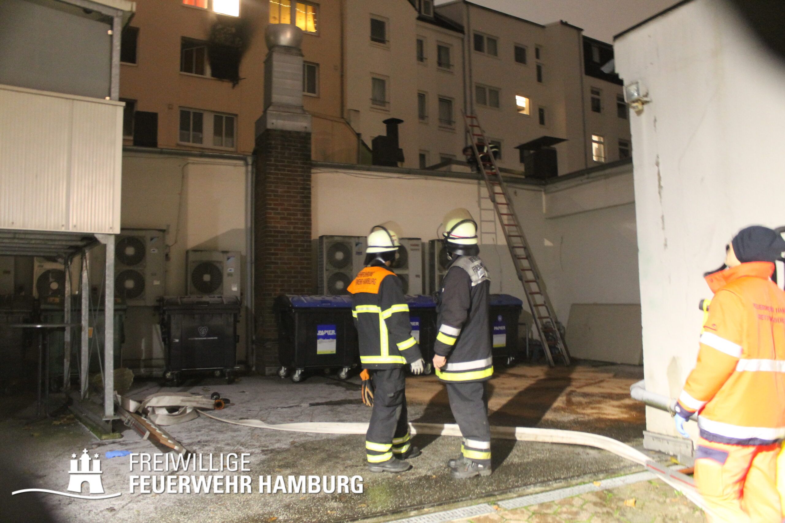 In einer Zimmervermietung war ein Brand ausgebrochen. Eine starke Rauchentwicklung drang aus mehreren Fenstern des Gebäudes. Durch den Flur im 3. OG, in dem sich auch die Brandwohnung befand, verteilte sich schnell der Brandrauch. Mehrere Personen standen bei Eintreffen der Einsatzkräfte an Fenstern, aus dem Rauch drang und teilweise auch Flammen sichtbar waren. Noch auf der Anfahrt gab es eine Adressänderung durch die Leitstelle, da sich die Gebäudefront an der Reeperbahn befand. Der erste Löschzug wurde über die Seilerstraße an das Objekt geschickt, der zweite Löschzug über die Reeperbahn. Auf der Gebäudevorderseite wurden diverse Personen über eine Drehleiter sowie das Treppenhaus gerettet. Auf der Gebäuderückseite wurden ebenfalls Personen gerettet, da eine Drehleiter allerdings nicht aufgestellt werden konnte, passierte die Rettung hier jedoch über tragbare Leitern. Als eine Herausforderung für die Einsatzkräfte stellte sich heraus, dass über die Leitern erst auf ein Vordach bzw. Gebäudedach geklettert werden musste und von da aus die tragbaren Leitern an das betroffene Gebäude gestellt werden konnte. Zu Beginn sprang hier eine Person aus dem 3. OG und verletzte sich dabei schwer am Bein. Insgesamt wurden ca. 45 Personen durch die Feuerwehr gerettet und in einem HVV Bus sowie dem GRTW (Großraumrettungswagen) betreut. Die Nachlöscharbeiten zogen sich ein paar Stunden. Die Freiwillige Feuerwehr unterstützte hier massiv mit Atemschutzgeräteträgern bei der Menschenrettung sowie bei den Löscharbeiten.