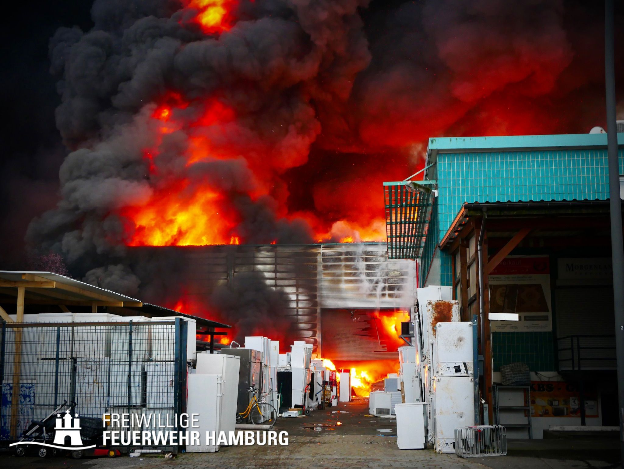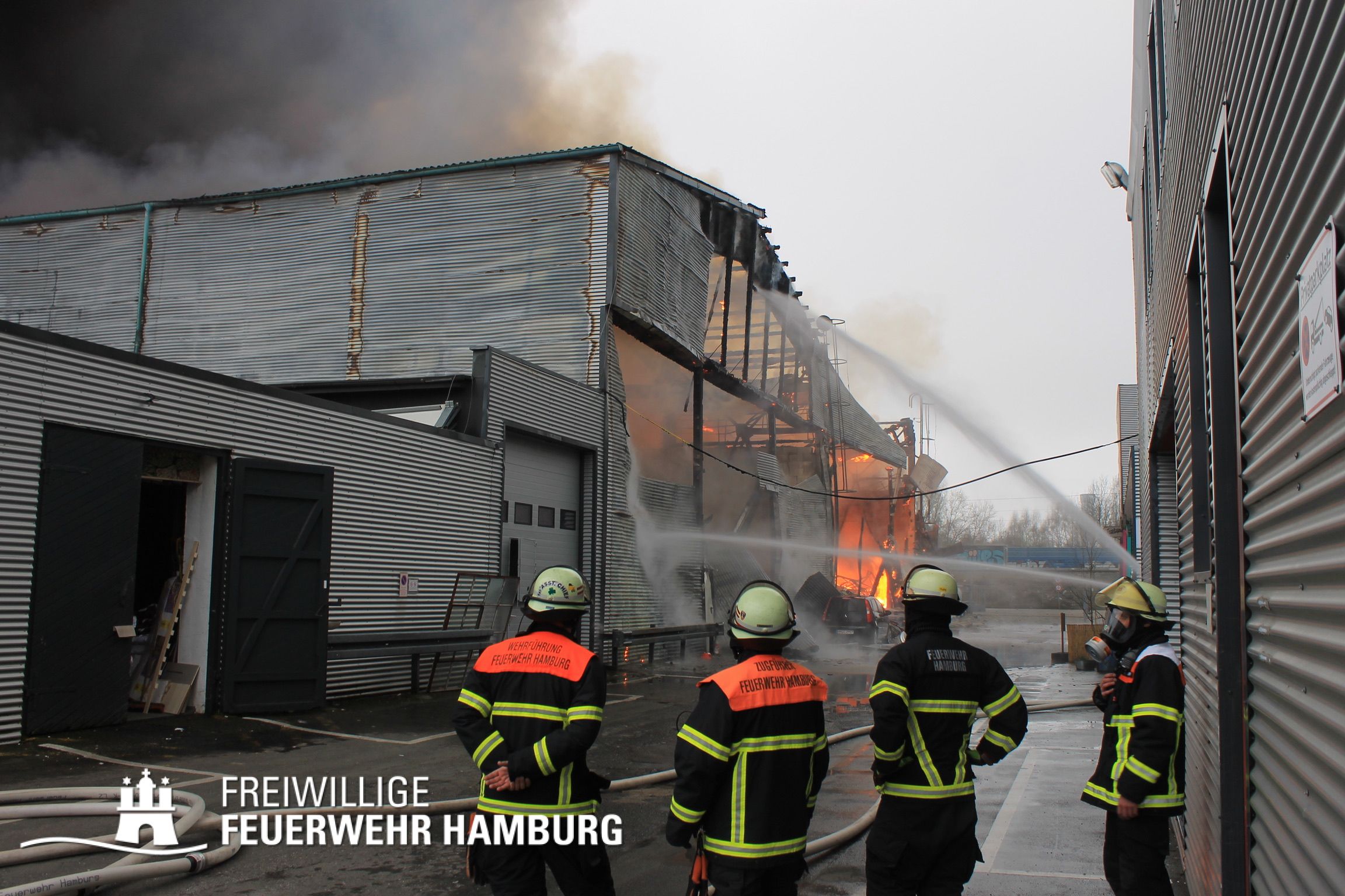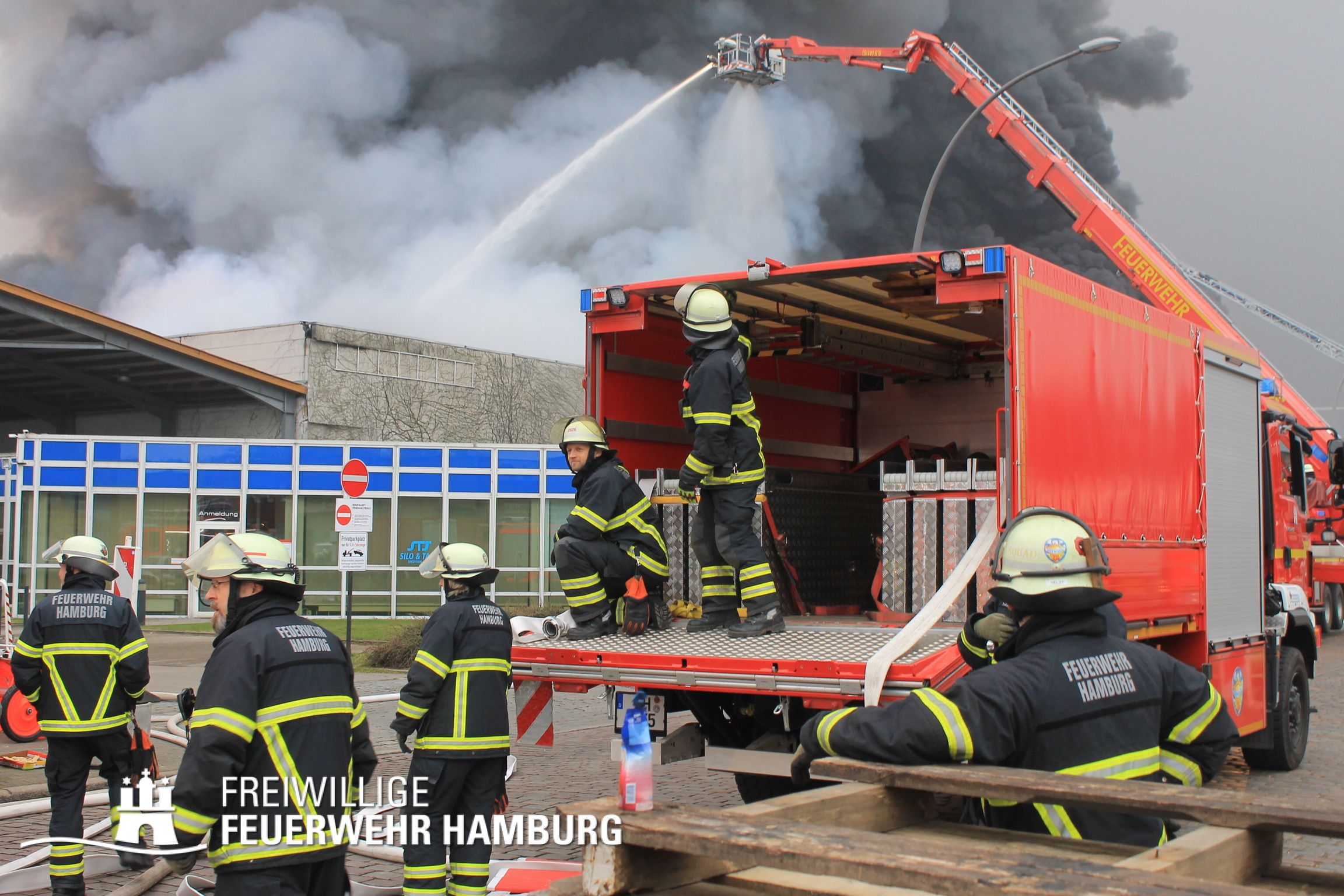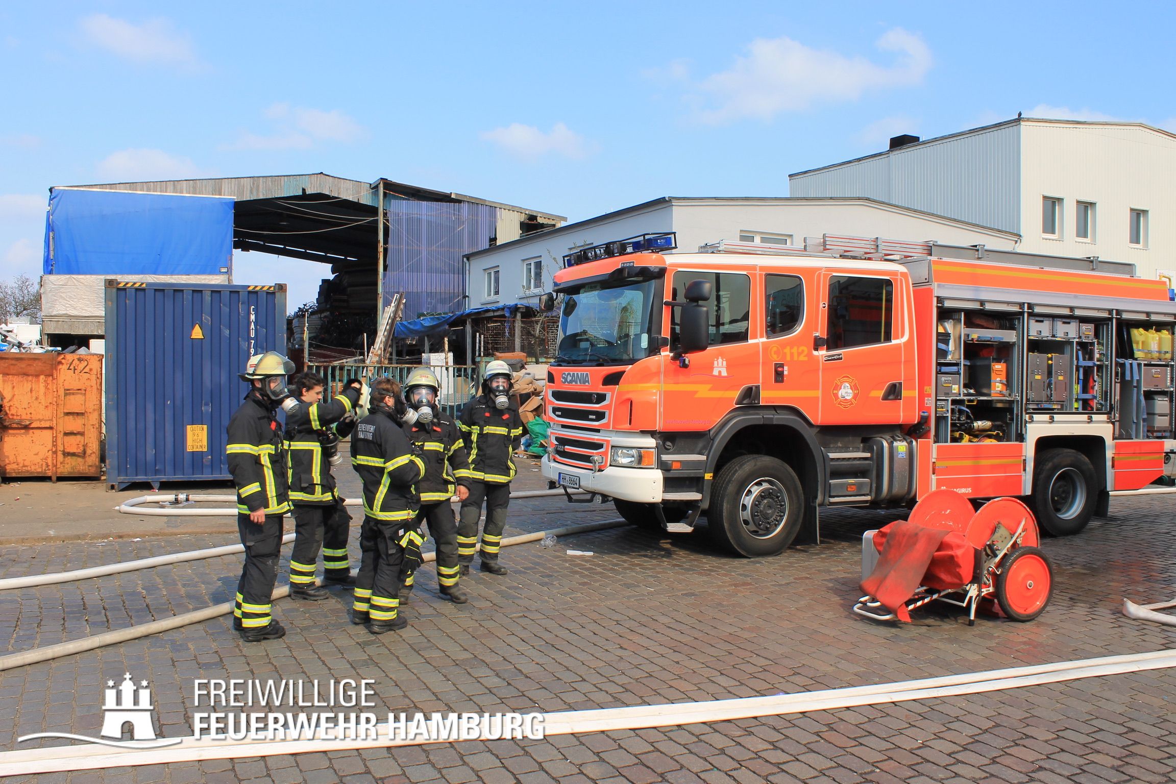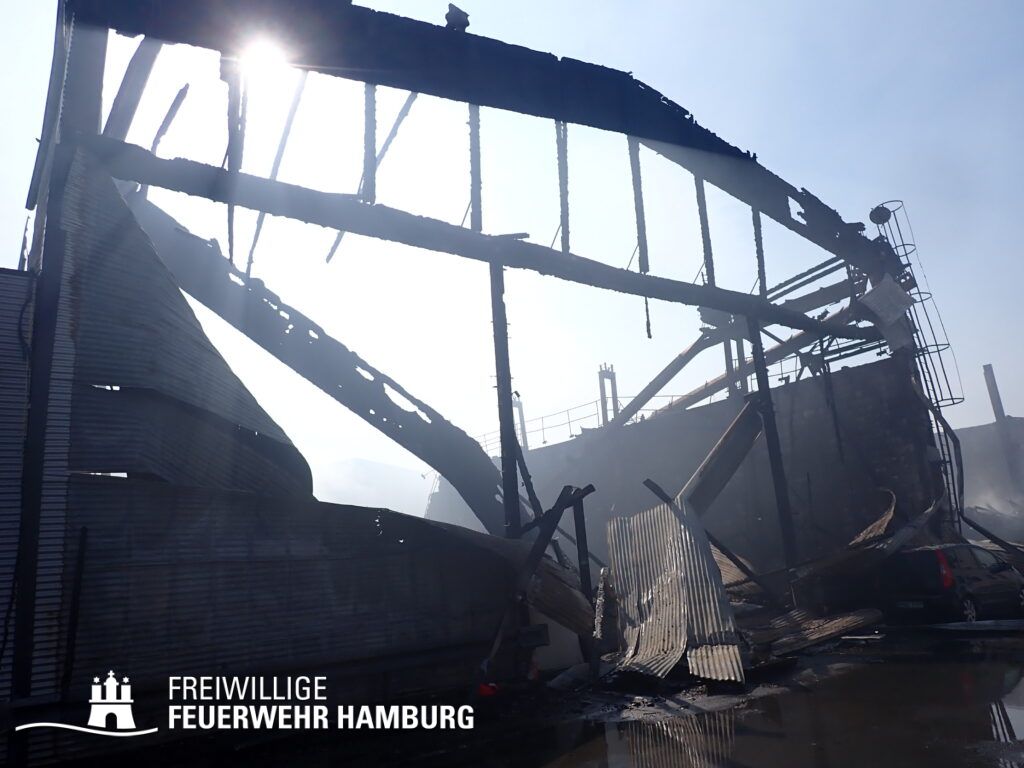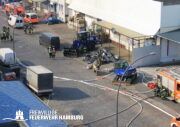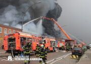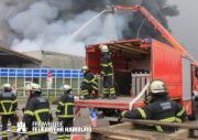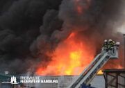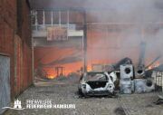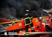 Bei einem Brand mehrerer Lagerhallen und von verschiedensten Waren auf großen Freiflächen in einem Gewerbegebiet kamen neben diversen Löschzügen und Sonderdiensten auch 54 FF und 12 Bereichsführer sowie der Landesbereichsführer der Freiwilligen Feuerwehr Hamburg über mehrere Tage zum Einsatz.