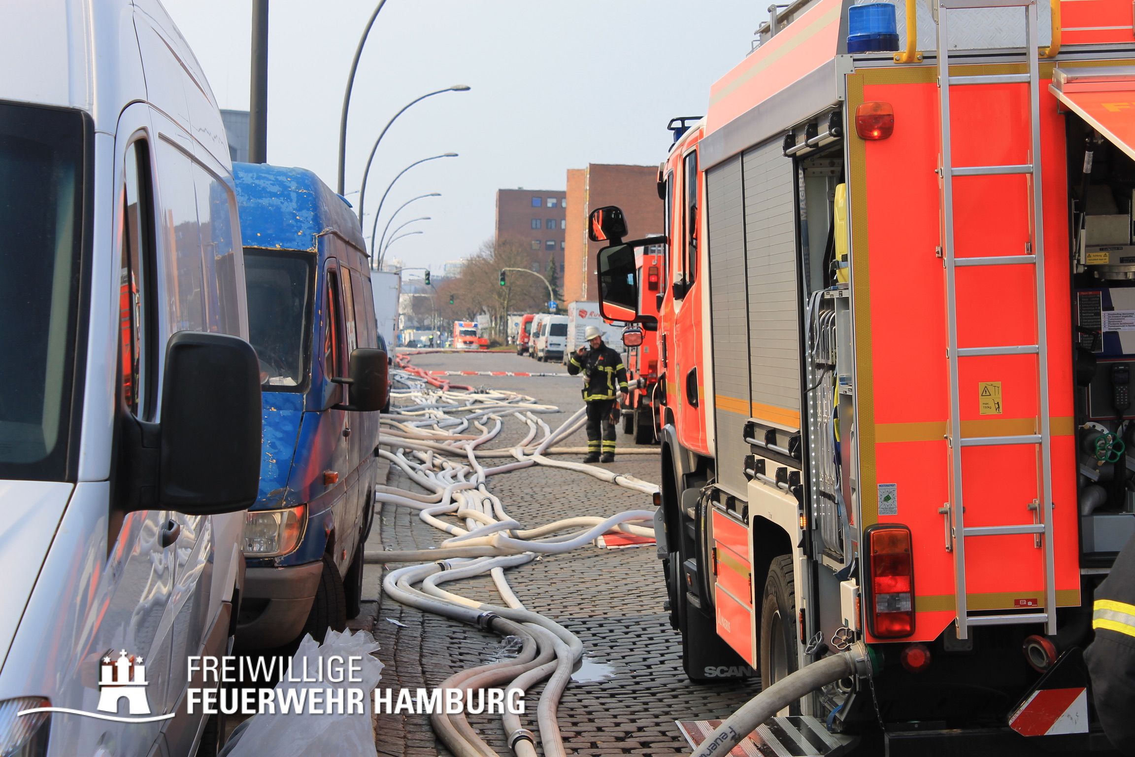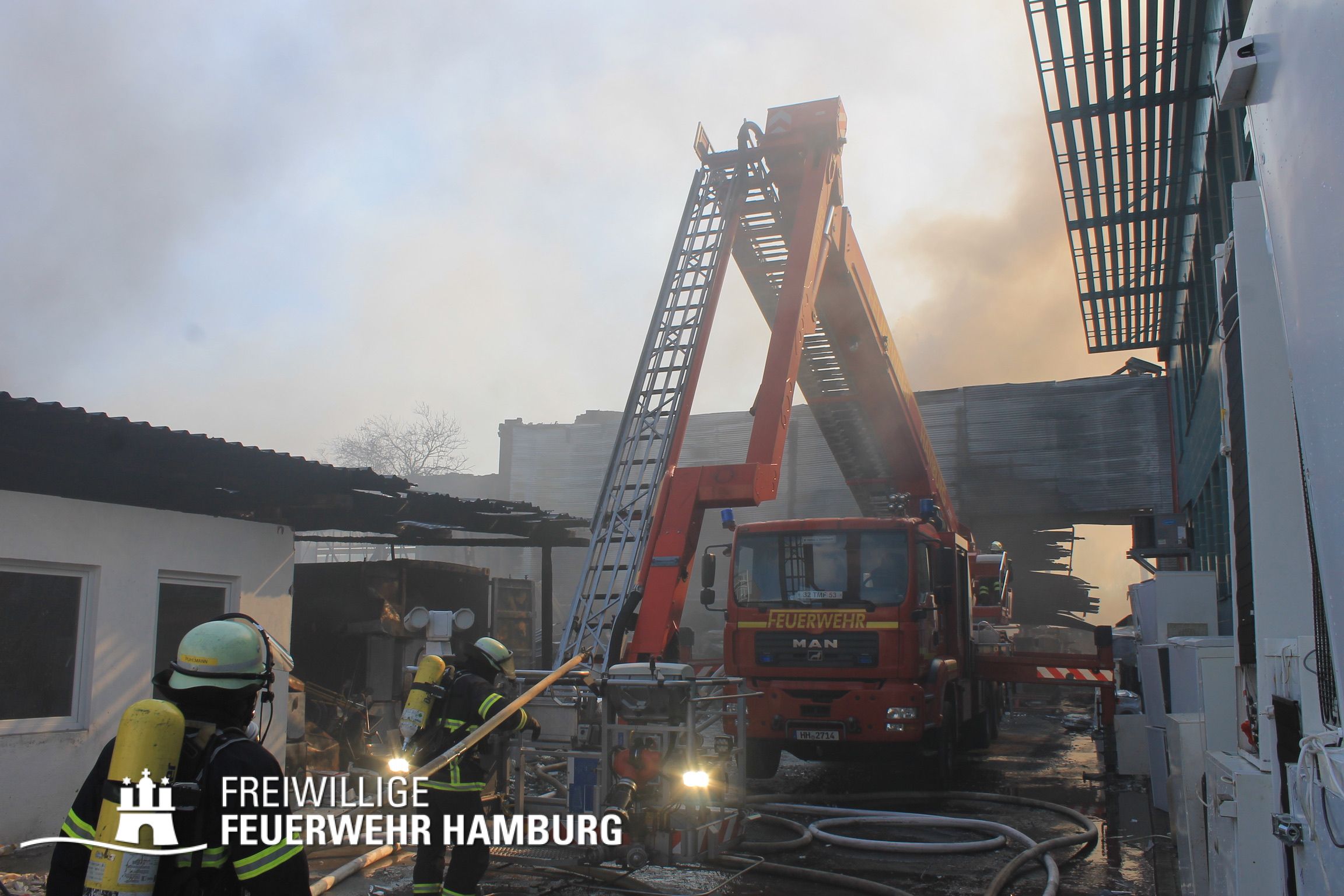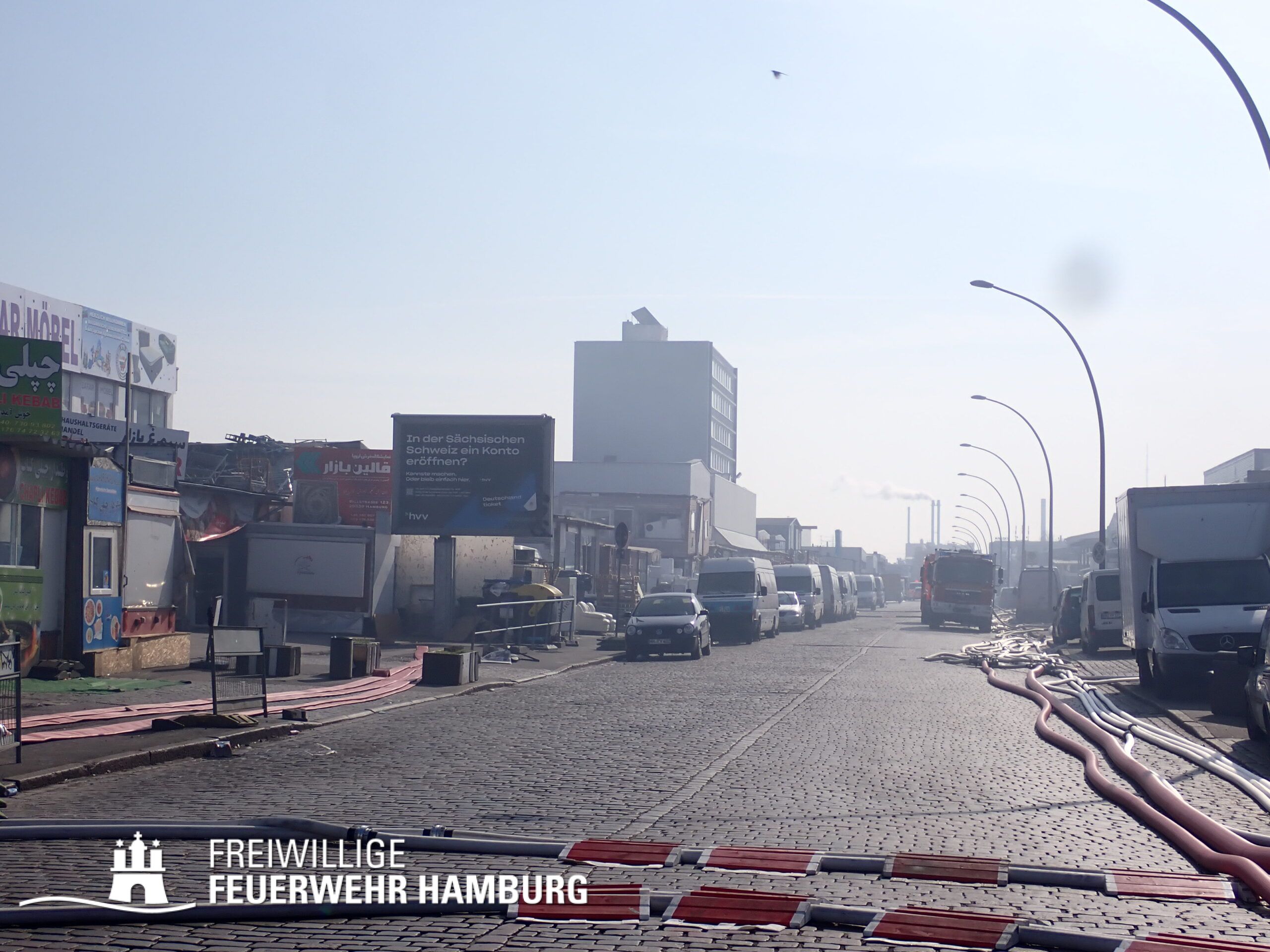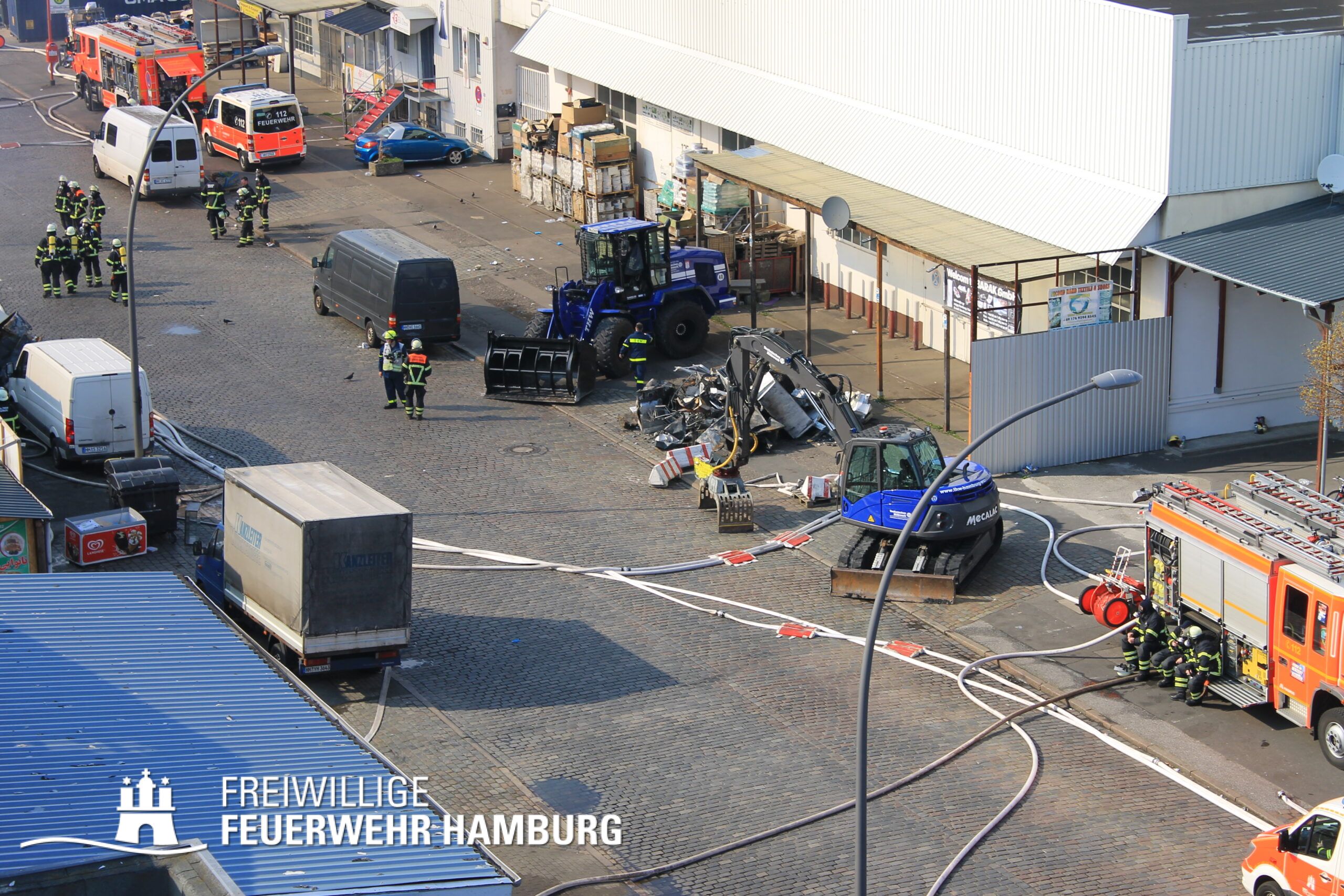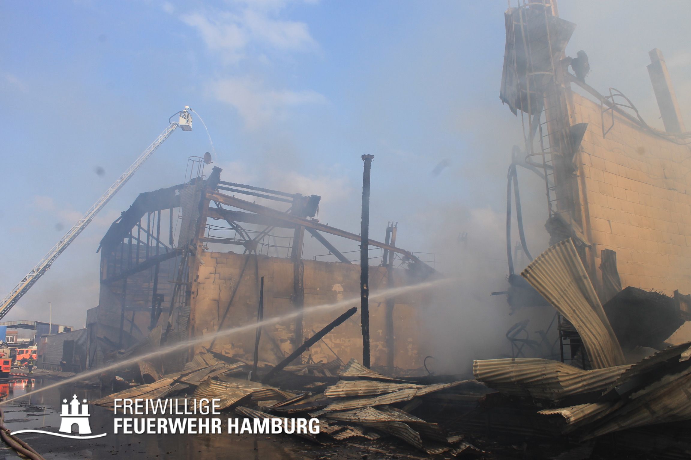 Bei einem Brand mehrerer Lagerhallen und von verschiedensten Waren auf großen Freiflächen in einem Gewerbegebiet kamen neben diversen Löschzügen und Sonderdiensten auch 54 FF und 12 Bereichsführer sowie der Landesbereichsführer der Freiwilligen Feuerwehr Hamburg über mehrere Tage zum Einsatz.