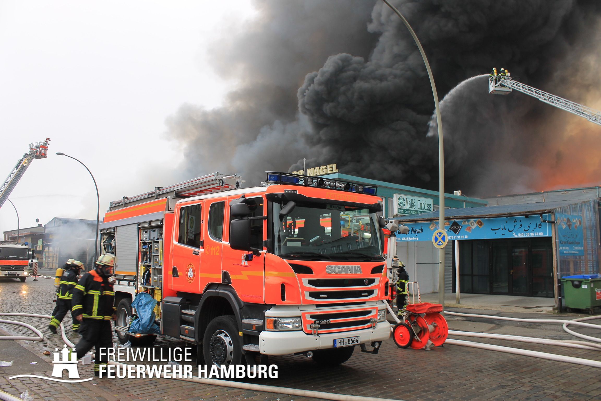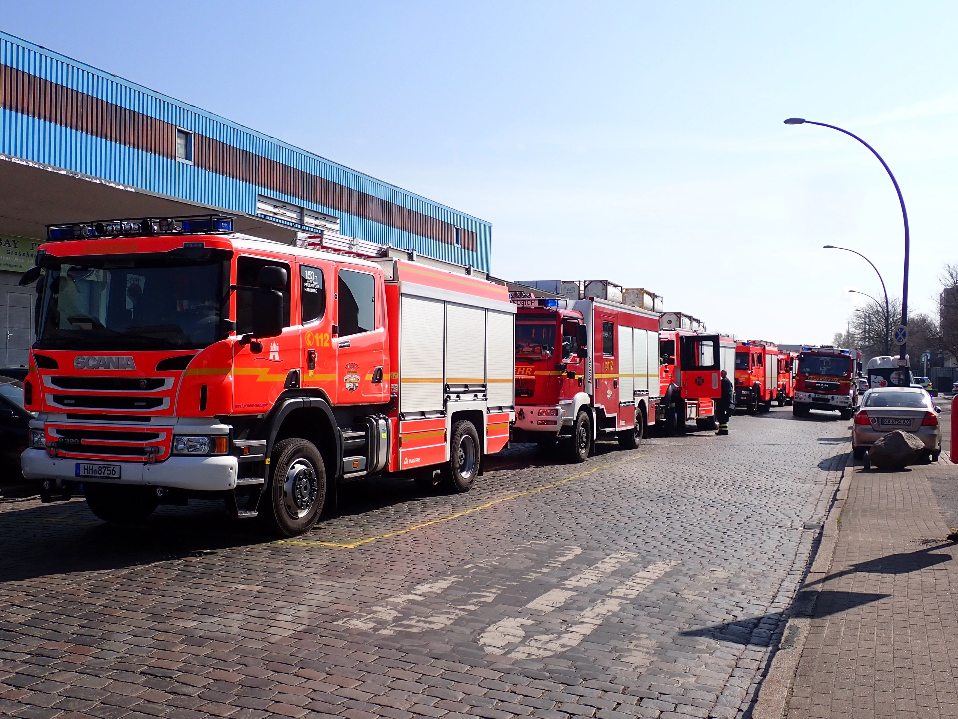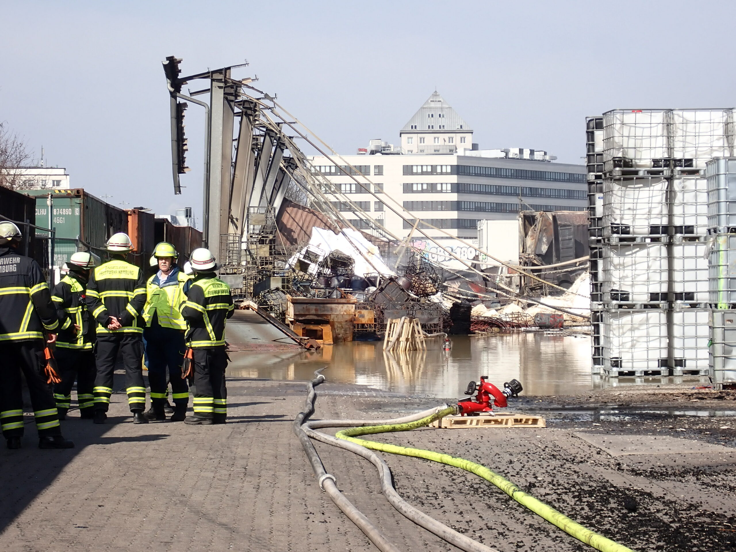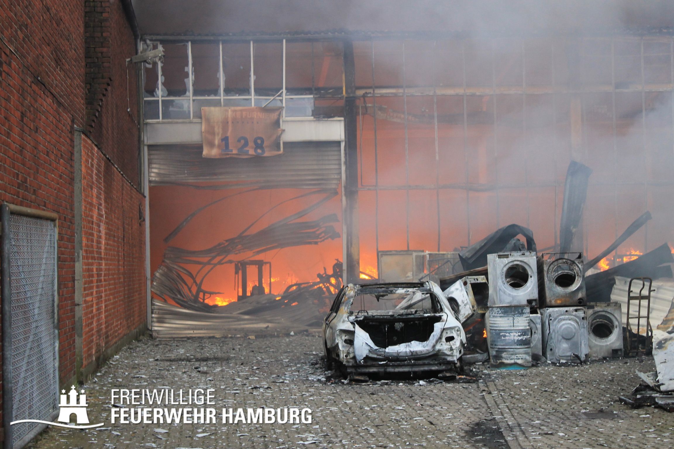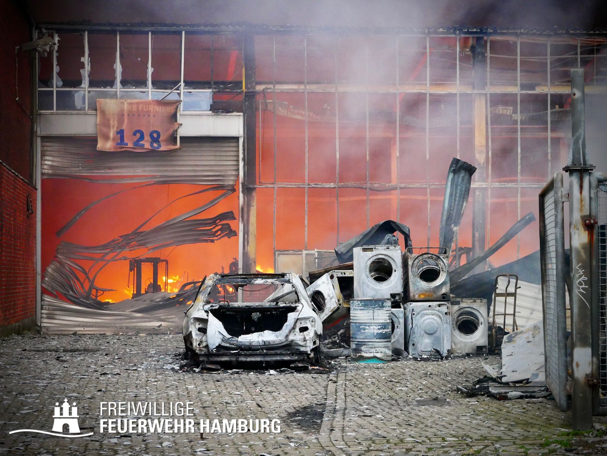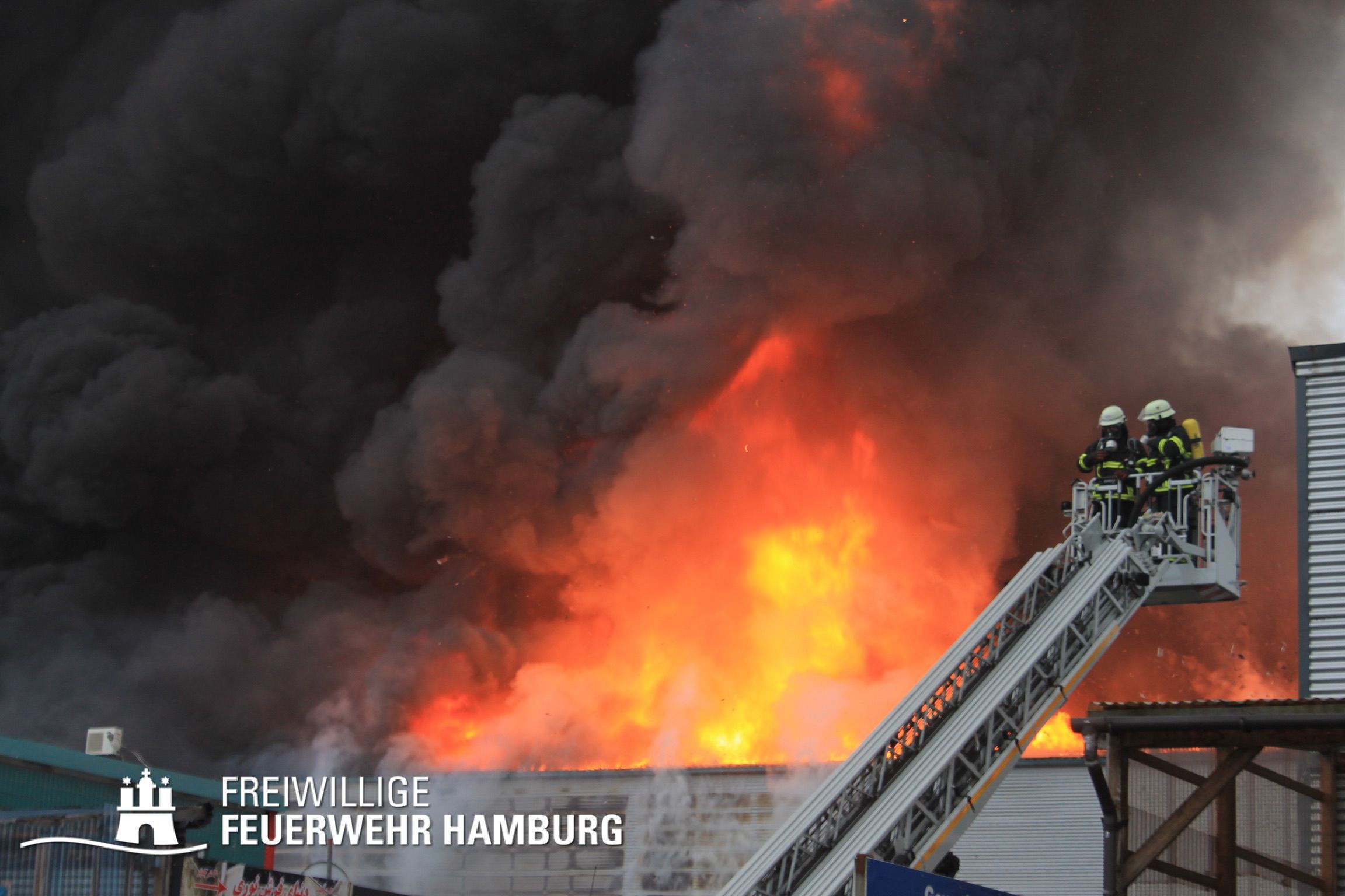 Bei einem Brand mehrerer Lagerhallen und von verschiedensten Waren auf großen Freiflächen in einem Gewerbegebiet kamen neben diversen Löschzügen und Sonderdiensten auch 54 FF und 12 Bereichsführer sowie der Landesbereichsführer der Freiwilligen Feuerwehr Hamburg über mehrere Tage zum Einsatz.