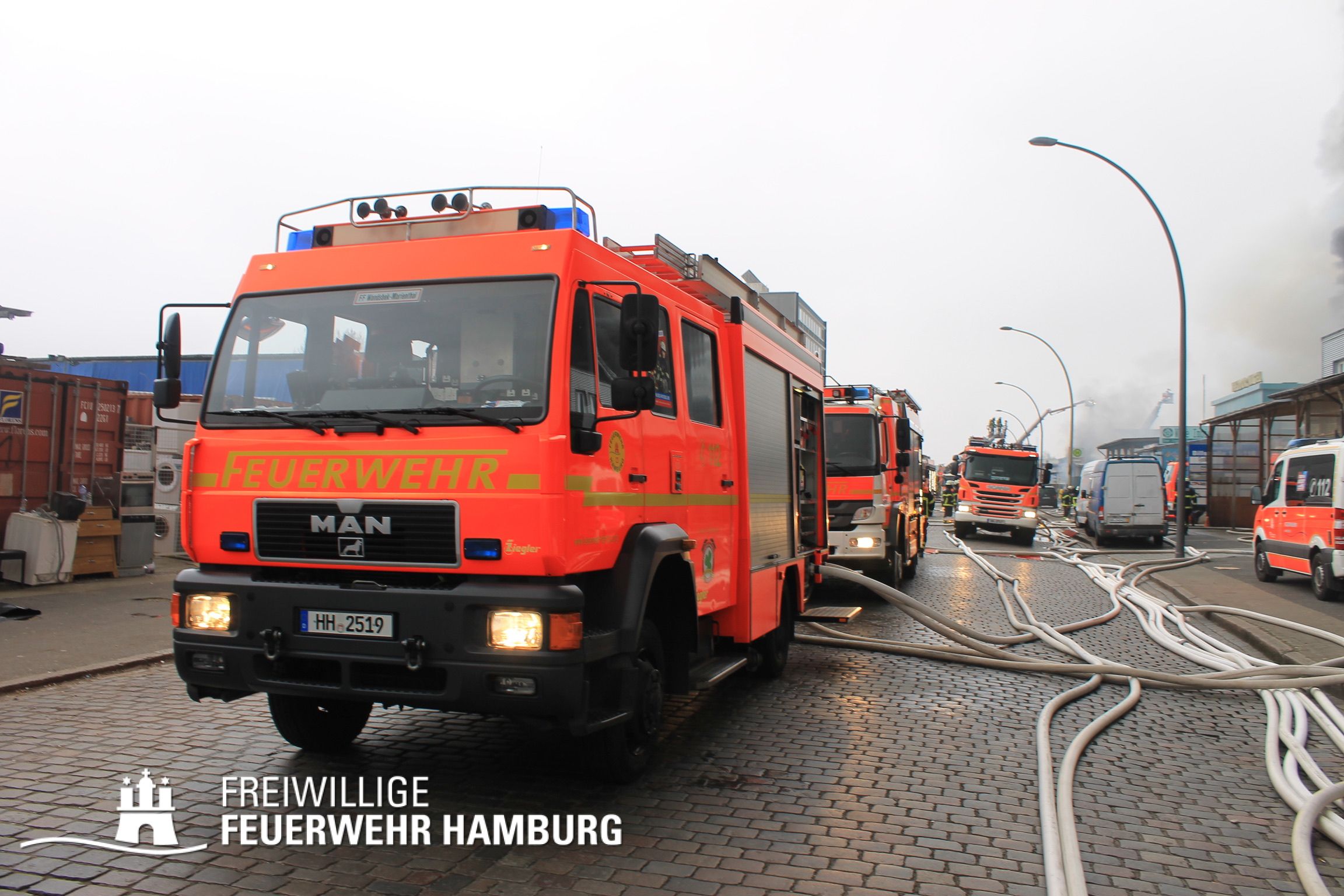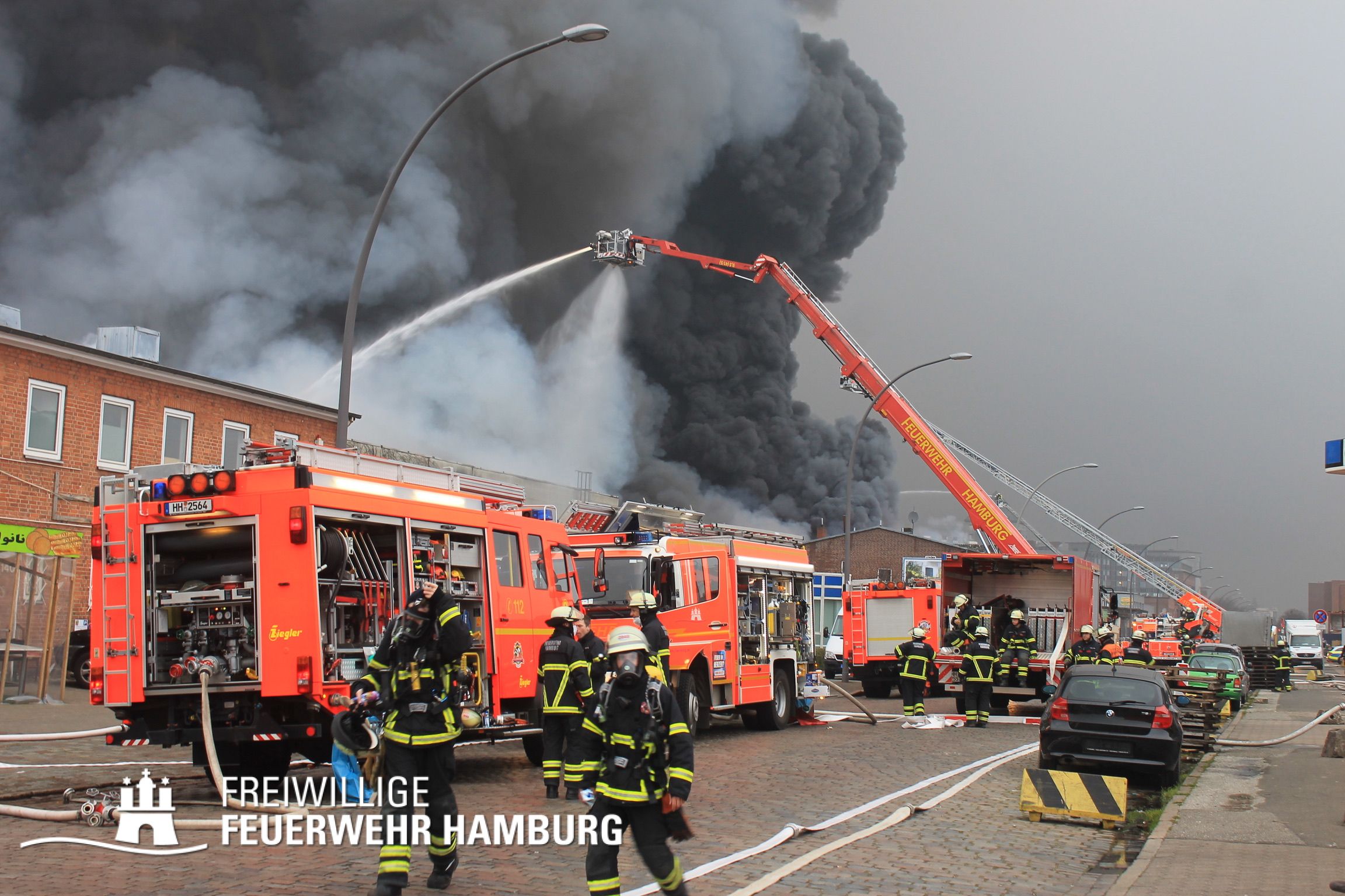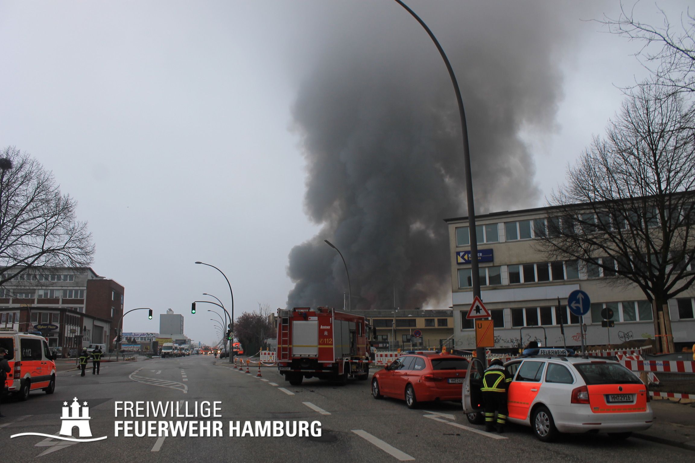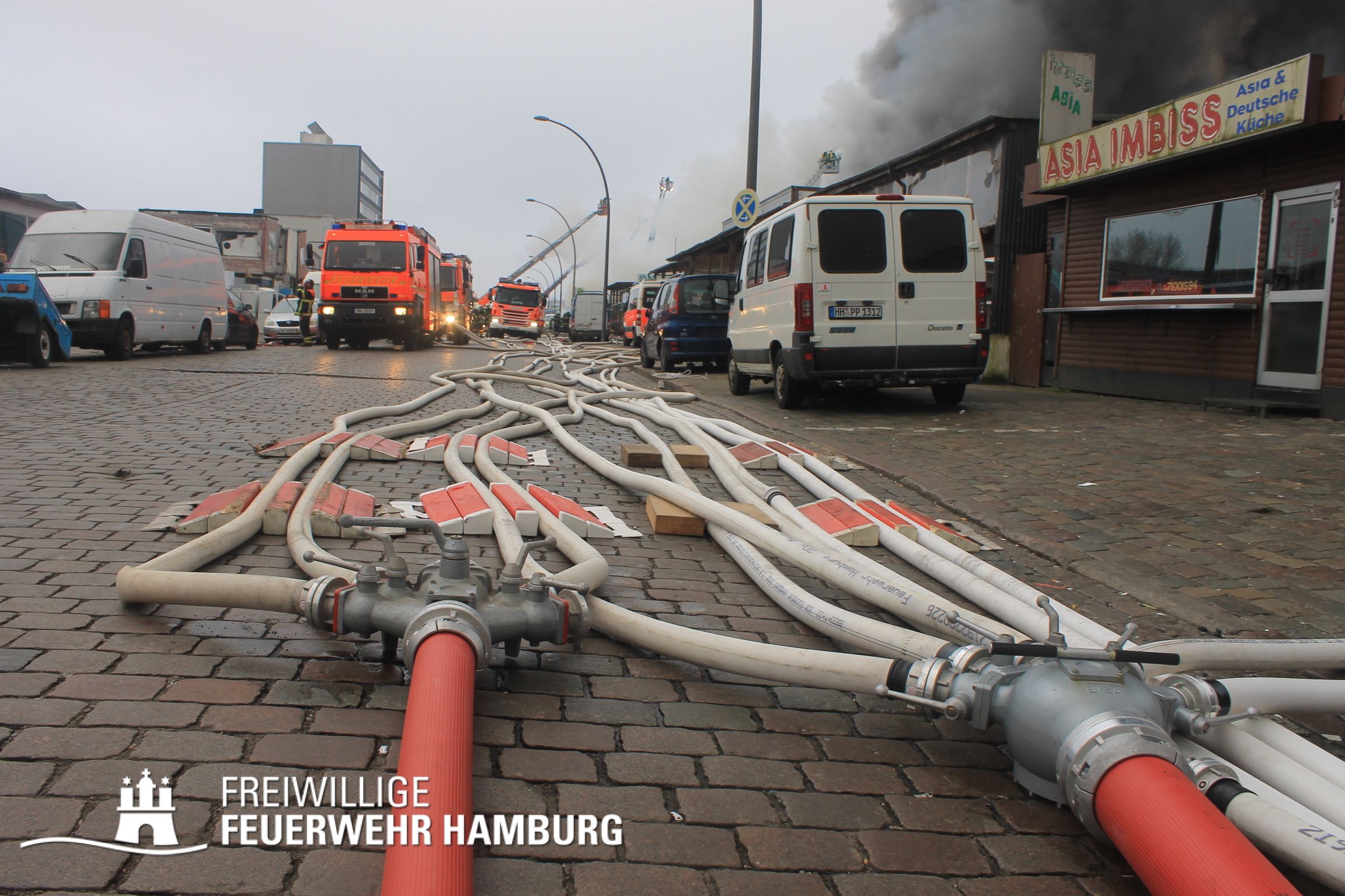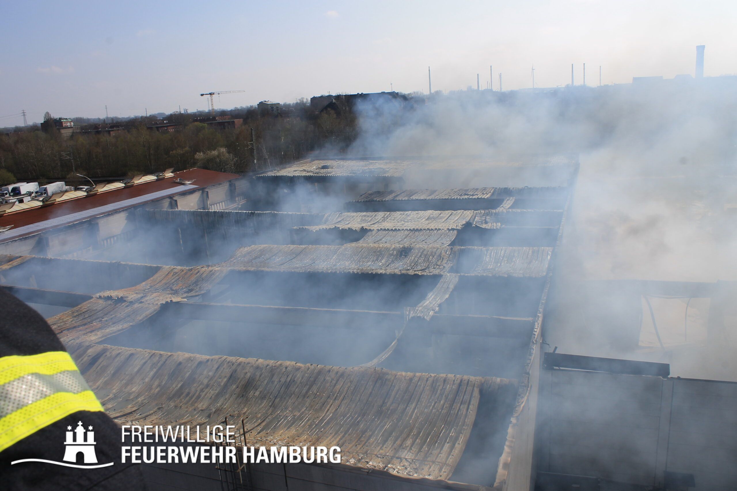 Bei einem Brand mehrerer Lagerhallen und von verschiedensten Waren auf großen Freiflächen in einem Gewerbegebiet kamen neben diversen Löschzügen und Sonderdiensten auch 54 FF und 12 Bereichsführer sowie der Landesbereichsführer der Freiwilligen Feuerwehr Hamburg über mehrere Tage zum Einsatz.