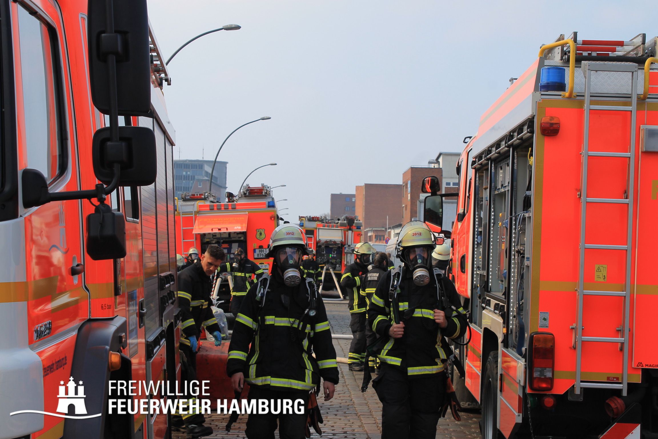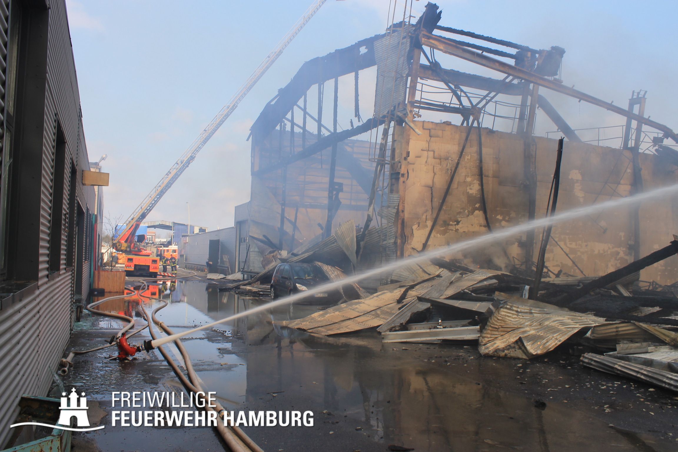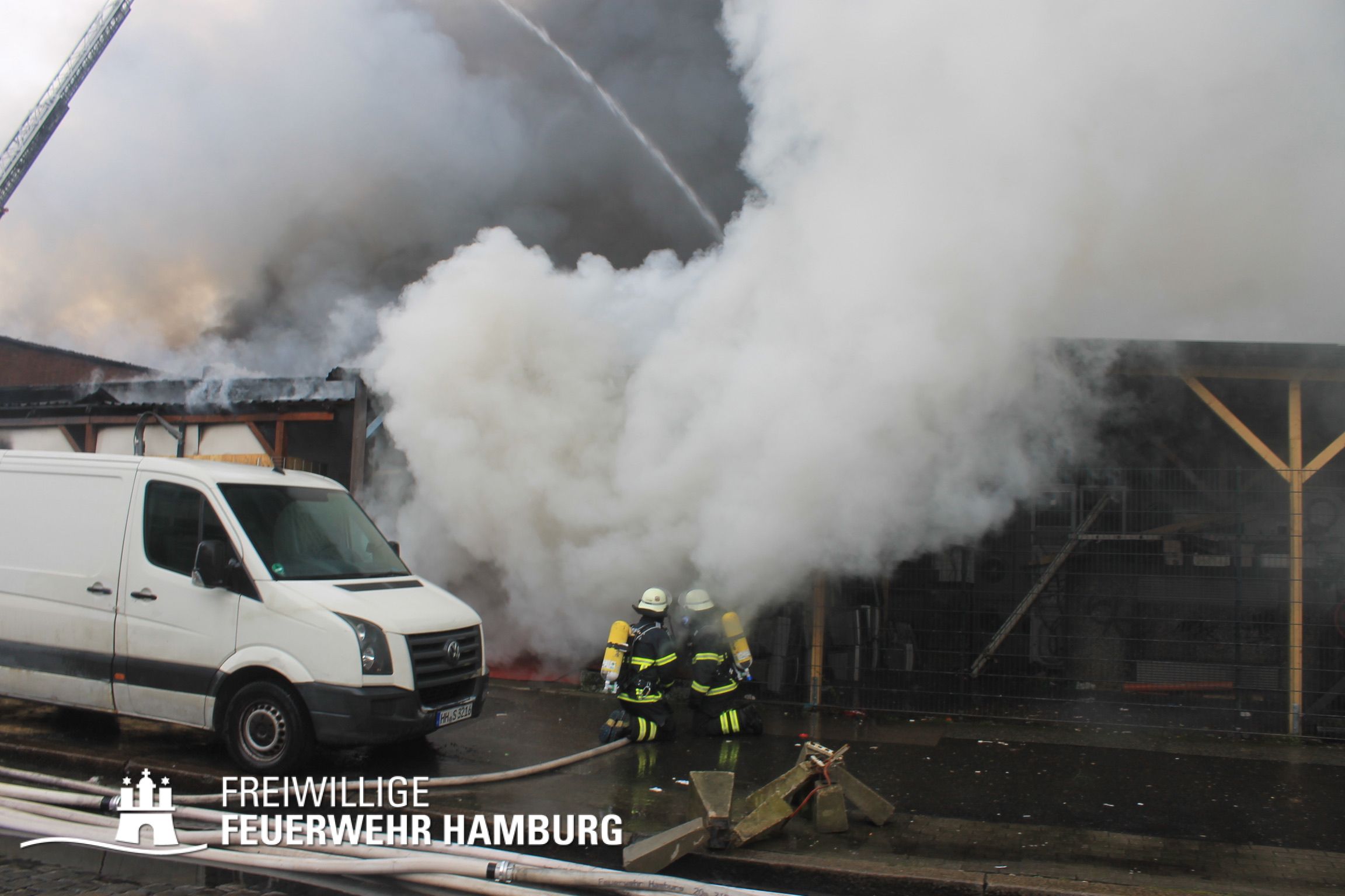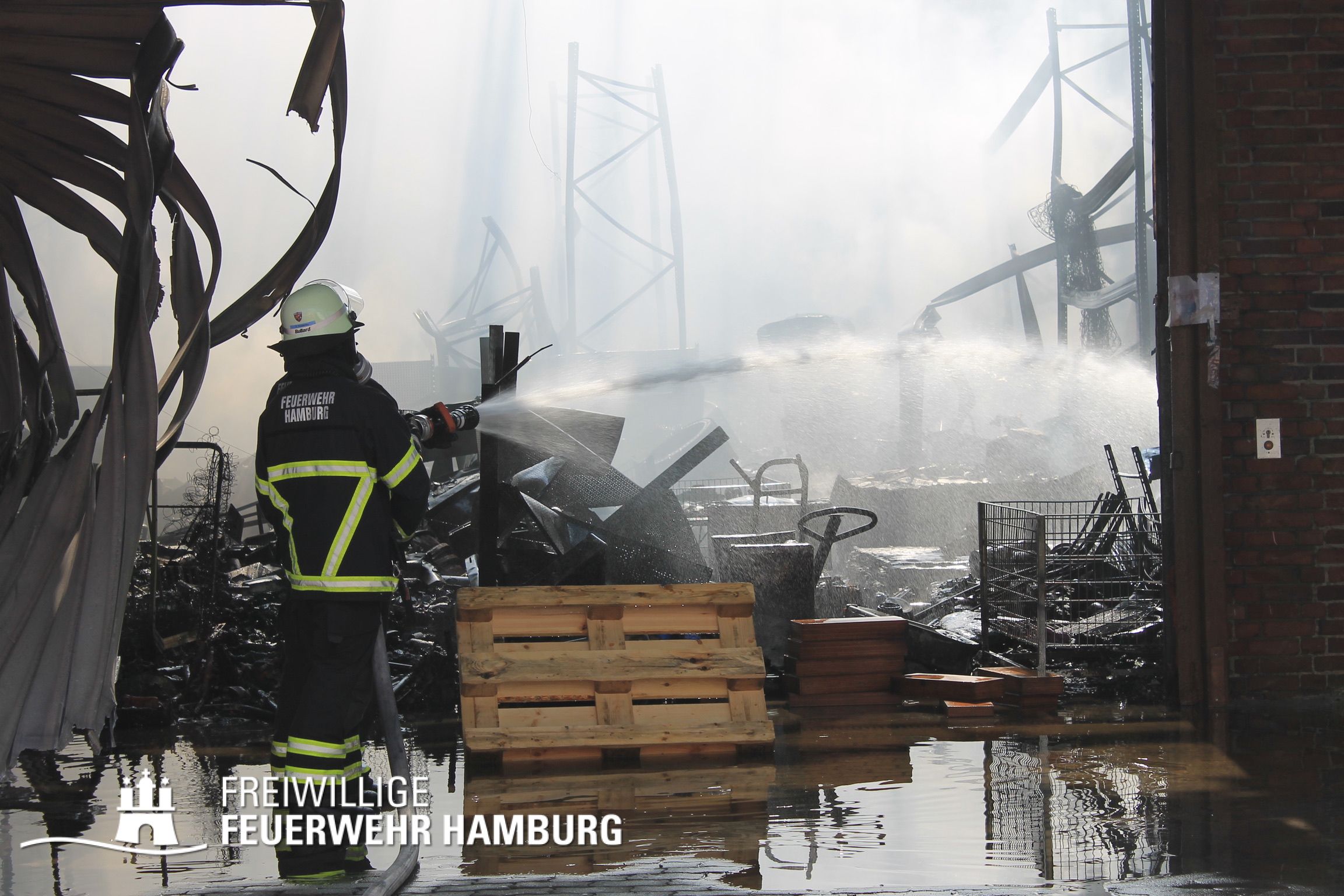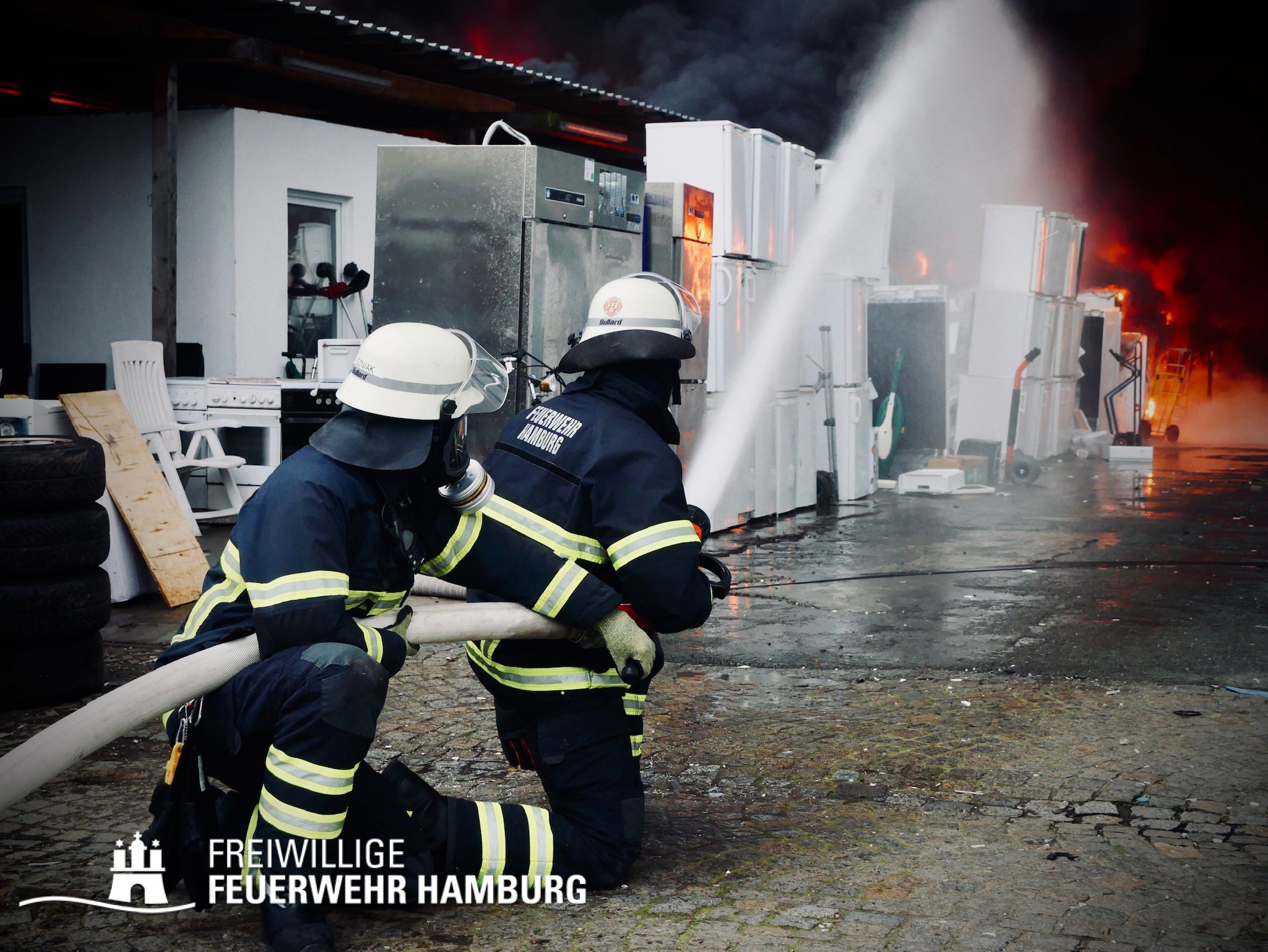 Bei einem Brand mehrerer Lagerhallen und von verschiedensten Waren auf großen Freiflächen in einem Gewerbegebiet kamen neben diversen Löschzügen und Sonderdiensten auch 54 FF und 12 Bereichsführer sowie der Landesbereichsführer der Freiwilligen Feuerwehr Hamburg über mehrere Tage zum Einsatz.