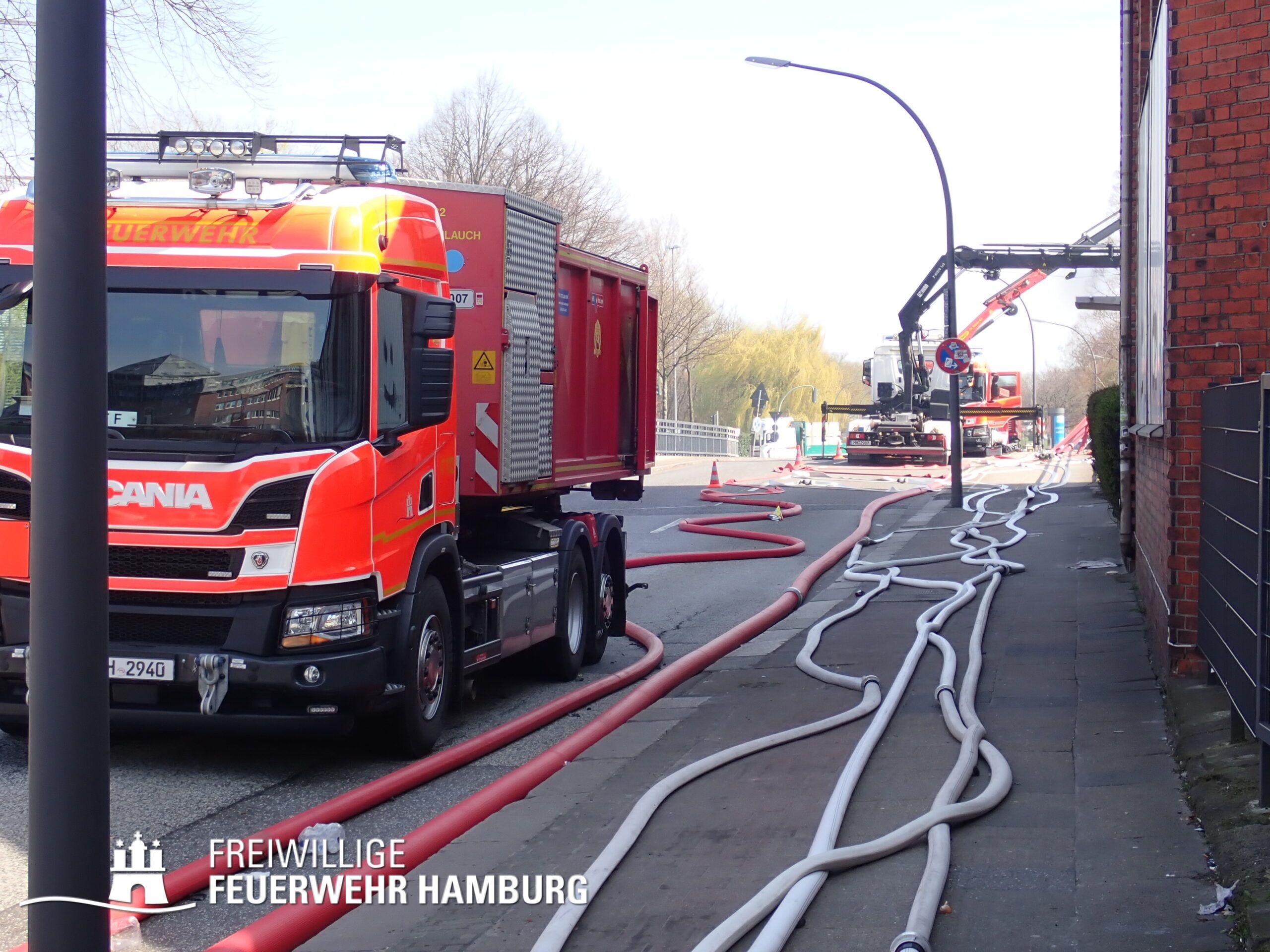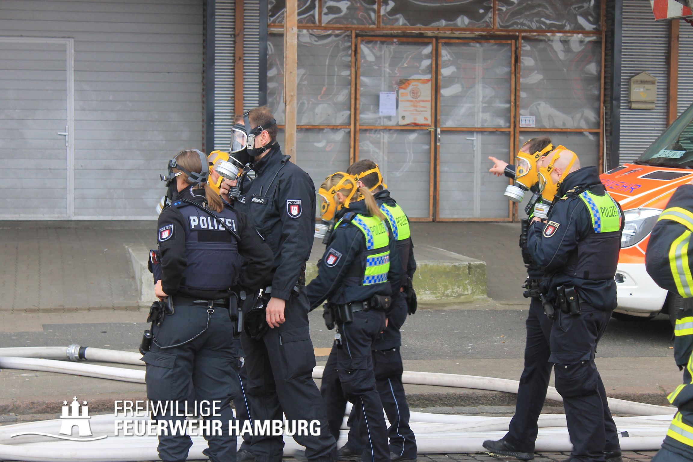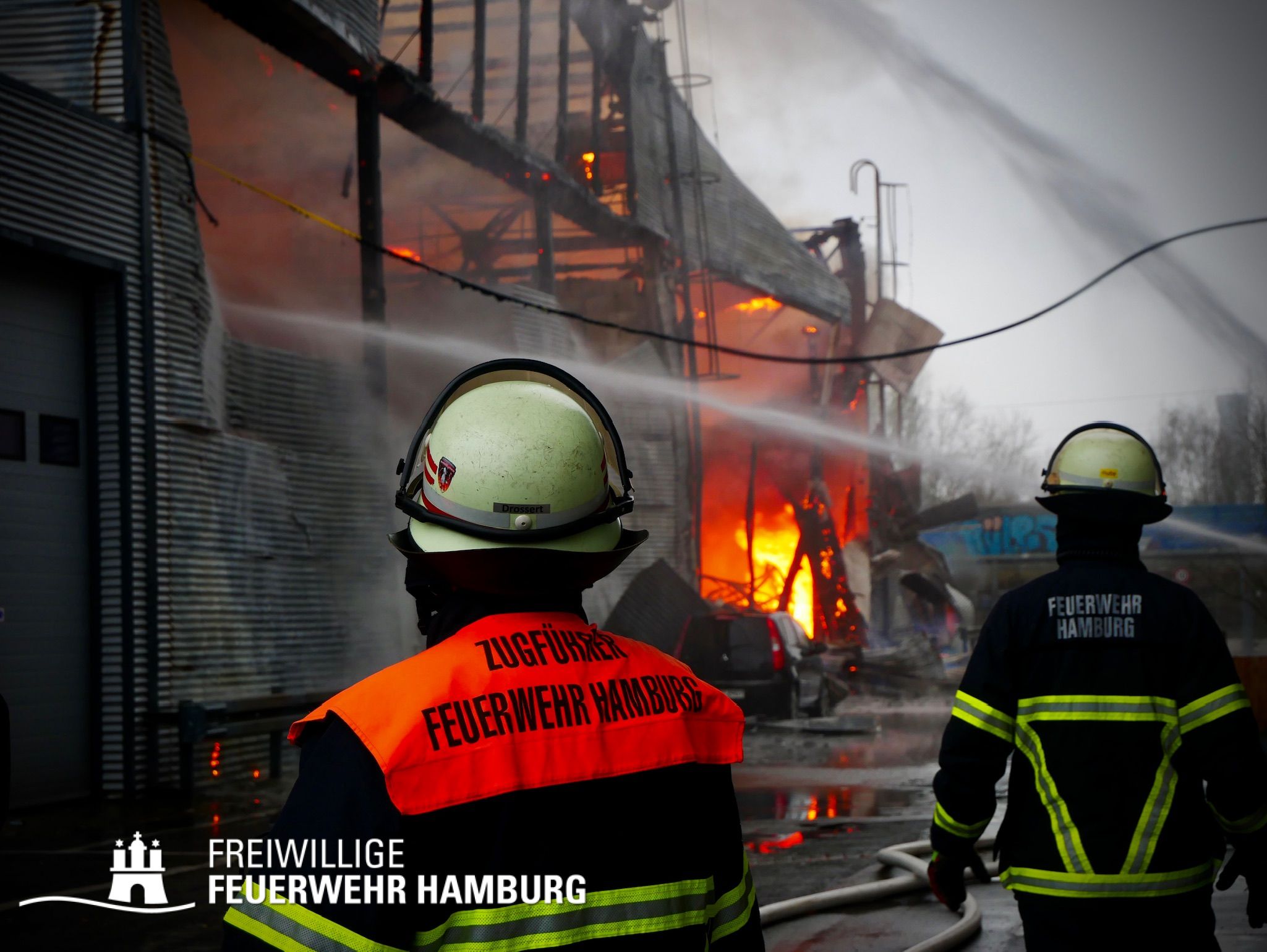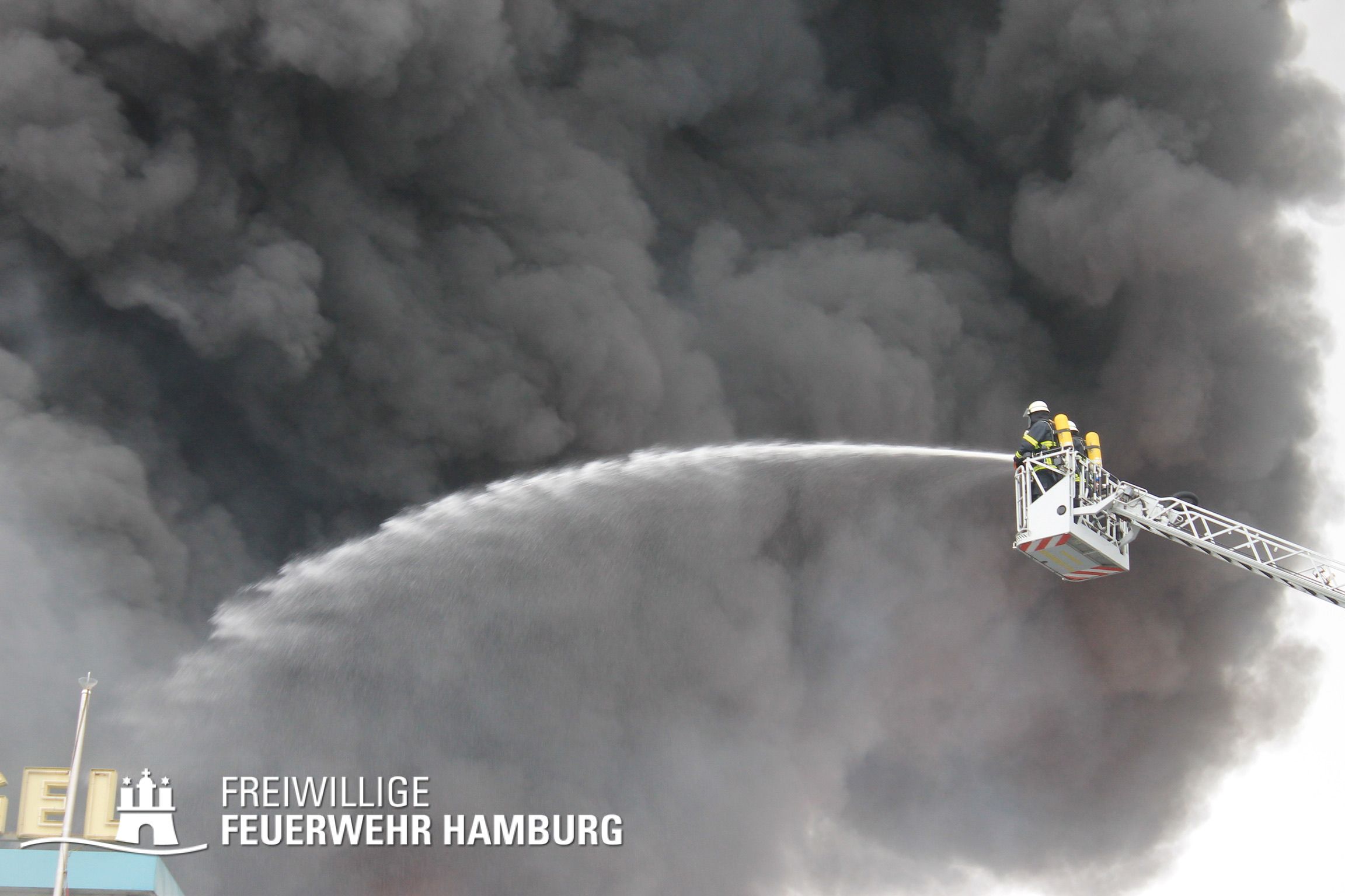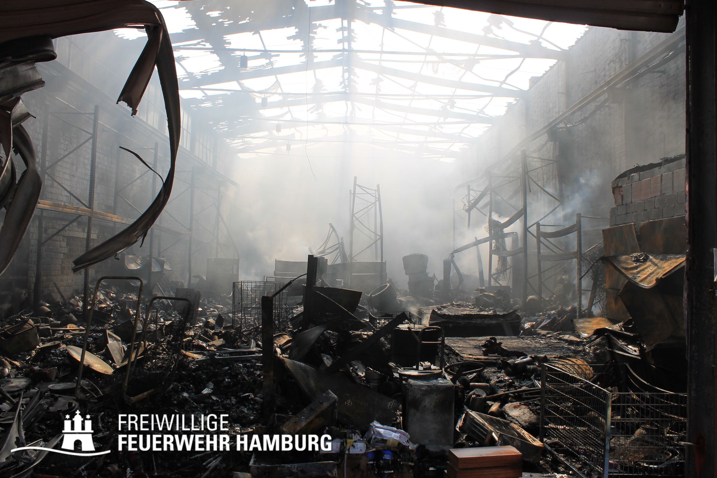 Bei einem Brand mehrerer Lagerhallen und von verschiedensten Waren auf großen Freiflächen in einem Gewerbegebiet kamen neben diversen Löschzügen und Sonderdiensten auch 54 FF und 12 Bereichsführer sowie der Landesbereichsführer der Freiwilligen Feuerwehr Hamburg über mehrere Tage zum Einsatz.