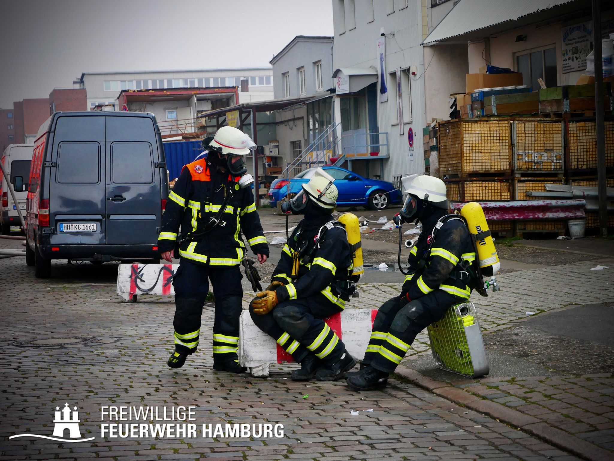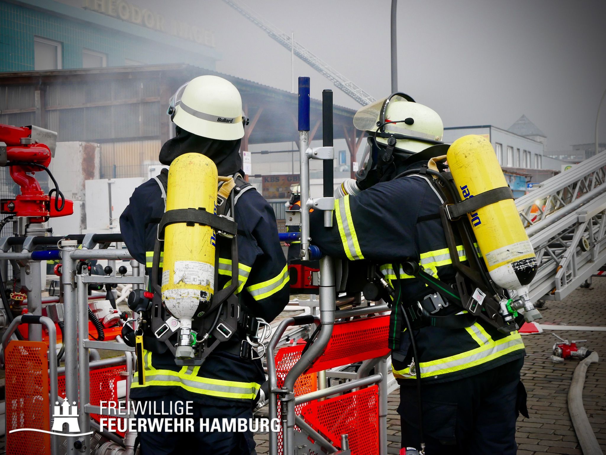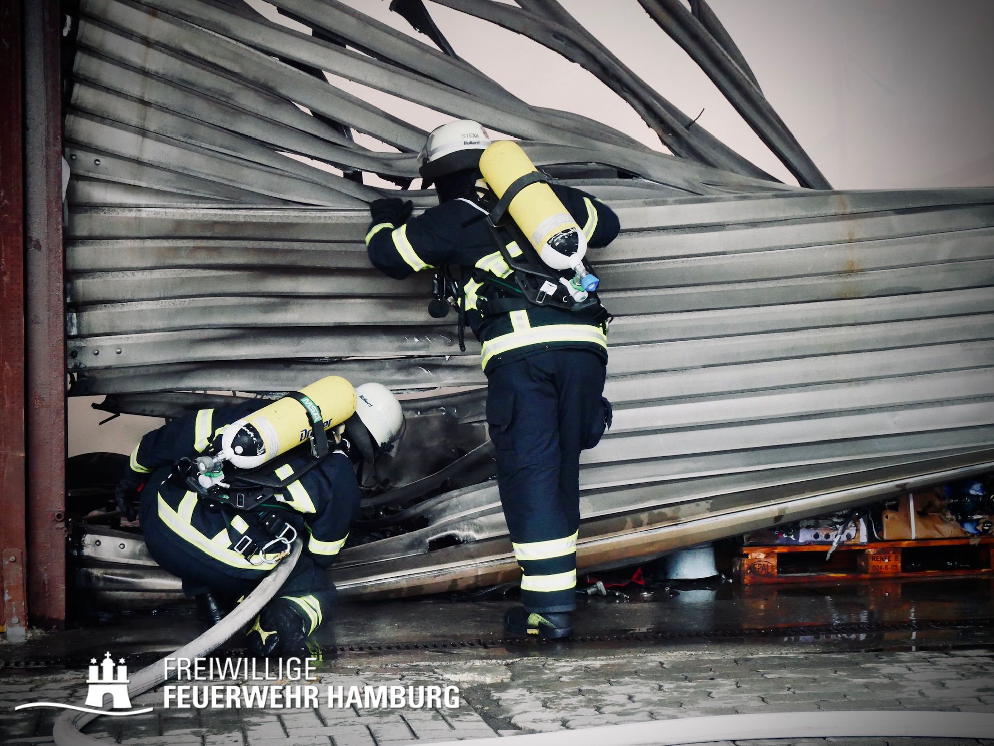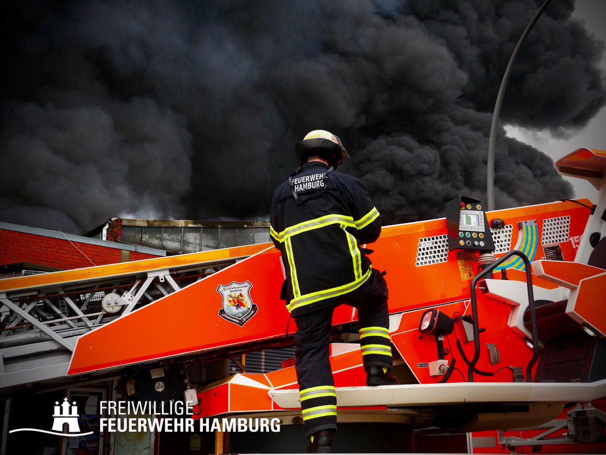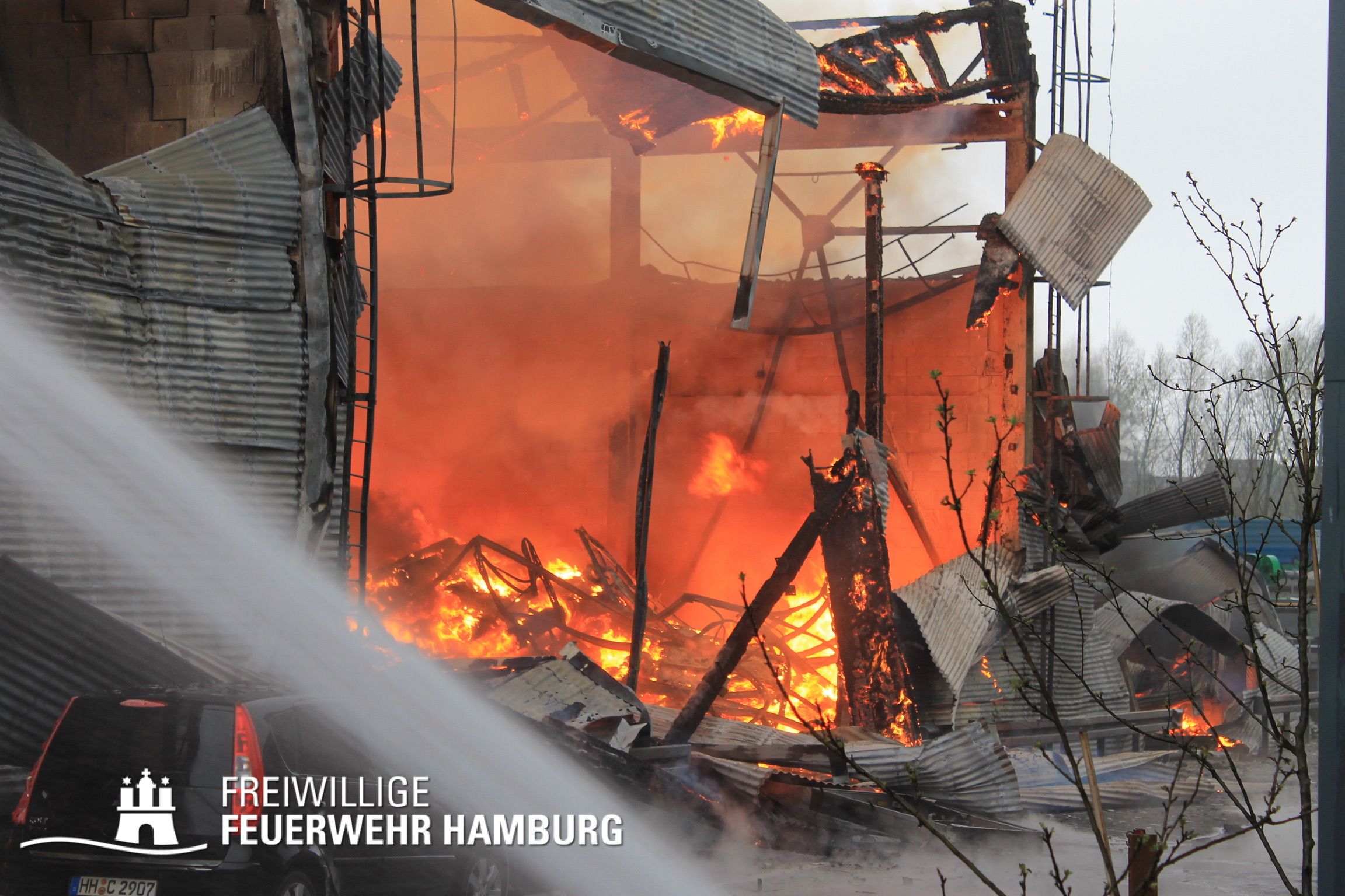 Bei einem Brand mehrerer Lagerhallen und von verschiedensten Waren auf großen Freiflächen in einem Gewerbegebiet kamen neben diversen Löschzügen und Sonderdiensten auch 54 FF und 12 Bereichsführer sowie der Landesbereichsführer der Freiwilligen Feuerwehr Hamburg über mehrere Tage zum Einsatz.