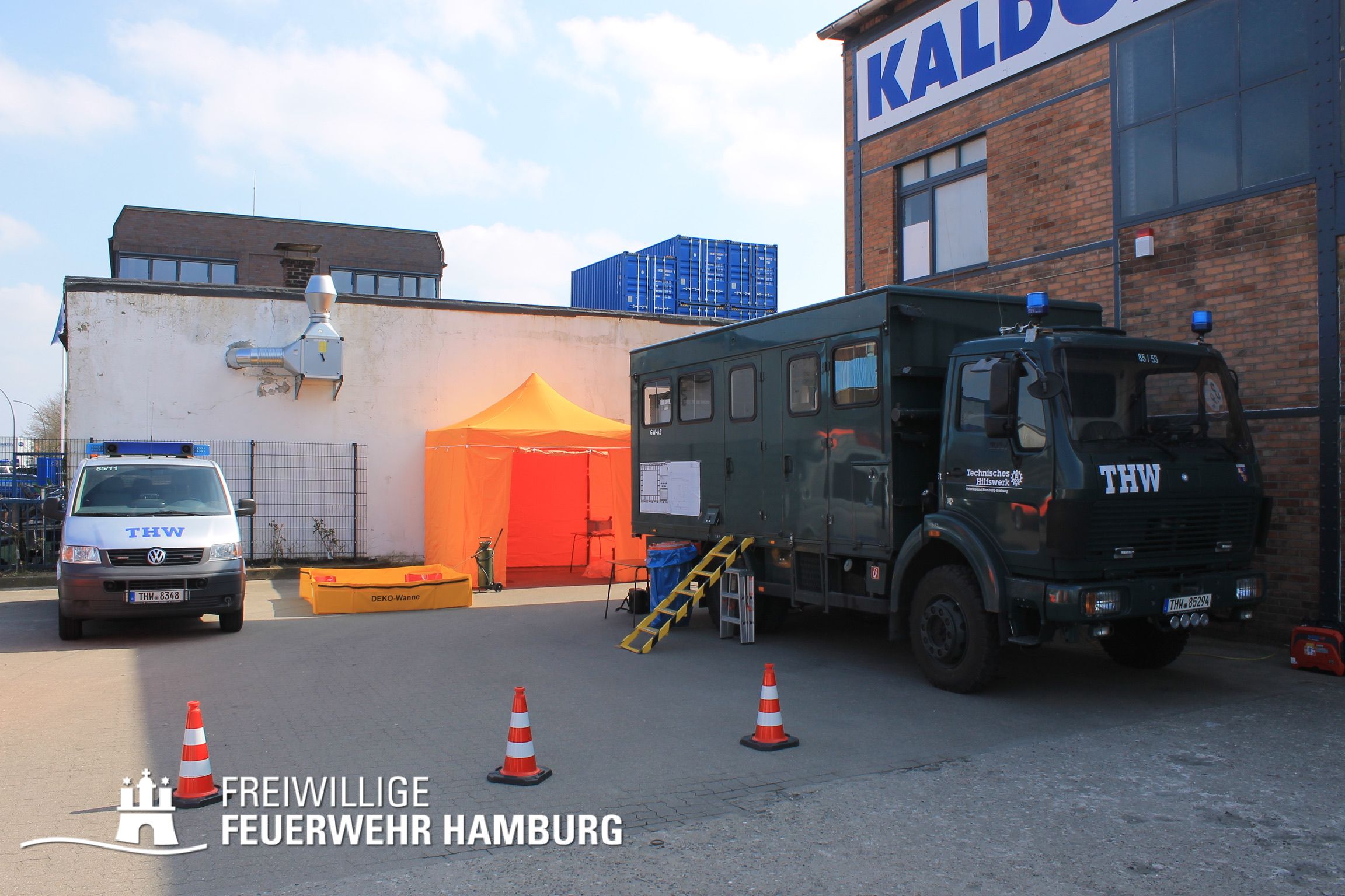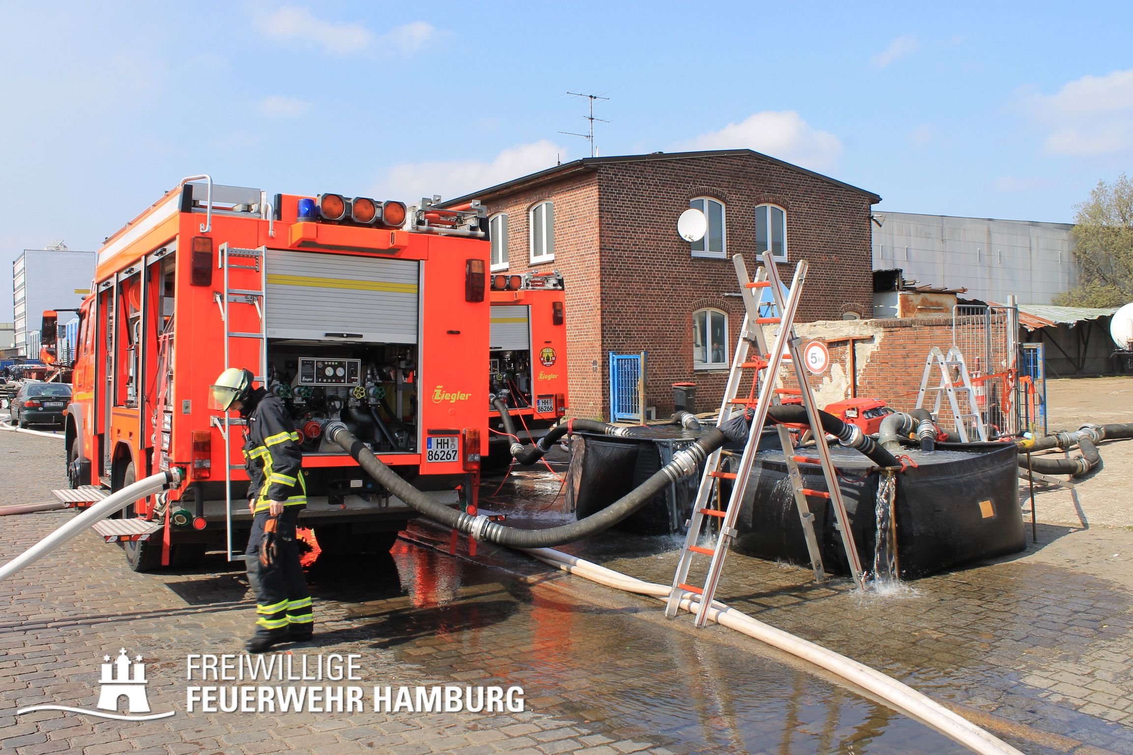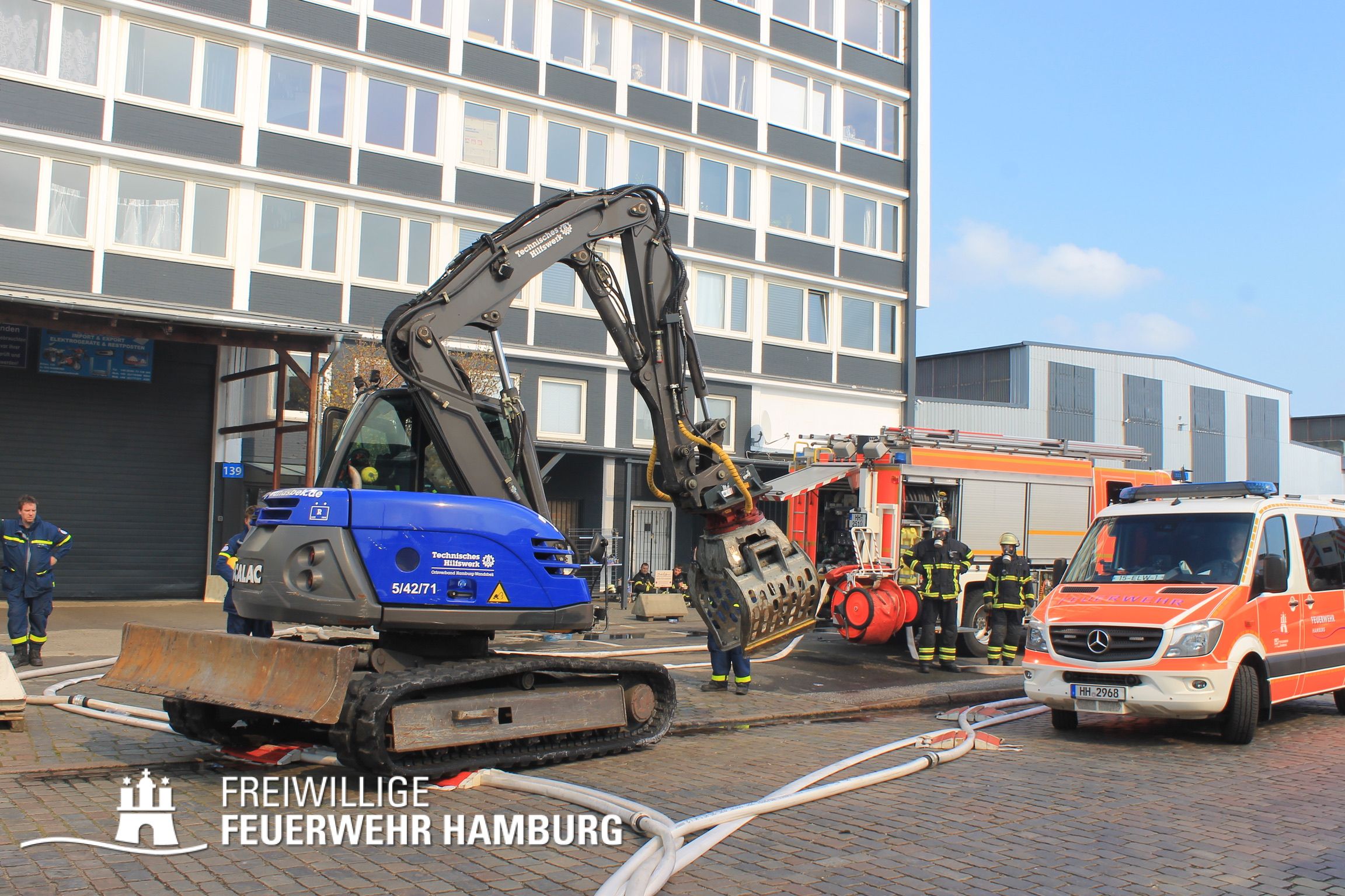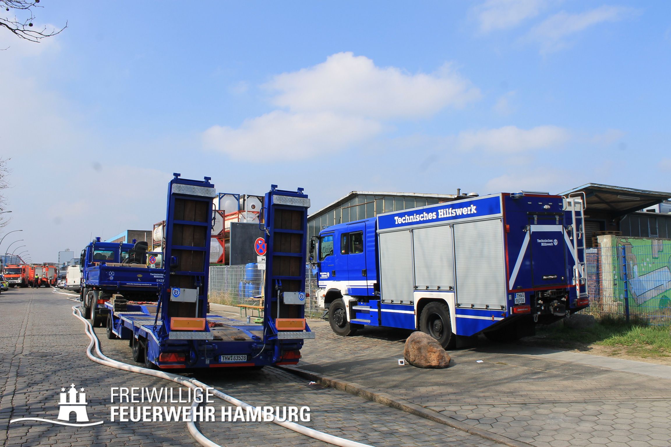 Das Technische Hilfswerk sorgte mit Radlader und Bagger dafür Schutt zu räumen und auseinander zu ziehen. Außerdem sorgten sie mit Hochleistungspumpen für Wasserförderung aus der Bille und versorgten Pufferbehälter mit Wasser. Über Tragkraftspritzen wurde dann das Wasser durch Einheiten der FF an die Einsatzstelle befördert. Auch die Technik und Umweltwache der Berufsfeuerwehr sorgte mit ihren Großpumpen (Grindex-TAuchpumpen) für reichlich Löschwasser.