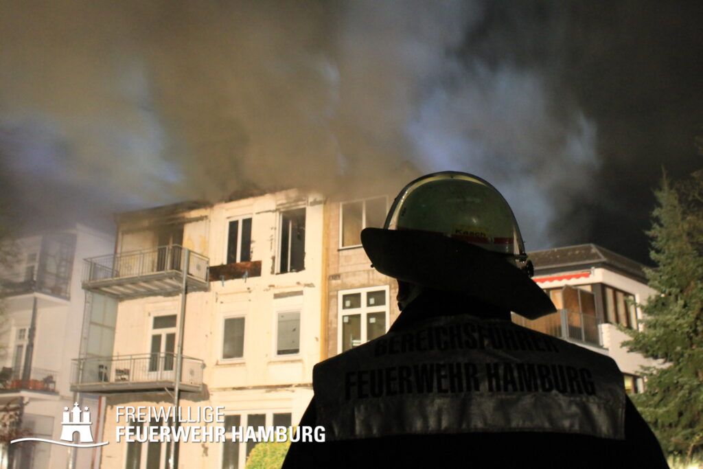 Am Mittwochabend wurde die Freiwillige Feuerwehr Winterhude und der Löschzug der Feuer und Rettungswache Barmbek in die Klärchenstraße im Stadtteil Winterhude gerufen. In einem Mehrfamilienhaus, welches gerade saniert wird, haben Anwohner eine Verrauchung im Dachbereich gemeldet. Als die ersten Einsatzkräfte an der Einsatzstelle eintrafen, brannte es im Dachgeschoss eines dreigeschossigen Mehrfamilienhauses. Vor Ort wurde den Einsatzkräften mitgeteilt, dass sich möglicherweise noch Personen im Gefahrenbereich aufhalten könnten. Durch diese Information und um eine Brandausbreitung auf angrenzende Gebäude zu verhindern, erhöhte der Einsatzleiter die Alarmstufe auf FEU2Y („Feuer, zwei Löschzüge, mit Menschenleben in Gefahr“). Im Verlauf des ersten Angriffs stellte sich heraus das keine Personen im Gebäude waren.