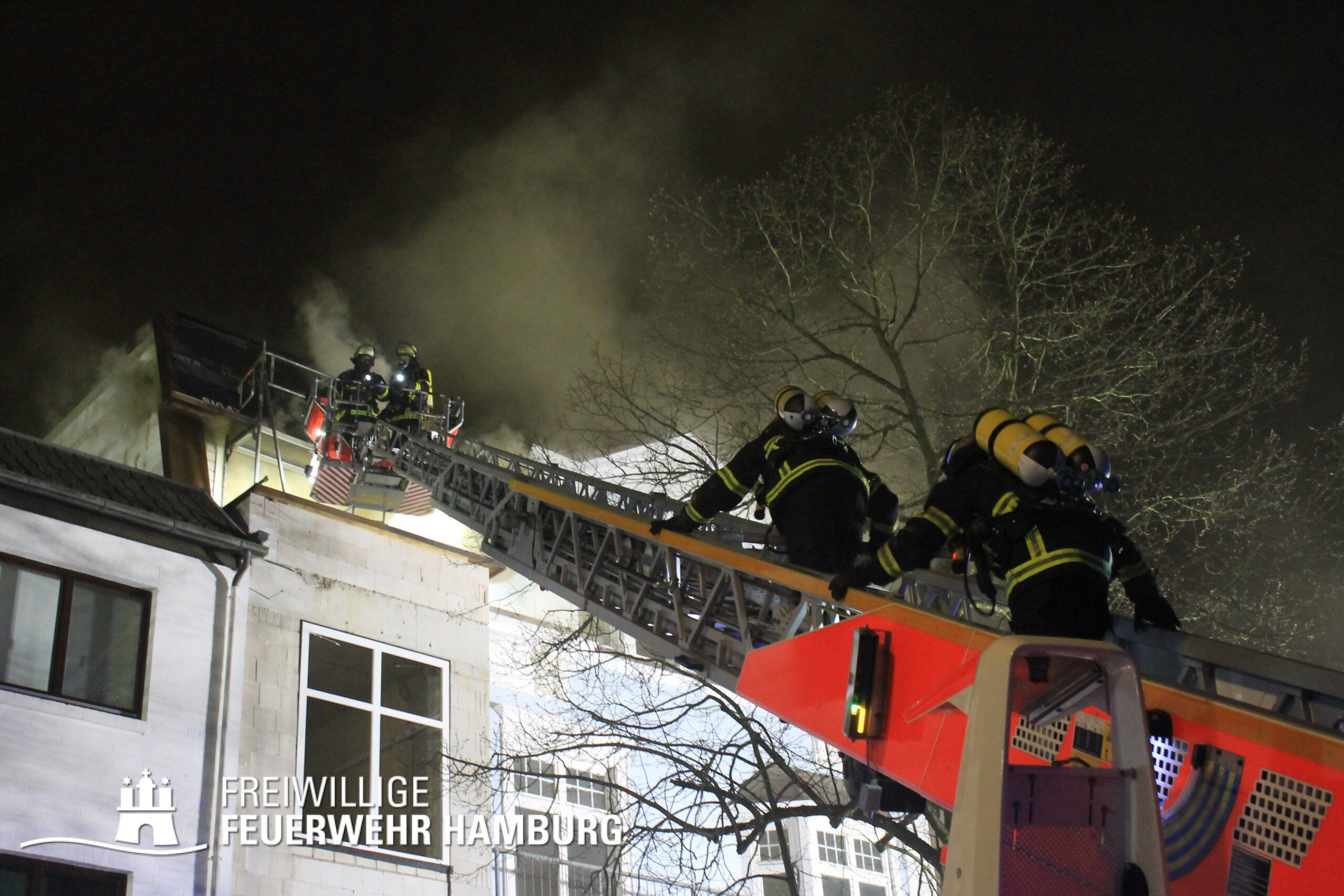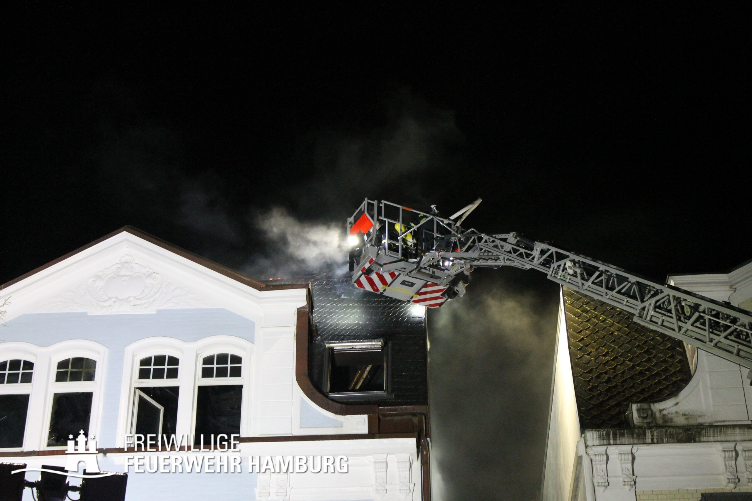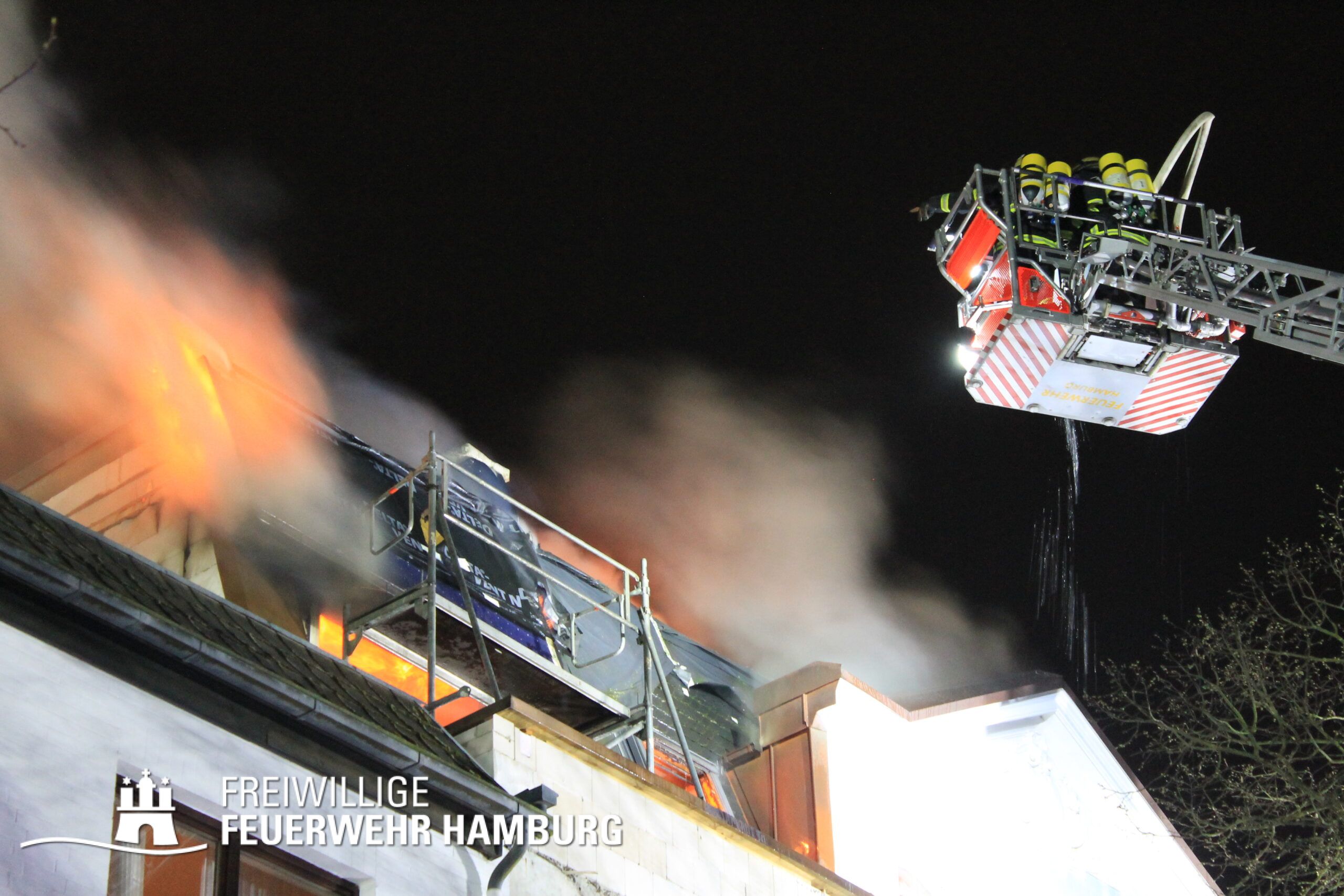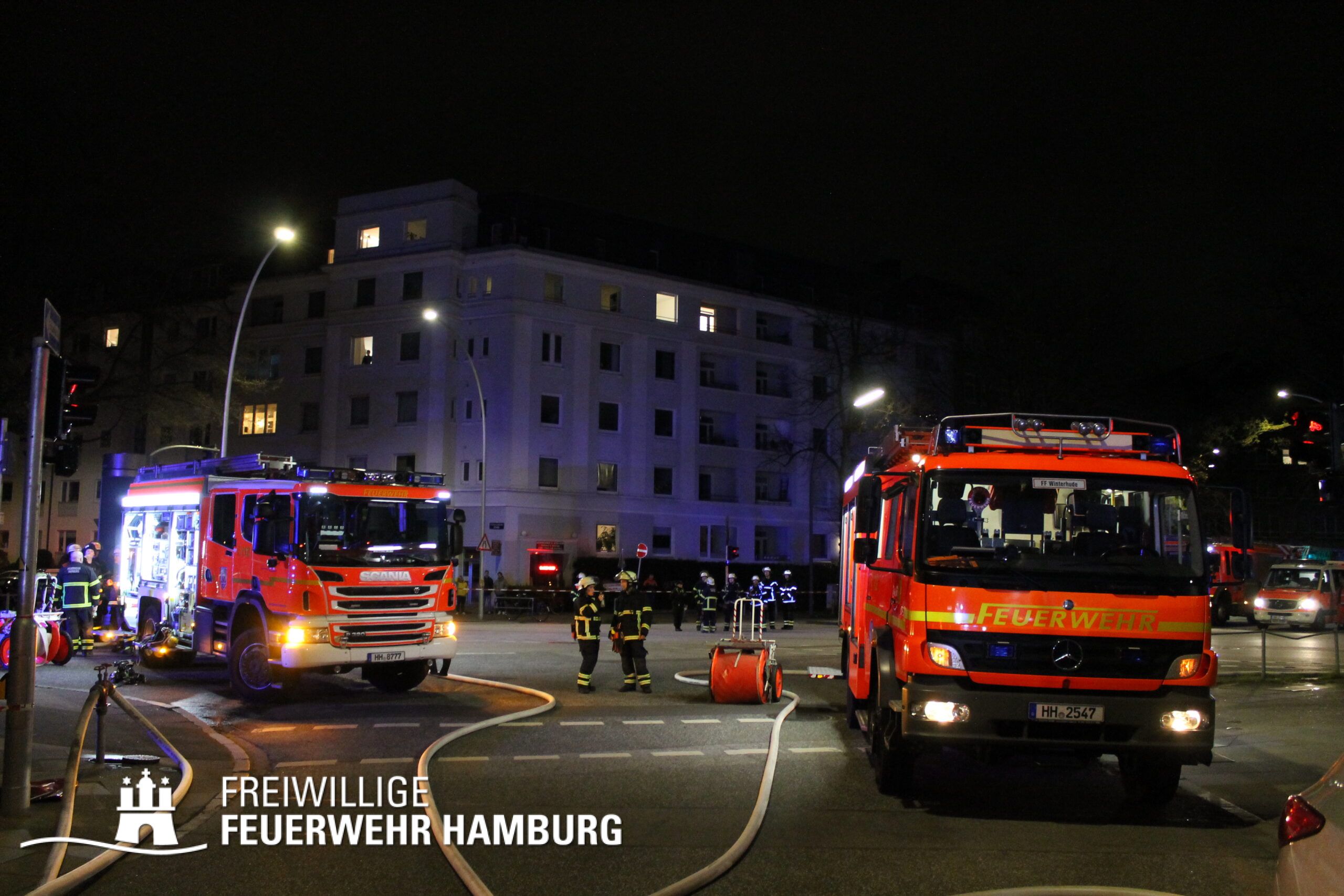 Am Mittwochabend wurde die Freiwillige Feuerwehr Winterhude und der Löschzug der Feuer und Rettungswache Barmbek in die Klärchenstraße im Stadtteil Winterhude gerufen. In einem Mehrfamilienhaus, welches gerade saniert wird, haben Anwohner eine Verrauchung im Dachbereich gemeldet. Als die ersten Einsatzkräfte an der Einsatzstelle eintrafen, brannte es im Dachgeschoss eines dreigeschossigen Mehrfamilienhauses. Vor Ort wurde den Einsatzkräften mitgeteilt, dass sich möglicherweise noch Personen im Gefahrenbereich aufhalten könnten. Durch diese Information und um eine Brandausbreitung auf angrenzende Gebäude zu verhindern, erhöhte der Einsatzleiter die Alarmstufe auf FEU2Y („Feuer, zwei Löschzüge, mit Menschenleben in Gefahr“). Im Verlauf des ersten Angriffs stellte sich heraus das keine Personen im Gebäude waren.