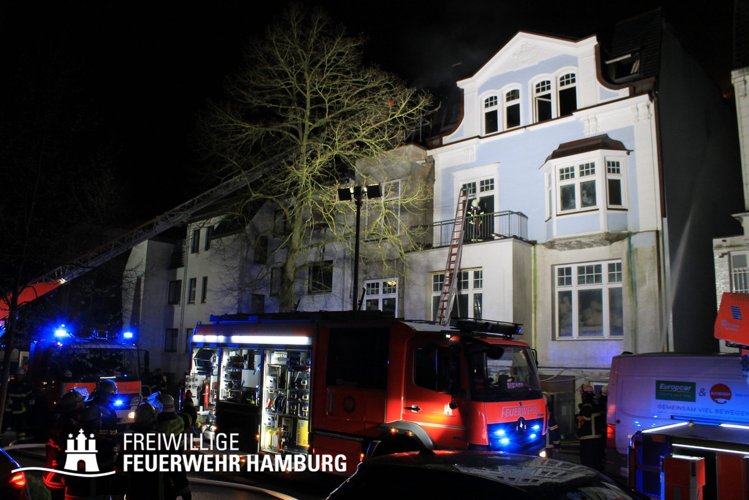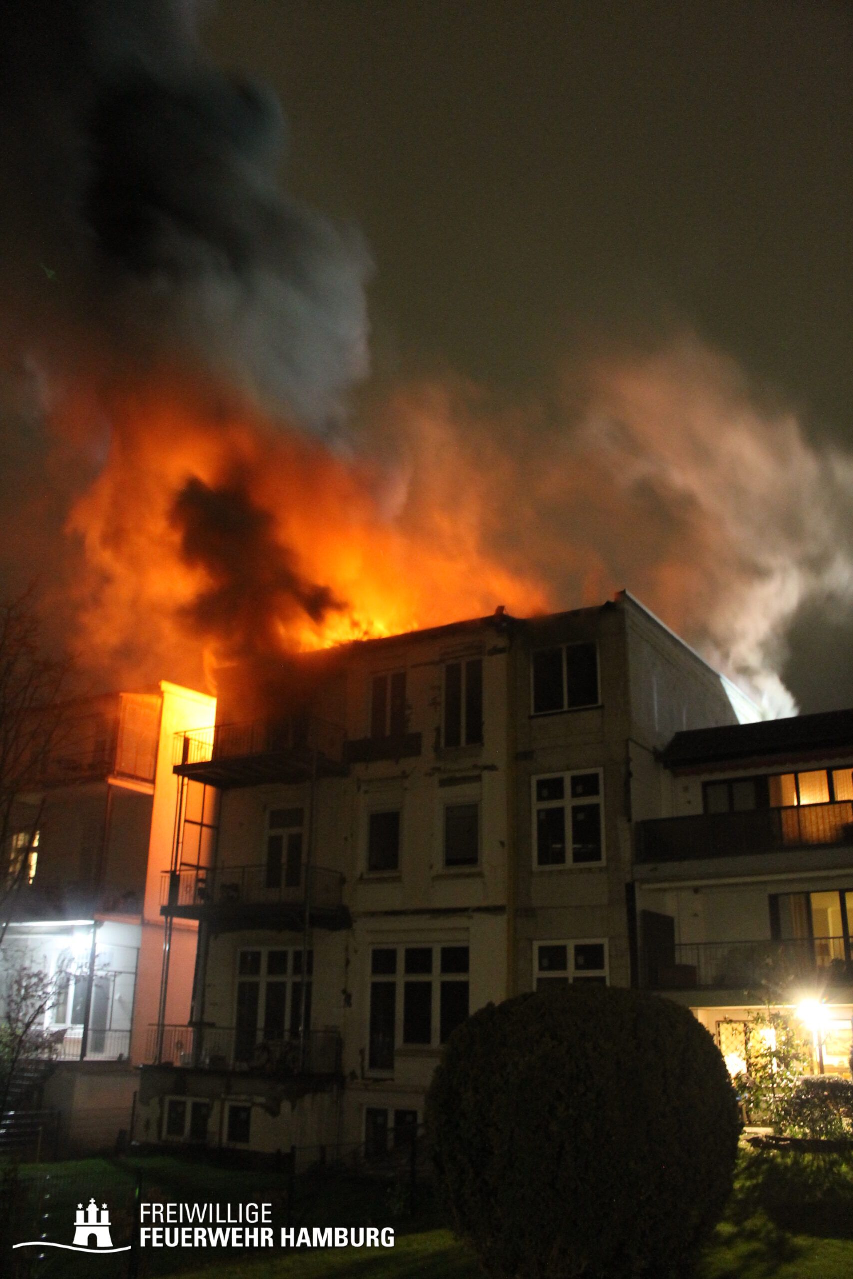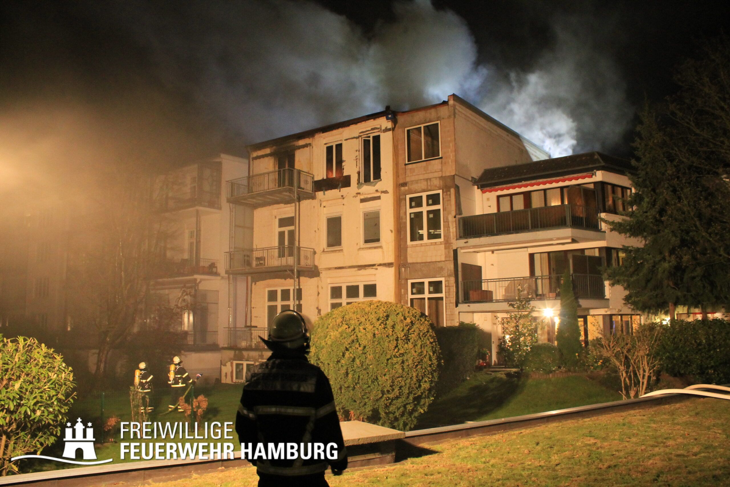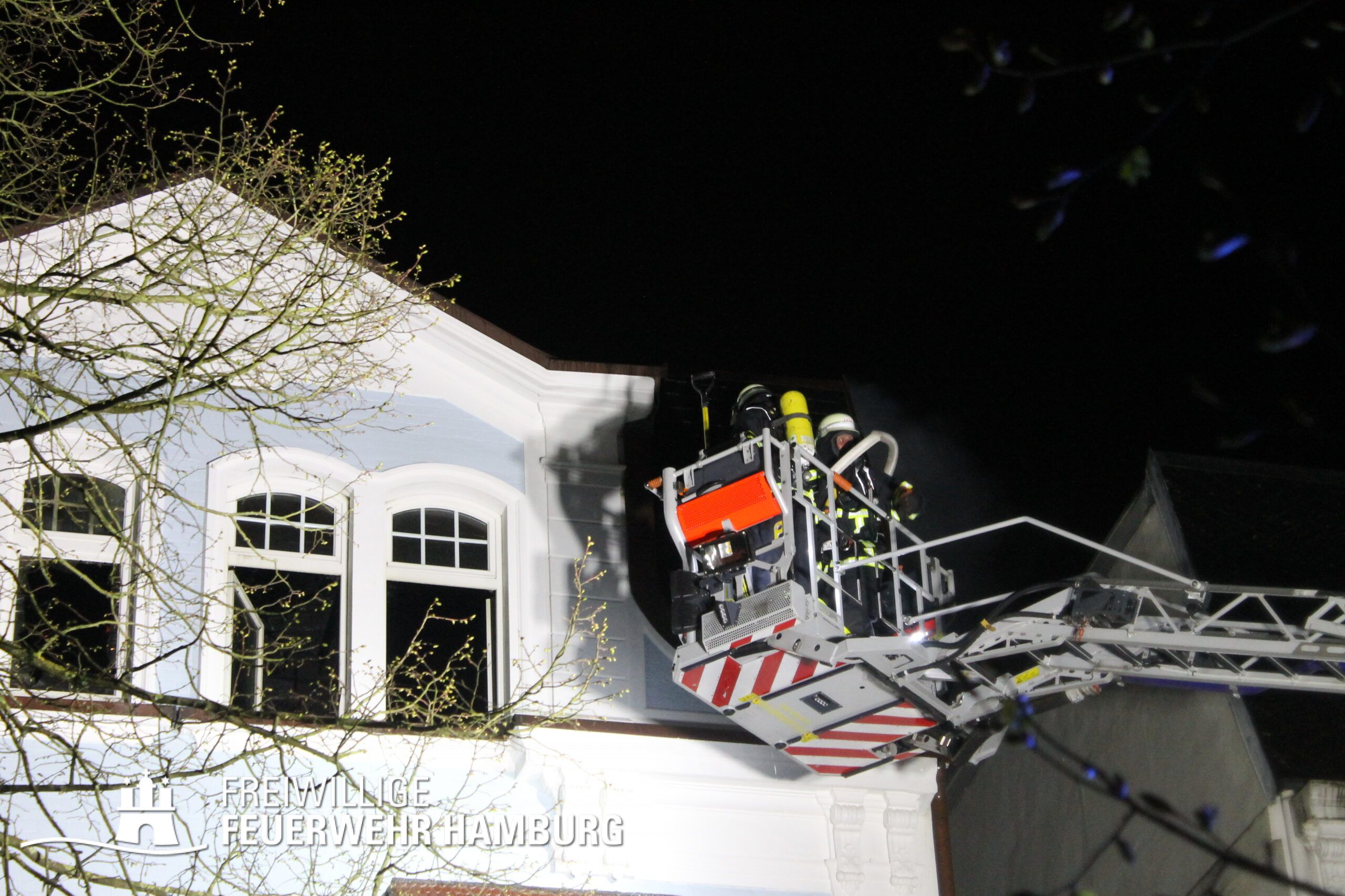 Am Mittwochabend wurde die Freiwillige Feuerwehr Winterhude und der Löschzug der Feuer und Rettungswache Barmbek in die Klärchenstraße im Stadtteil Winterhude gerufen. In einem Mehrfamilienhaus, welches gerade saniert wird, haben Anwohner eine Verrauchung im Dachbereich gemeldet. Als die ersten Einsatzkräfte an der Einsatzstelle eintrafen, brannte es im Dachgeschoss eines dreigeschossigen Mehrfamilienhauses. Vor Ort wurde den Einsatzkräften mitgeteilt, dass sich möglicherweise noch Personen im Gefahrenbereich aufhalten könnten. Durch diese Information und um eine Brandausbreitung auf angrenzende Gebäude zu verhindern, erhöhte der Einsatzleiter die Alarmstufe auf FEU2Y („Feuer, zwei Löschzüge, mit Menschenleben in Gefahr“). Im Verlauf des ersten Angriffs stellte sich heraus das keine Personen im Gebäude waren.