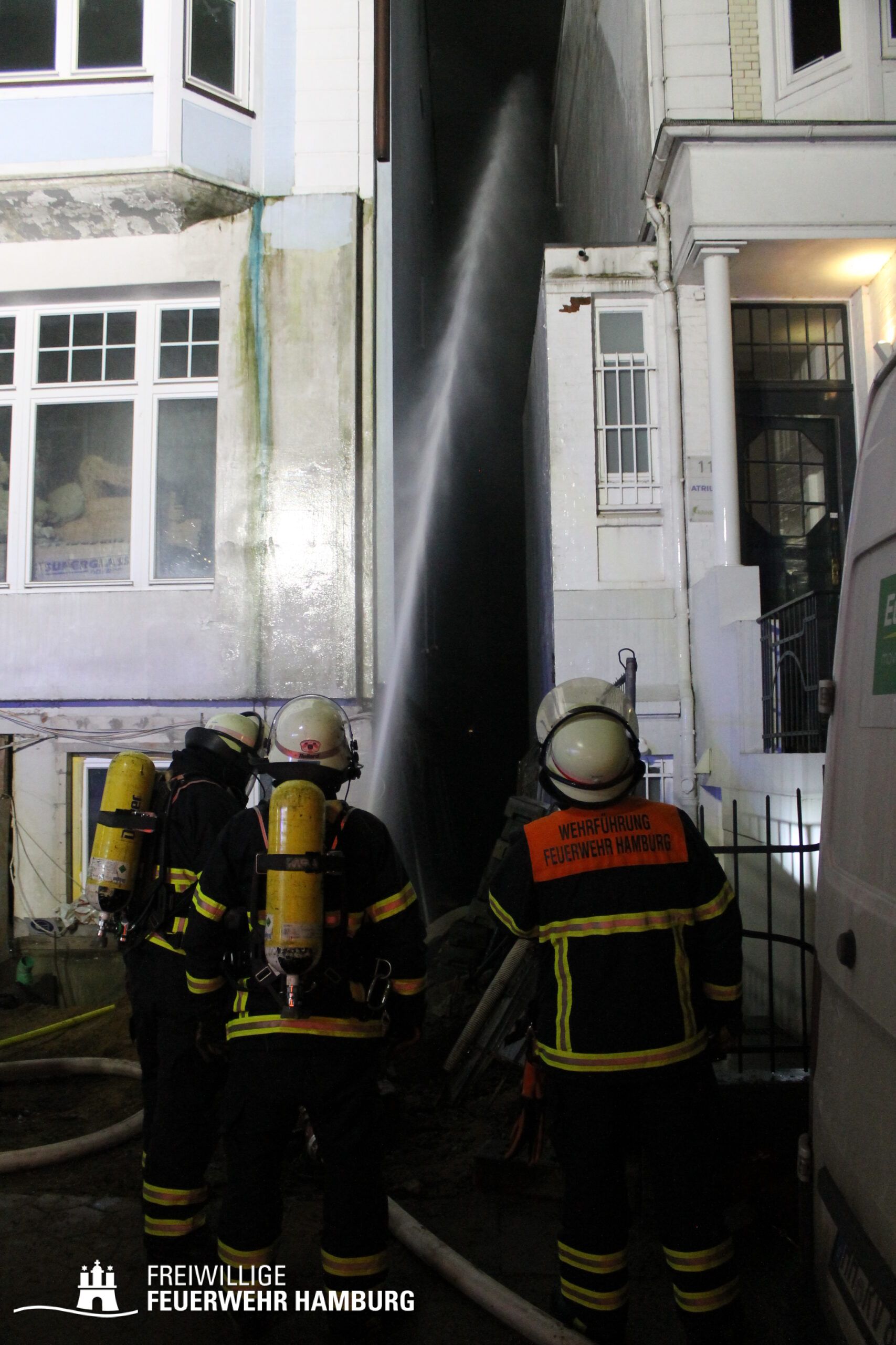 Auf der Gebäuderückseite wurden mittels 2 B-Rohren und einem C-Rohr eine Riegelstellung zu den Nachbargebäuden aufgebaut, hier unterstützten die FF Winterhude und FF Lokstedt bei der Brandbekämpfung. Auf der Vorderseite des Gebäudes konnte über ein weiteres B-Rohr ebenfalls eine Riegelstellung aufgebaut werden, welches durch die FF Alsterdorf besetzt wurde. Weiterhin setzte die FF Winterhude und die FF Alsterdorf mehrere Trupps unter Atemschutz mit 2 C-Rohren im Innengriff ein. Die FF Lokstedt unterstützte bei der Brandbekämpfung über eine Drehleiter ebenfalls mit 2 C-Rohren.